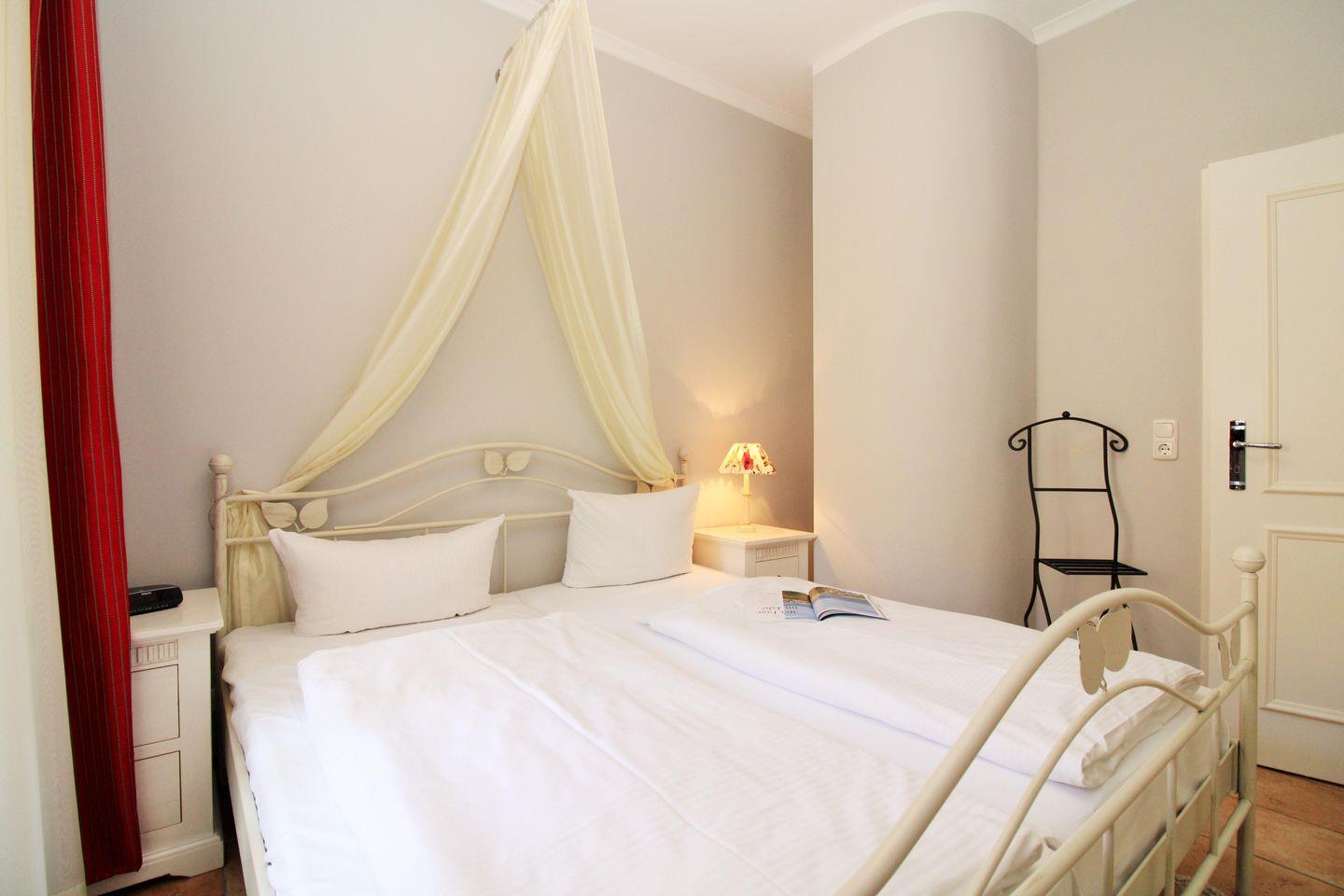 Das zusätzliche 2. Schlafzimmer mit direktem Blick auf die Ostsee verfügt über eine ausziehbare Schlafcouch, einen Kleiderschrank und ein kleines Regal.