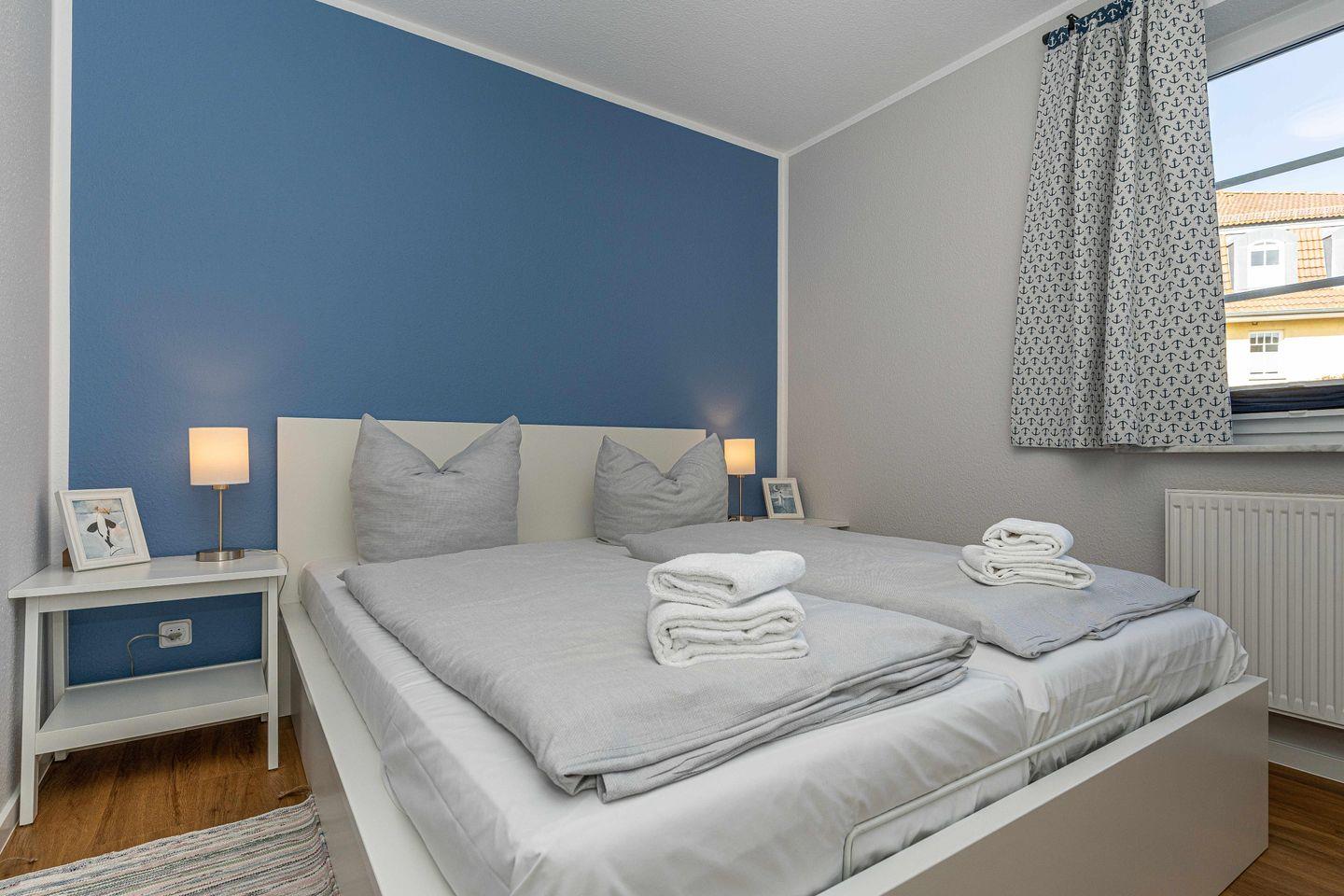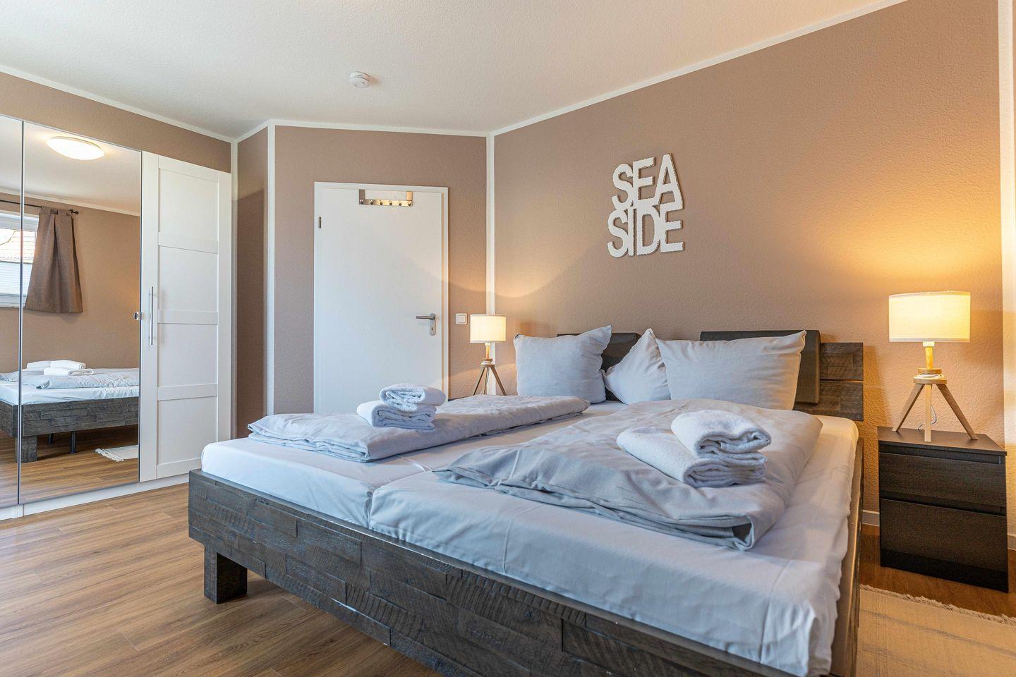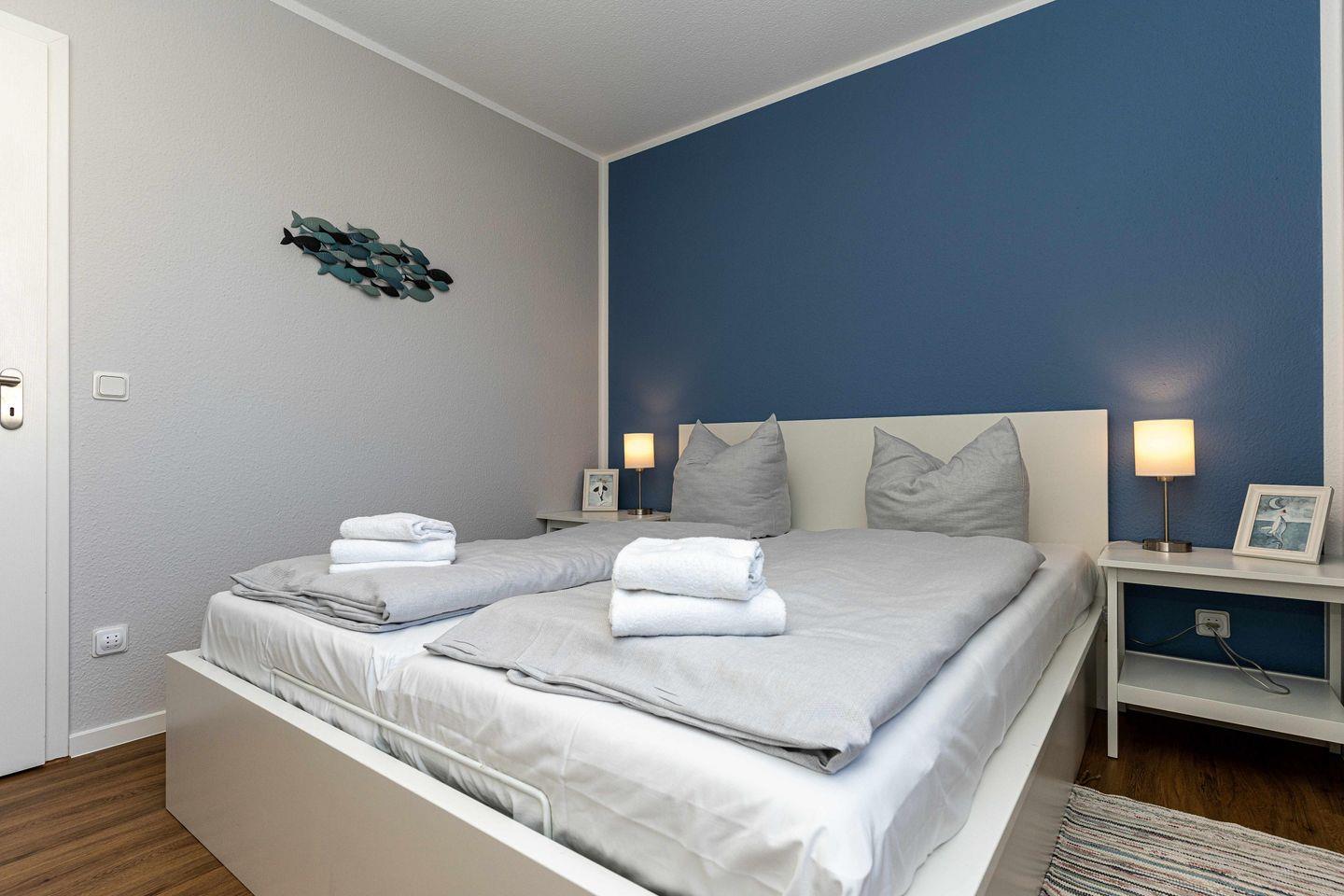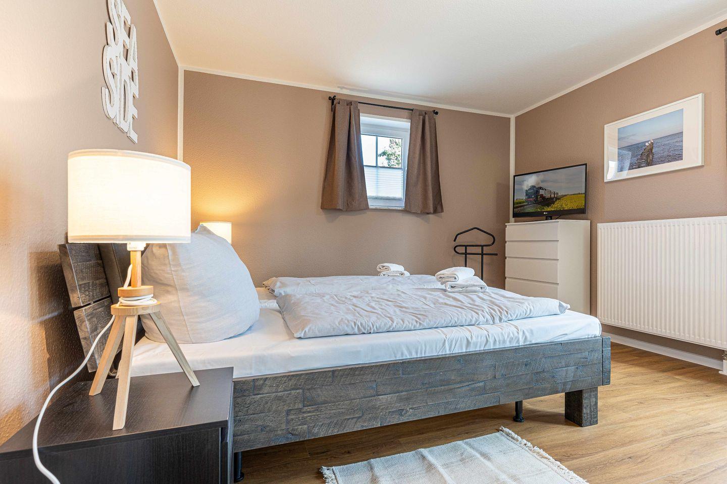 Das geräumige, moderne und dennoch sehr gemütliche 1. Schlafzimmer ist mit einem bequemen Doppelbett, Nachttischen, einem großen Kleiderschrank sowie einem weiteren TV-Gerät eingerichtet.