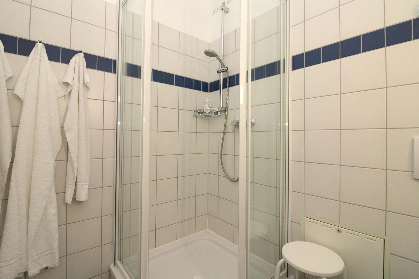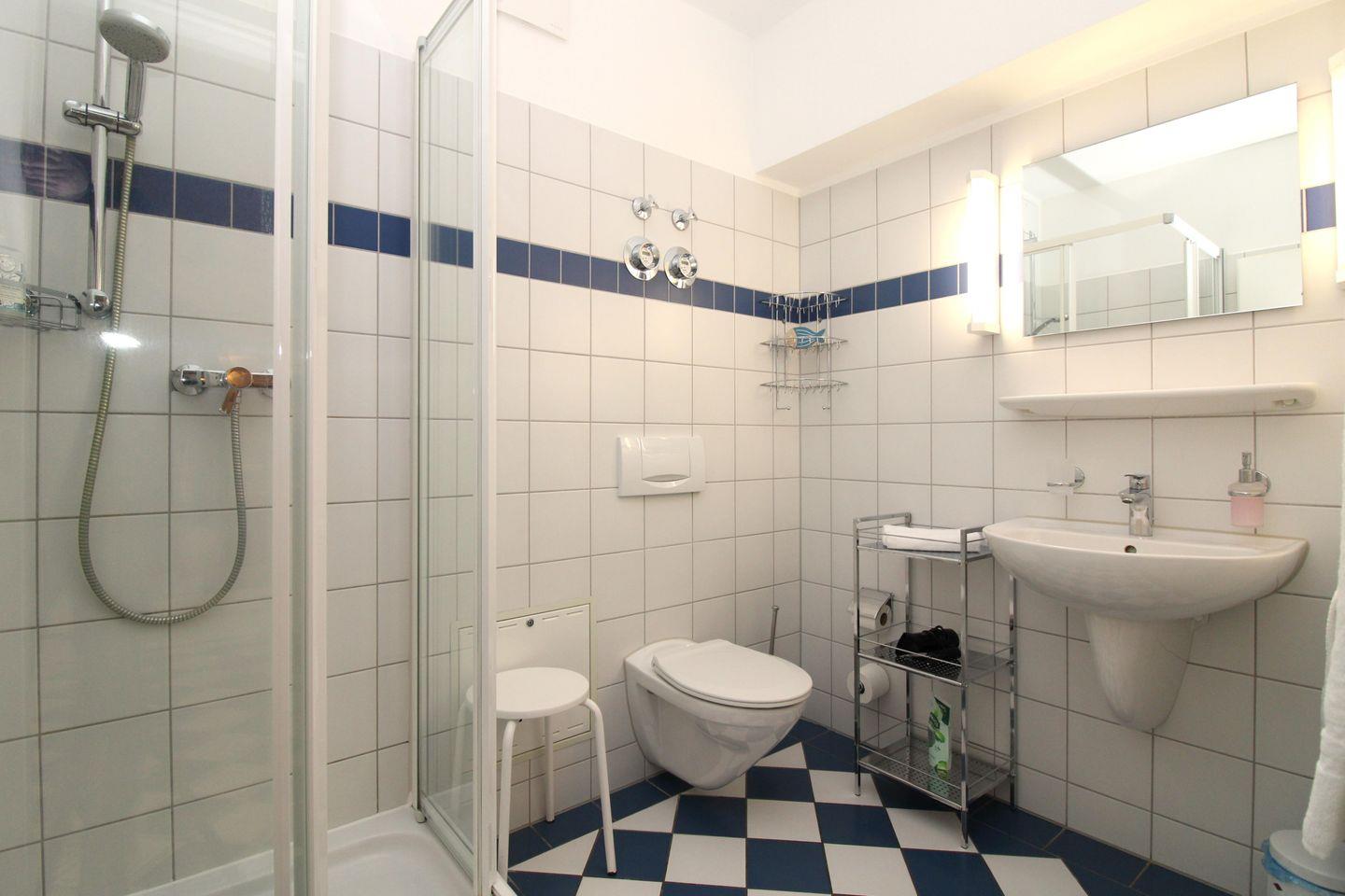 Das freundliche Badezimmer verfügt über eine Dusche, Waschbecken, Kosmetikspiegel, Föhn, WC, Handtuch-Heizkörper sowie ausreichend Ablagemöglichkeiten.
