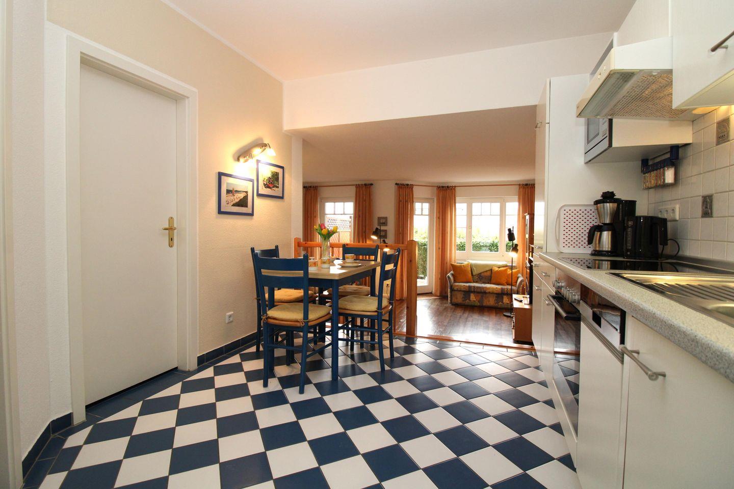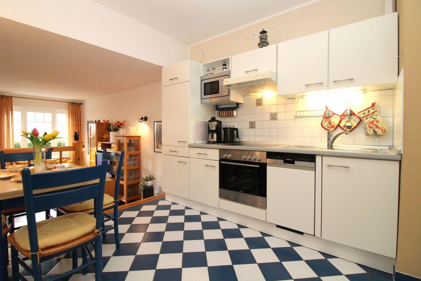 Der offene Küchen- und Essbereich mit einem separaten Esstisch und 4 Stühlen beinhaltet eine voll ausgestattete Einbauküchenzeile mit 4-Zonen-Ceran-Kochfeld, Backofen, Dunstabzug, Mikrowelle, Kühlschrank mit Gefrierfach, Geschirrspülmaschine, Kaffeemaschine, Wasserkocher und Toaster. Die Küche ist mit Geschirr, Gläsern, Besteck und Töpfen komplett ausgestattet.