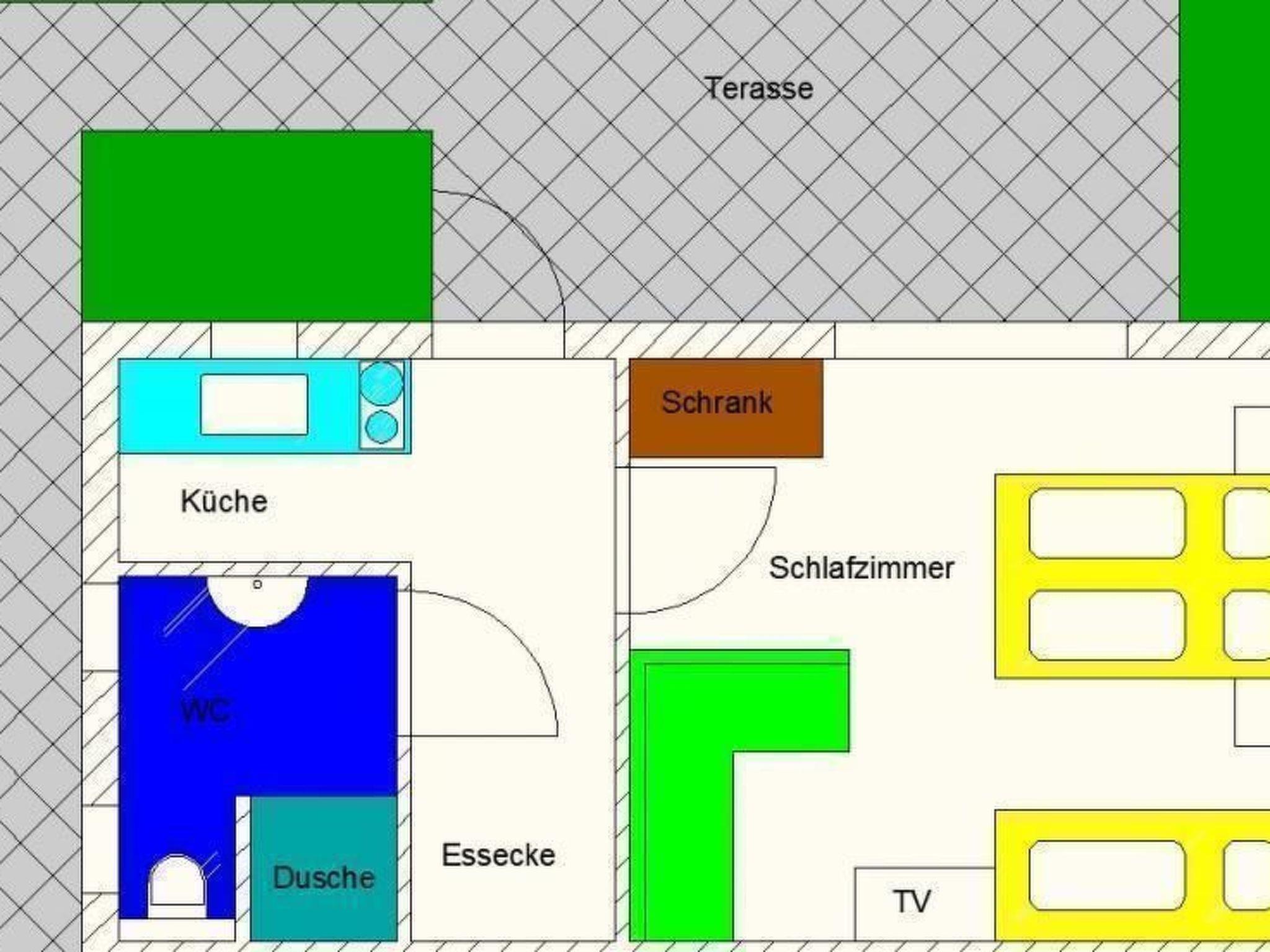 The "Kalle" flat welcomes you with warm and barrier-free furnishings. It is optimally tailored to the needs of two people, with special consideration given to wheelchair users. The combined living room and bedroom offers maximum comfort with its raised double bed and cosy sofa corner with flat-screen TV and radio with CD. The modern kitchen in the spacious hallway leaves nothing to be desired with a fridge, freezer, oven, coffee machine, kettle, toaster and microwave grill. The barrier-free shower room with shower seat completes this cosy holiday flat.