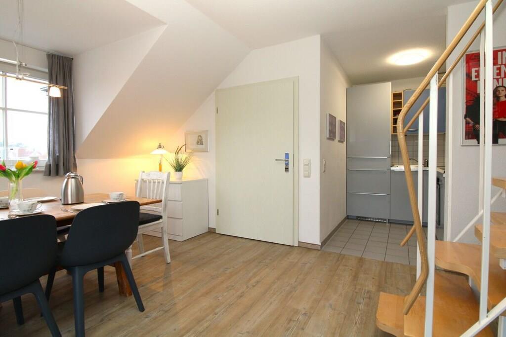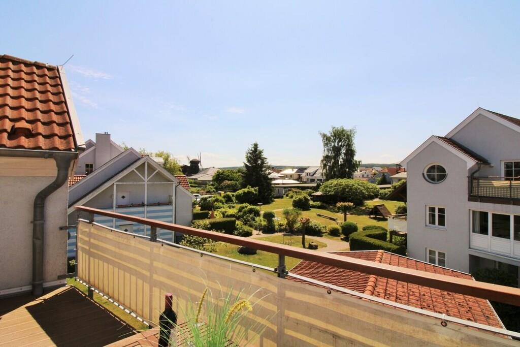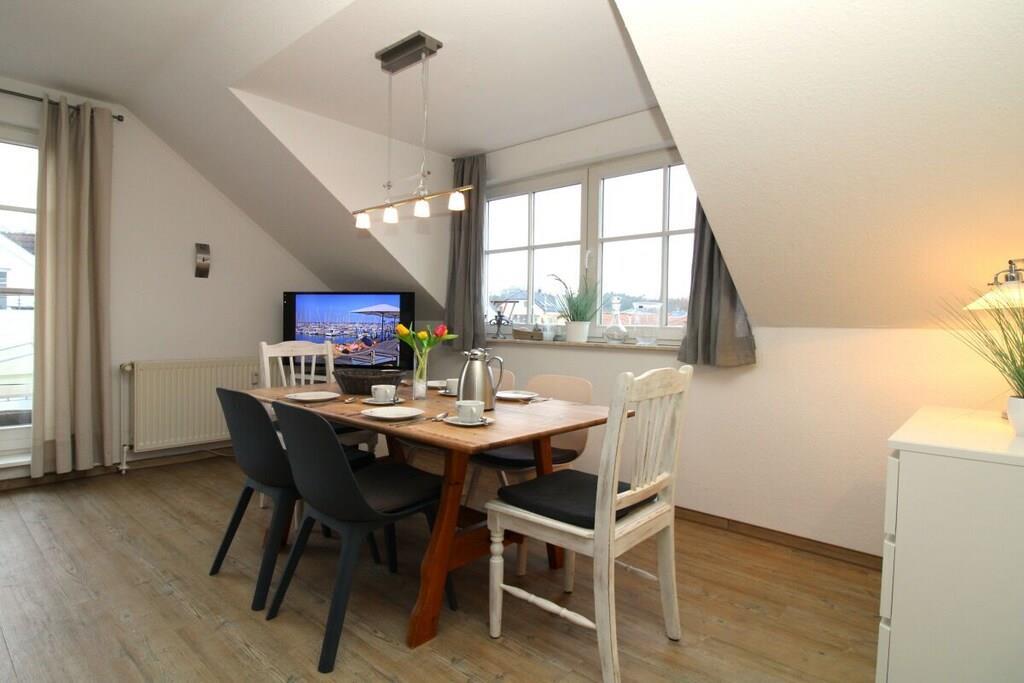 Die Ferienwohnung bietet Schlafmöglichkeiten für insgesamt 6 Personen. Für Kleinkinder stellen wir Ihnen bei Bedarf (gegen ein geringes Entgelt) zusätzlich auch gerne ein Kinderreisebett zur Verfügung, ein Kinderhochstuhl ist vorhanden Vom Flur mit Spiegel, Garderobe und Schuhschrank erreichen Sie bequem alle Räume Ihrer Ferienwohnung. Das helle und freundliche Wohn-/Esszimmer verfügt über eine separate Sitzgruppe mit bequemer Couch und Couchtisch, einen separaten Esstisch mit 6 Stühlen sowie eine Kommode. Vom Wohnzimmer aus haben Sie direkten Zugang zu dem ca. 8 m² großen und sonnigen Balkon (nach Süden und Westen ausgerichtet) mit verschiedenen Balkonmöbeln - hier sitzen Sie entspannt und gemütlich im Grünen und können abends bei einem guten Glas Wein in Ruhe die lauen Sommernächte genießen! Zu Ihrer Unterhaltung stehen Ihnen in der Ferienwohnung ein modernes Flatscreen-TV-Gerät, eine Stereo-Anlage mit Bluetooth, DVD-Player sowie eine kleine Auswahl an Büchern und Gesellschaftsspielen zur Verfügung. Darüber hinaus verfügt die Wohnung über kostenfreies WLAN. Die separate offene Küche beinhaltet eine voll ausgestattete Einbauküchenzeile mit 4-Platten-Ceran-Kochfeld, Backofen, Dunstabzug, Mikrowelle, Kühlschrank mit Gefrierfach, Geschirrspülmaschine, Kaffeemaschine, Wasserkocher und Toaster. Die Küche ist mit Geschirr, Gläsern, Besteck und Töpfen bestens und vollständig ausgestattet. Das geräumige 1. Schlafzimmer ist mit einem bequemen Doppelbett, Nachttischen sowie einem geräumigen Kleiderschrank eingerichtet und verfügt über ein zusätzliches modernes Flatscreen-TV-Gerät. Das separate und zusätzliche 2. Schlafzimmer verfügt über zwei bequeme Einzelbetten. Darüber hinaus verfügt dieses Zimmer über einen Nachttisch, einen geräumigen Kleiderschrank sowie einen Sessel mit kleinem Beistelltisch. Über eine kleine Treppe aus dem Wohnzimmer erreichen Sie das Dachgeschoss der Wohnung mit dem 3. Schlafzimmer. Dieses ist mit 2 Einzelbetten, 2 Sesseln mit Couchtisch sowie 2 kleinen Kommoden eingerichtet und verfügt über ein weiteres zusätzliches TV-Gerät. Das Badezimmer verfügt über eine Dusche, Waschbecken, WC, einen Föhn sowie ausreichend Ablagemöglichkeiten.
