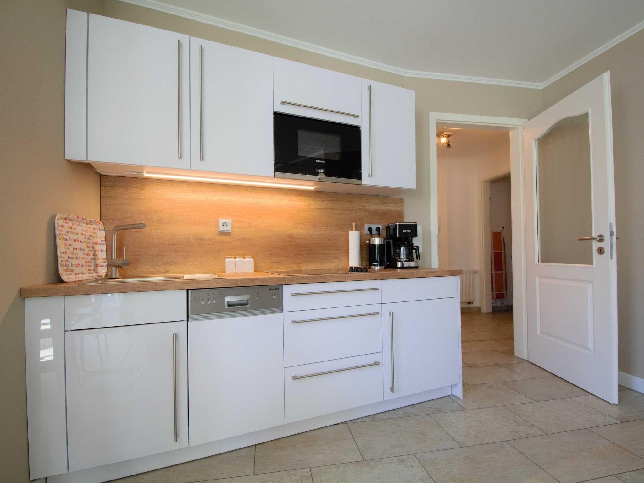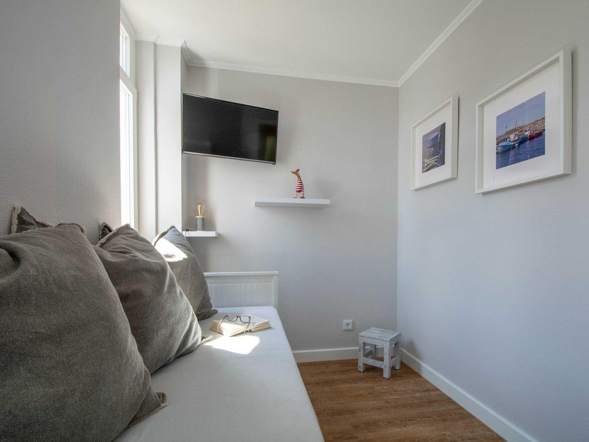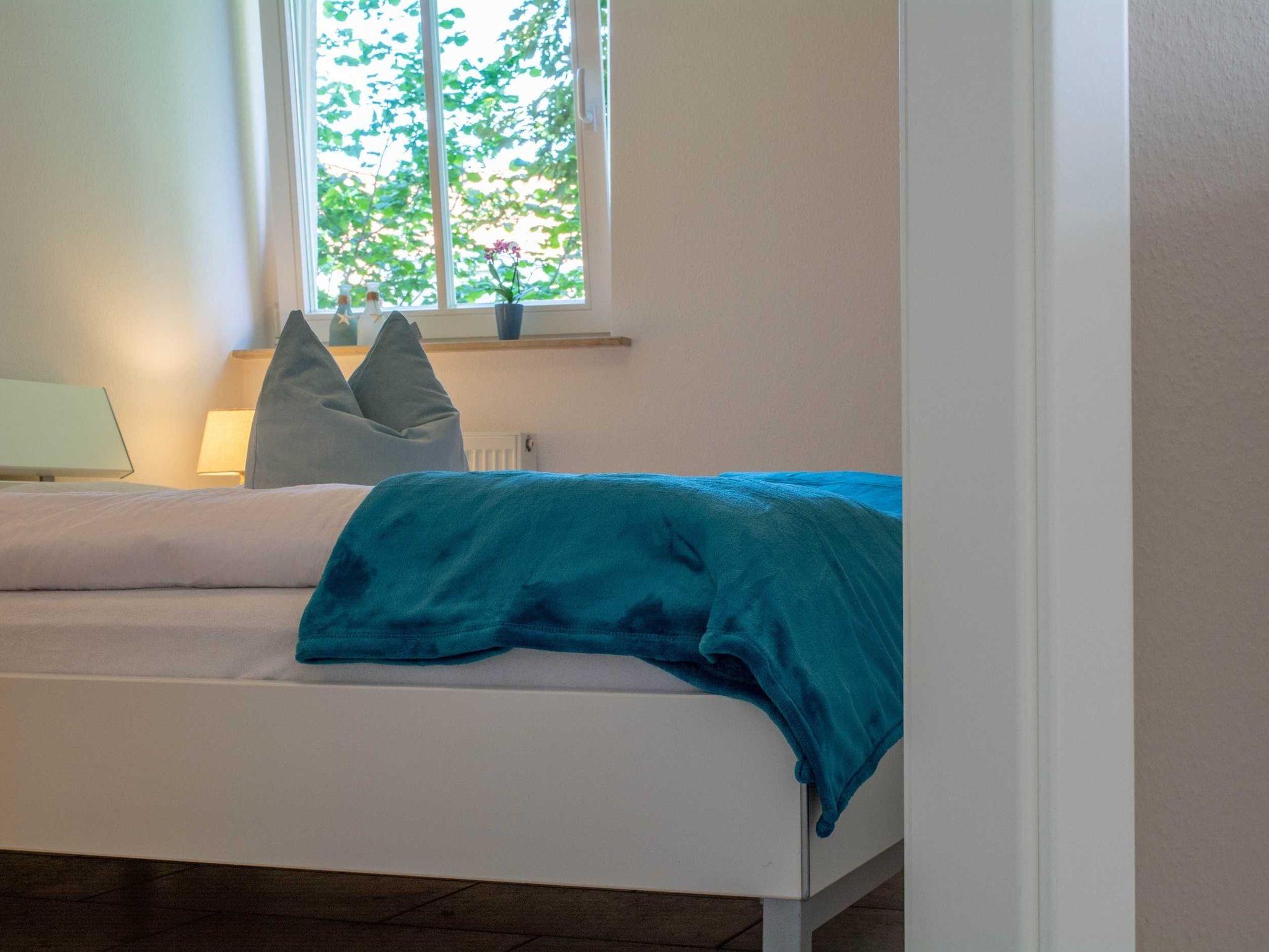 Sie wohnen in einer mit sehr viel Liebe zum Detail eingerichteten 3-Raum-Ferienwohnung von ca. 58 qm Größe, die sich im ersten Obergeschoss befindet. Das Wohnzimmer ist ausgestattet mit Küchenzeile (Ceranfeld, Mikrowelle mit Backofen, Kühlschrank mit Gefrierfach, Geschirrspüler, Wasserkocher, Toaster, Kaffeemaschine), bequemer Wohnlandschaft mit Sessel und Hocker, Essecke, Radio und FlatScreen-TV. Vom Wohnraum aus betreten Sie den Balkon in Richtung Norden, der zum Entspannen sowie zum Frühstück und Abendessen im Sonnenschein einlädt. Die Wohnung verfügt über zwei liebevoll eingerichtete Schlafzimmer: Das erste große Schlafzimmer ist ausgestattet mit einem Doppelbett, einem großen Kleiderschrank sowie einem FlatScreen-TV. Der zweite kleine Schlafraum verfügt über ein ausziehbares Tagesbett (1,60m x 2m), über einen Kleiderschrank sowie ein FlatScreen-TV. Das Bad mit Dusche (90cm x 90cm) und WC vervollständigt das Gesamtbild dieser Wohnung.
