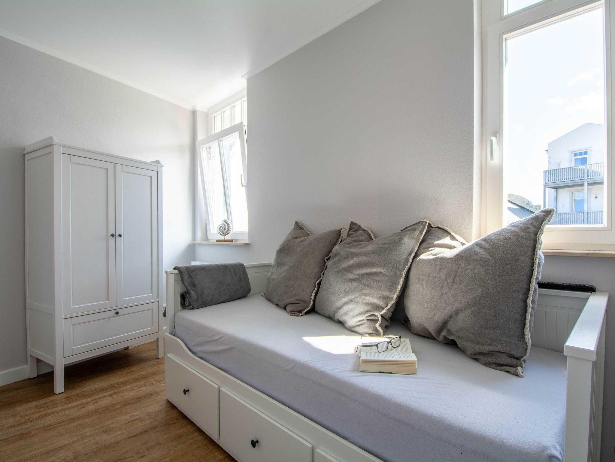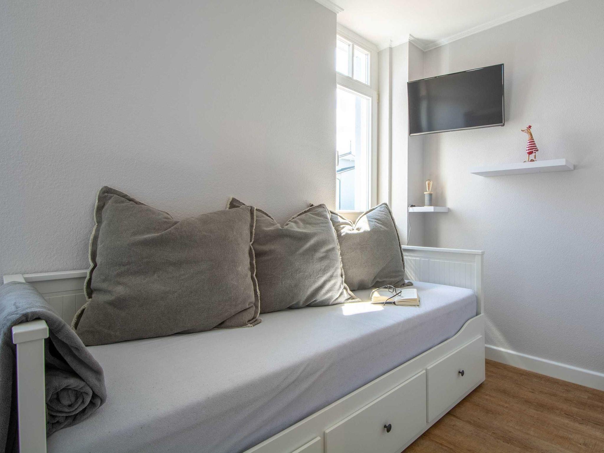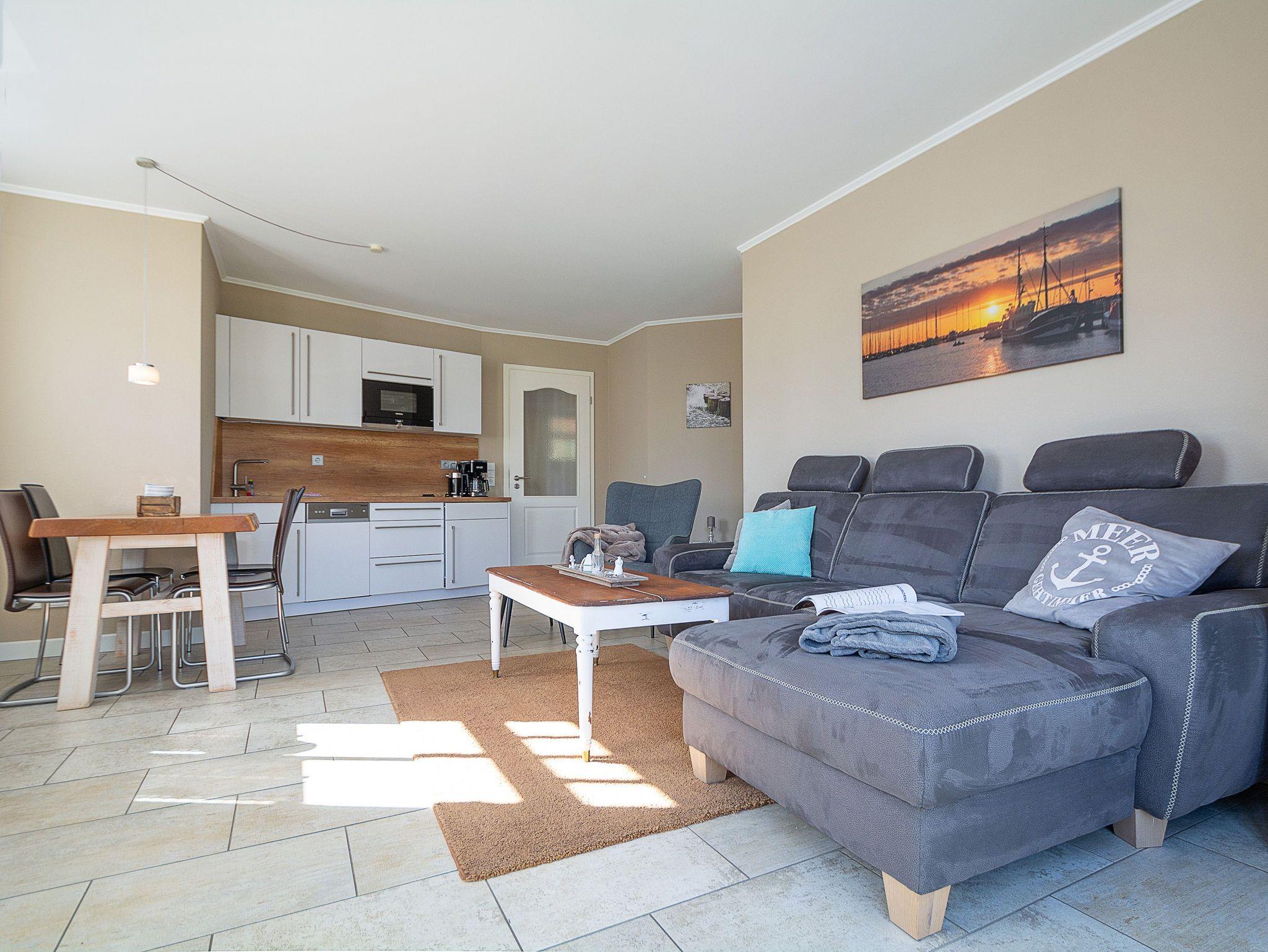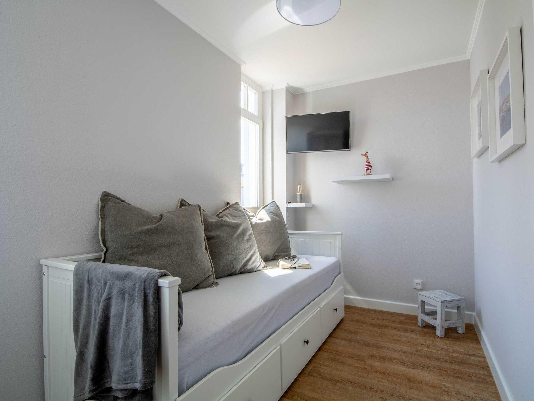 Sie wohnen in einer mit sehr viel Liebe zum Detail eingerichteten 3-Raum-Ferienwohnung von ca. 58 qm Größe, die sich im ersten Obergeschoss befindet. Das Wohnzimmer ist ausgestattet mit Küchenzeile (Ceranfeld, Mikrowelle mit Backofen, Kühlschrank mit Gefrierfach, Geschirrspüler, Wasserkocher, Toaster, Kaffeemaschine), bequemer Wohnlandschaft mit Sessel und Hocker, Essecke, Radio und FlatScreen-TV. Vom Wohnraum aus betreten Sie den Balkon in Richtung Norden, der zum Entspannen sowie zum Frühstück und Abendessen im Sonnenschein einlädt. Die Wohnung verfügt über zwei liebevoll eingerichtete Schlafzimmer: Das erste große Schlafzimmer ist ausgestattet mit einem Doppelbett, einem großen Kleiderschrank sowie einem FlatScreen-TV. Der zweite kleine Schlafraum verfügt über ein ausziehbares Tagesbett (1,60m x 2m), über einen Kleiderschrank sowie ein FlatScreen-TV. Das Bad mit Dusche (90cm x 90cm) und WC vervollständigt das Gesamtbild dieser Wohnung.
