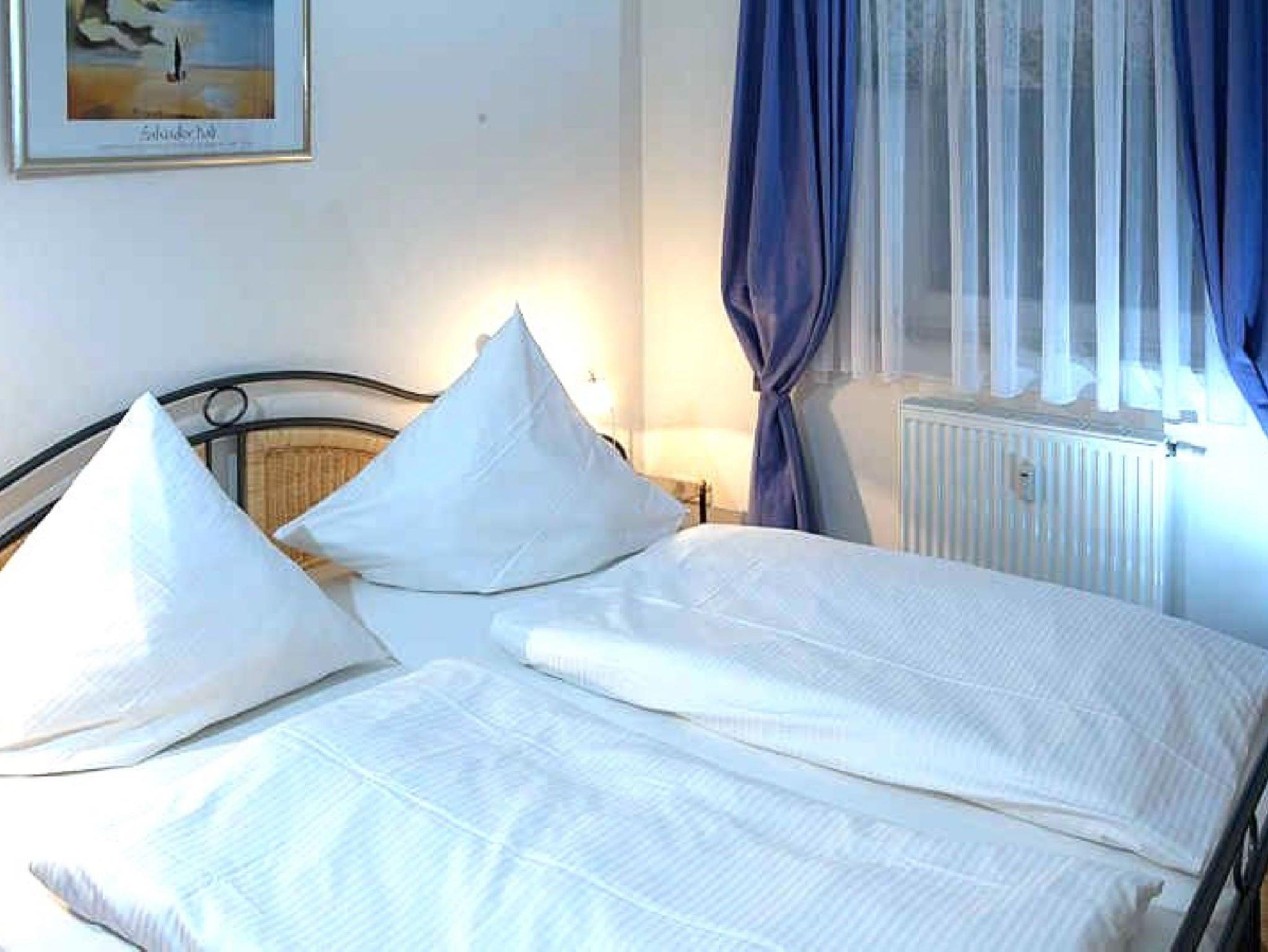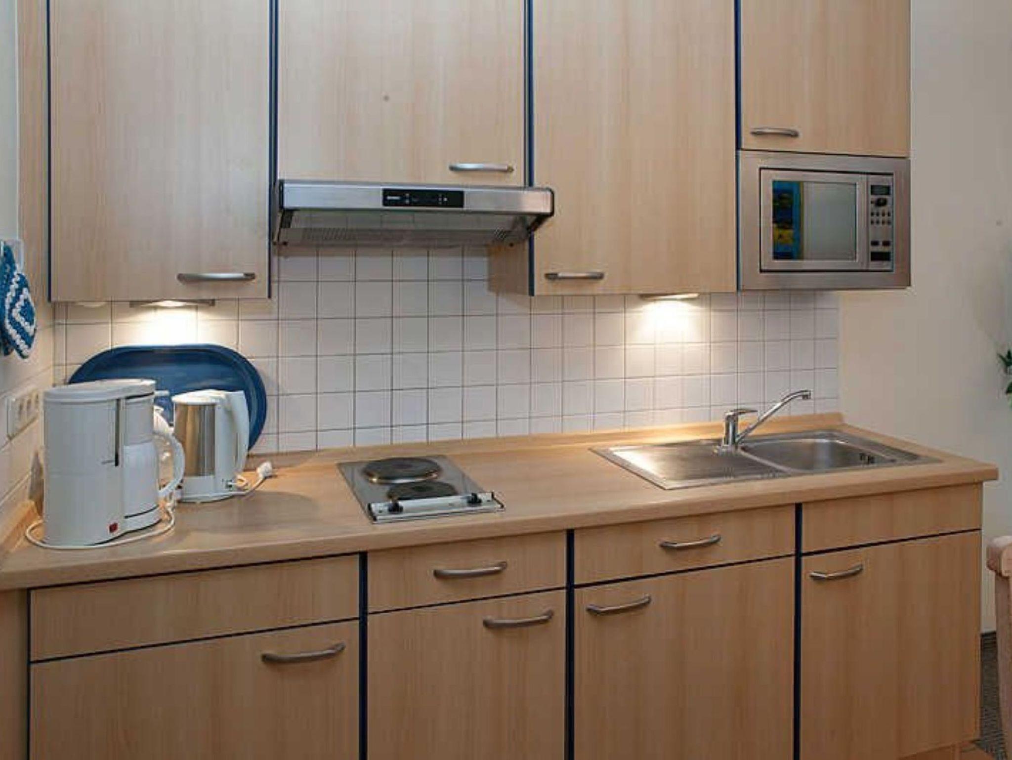 Die zweckmäßig gestaltete Ferienwohnung in der 1. Etage hat einen offenen Wohnbereich mit Küchenzeile und Essbereich, ein Schlafzimmer mit Doppelbett und einen Balkon. Die funktionale Küchenzeile ist mit 2-Platten-Kochfeld, Kühlschrank mit Gefrierfach, Mikrowelle, Kaffeemaschine und div. Geschirr ausgestattet. Ein Bad mit Dusche, Waschbecken und WC komplettieren den Gesamteindruck der Wohnung.