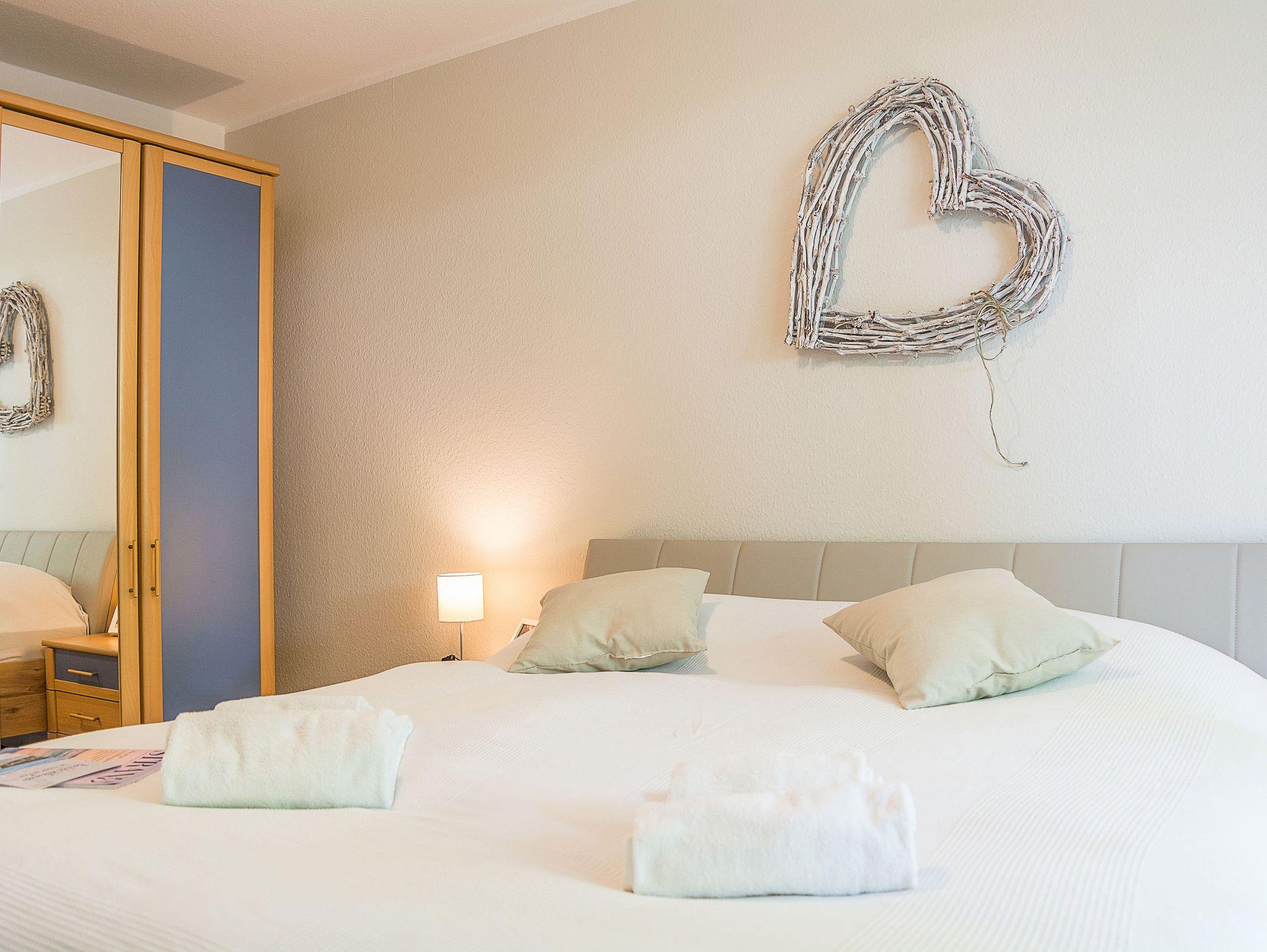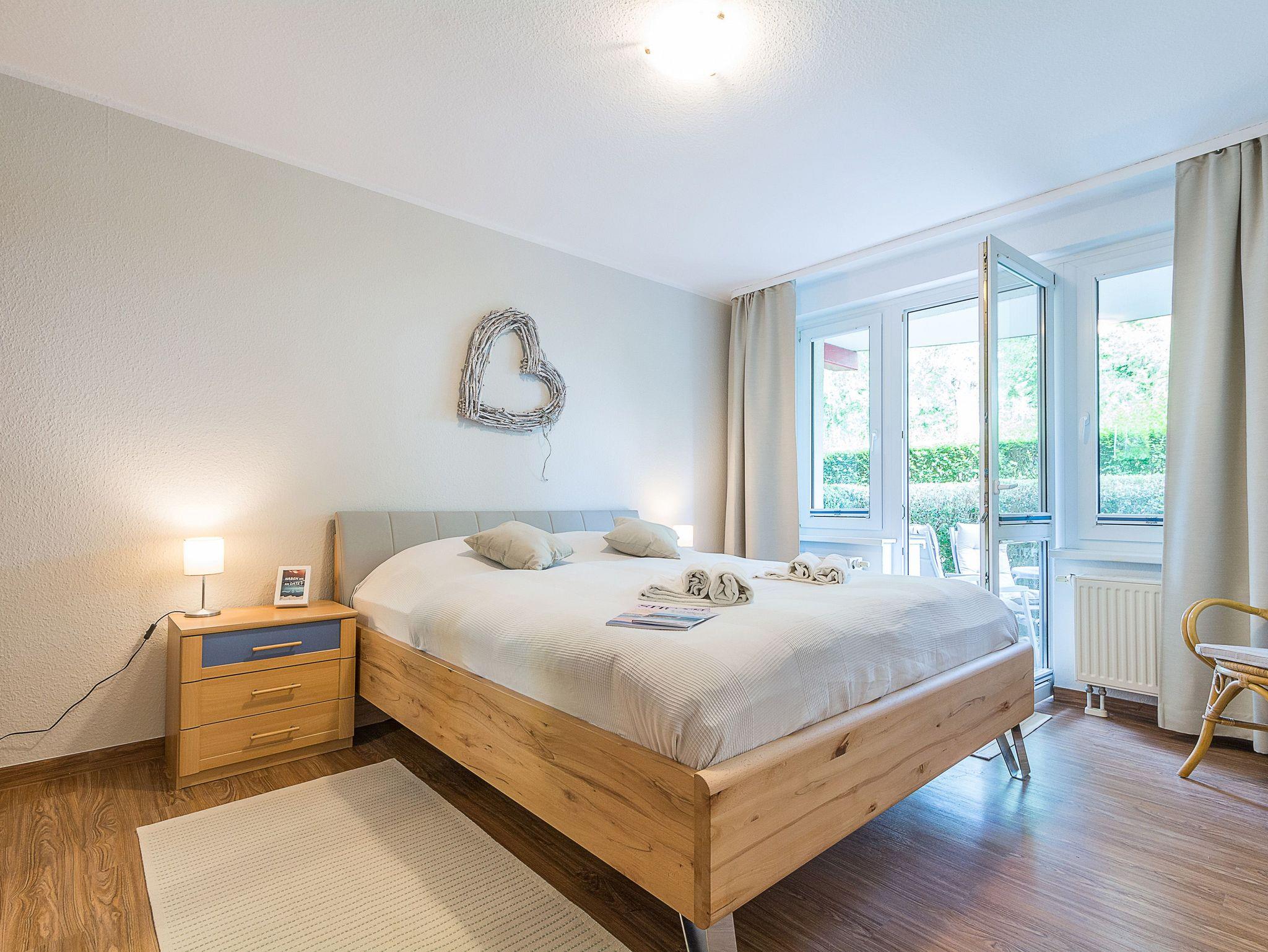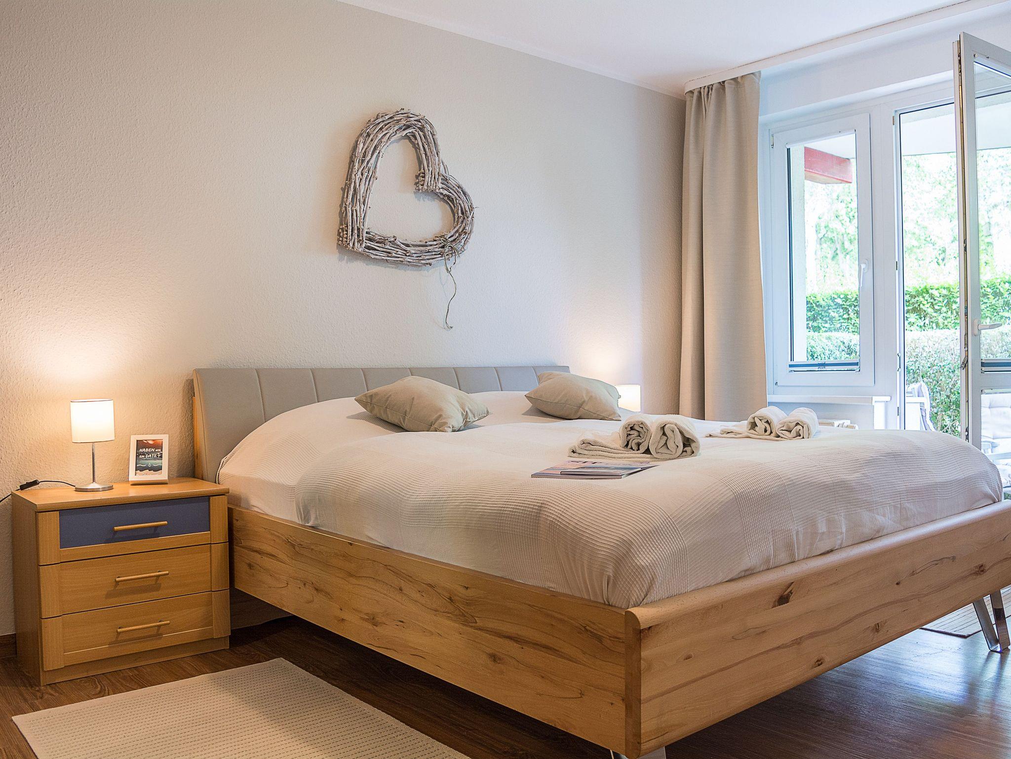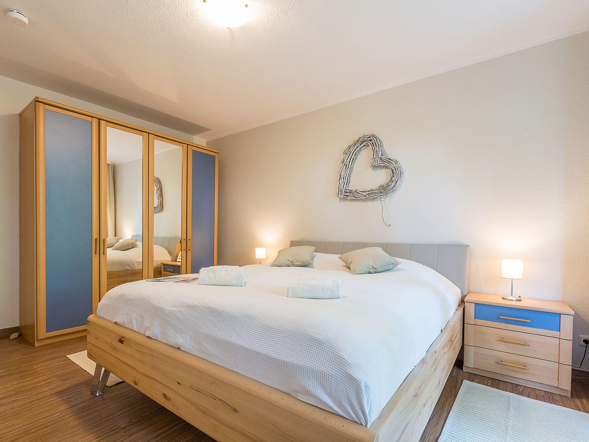 Im Schlafzimmer lädt Sie ein komfortables Doppelbett (2 x 90 x 200 cm) zur Nachtruhe ein. Der großzügige Kleiderschrank mit Ganzkörperspiegel bietet genügend Platz für Ihre Urlaubsgarderobe. Von hier betreten Sie die möblierte Ost-Terrasse, die zum leckeren Frühstück in der Morgensonne sowie zum Entspannen einlädt.