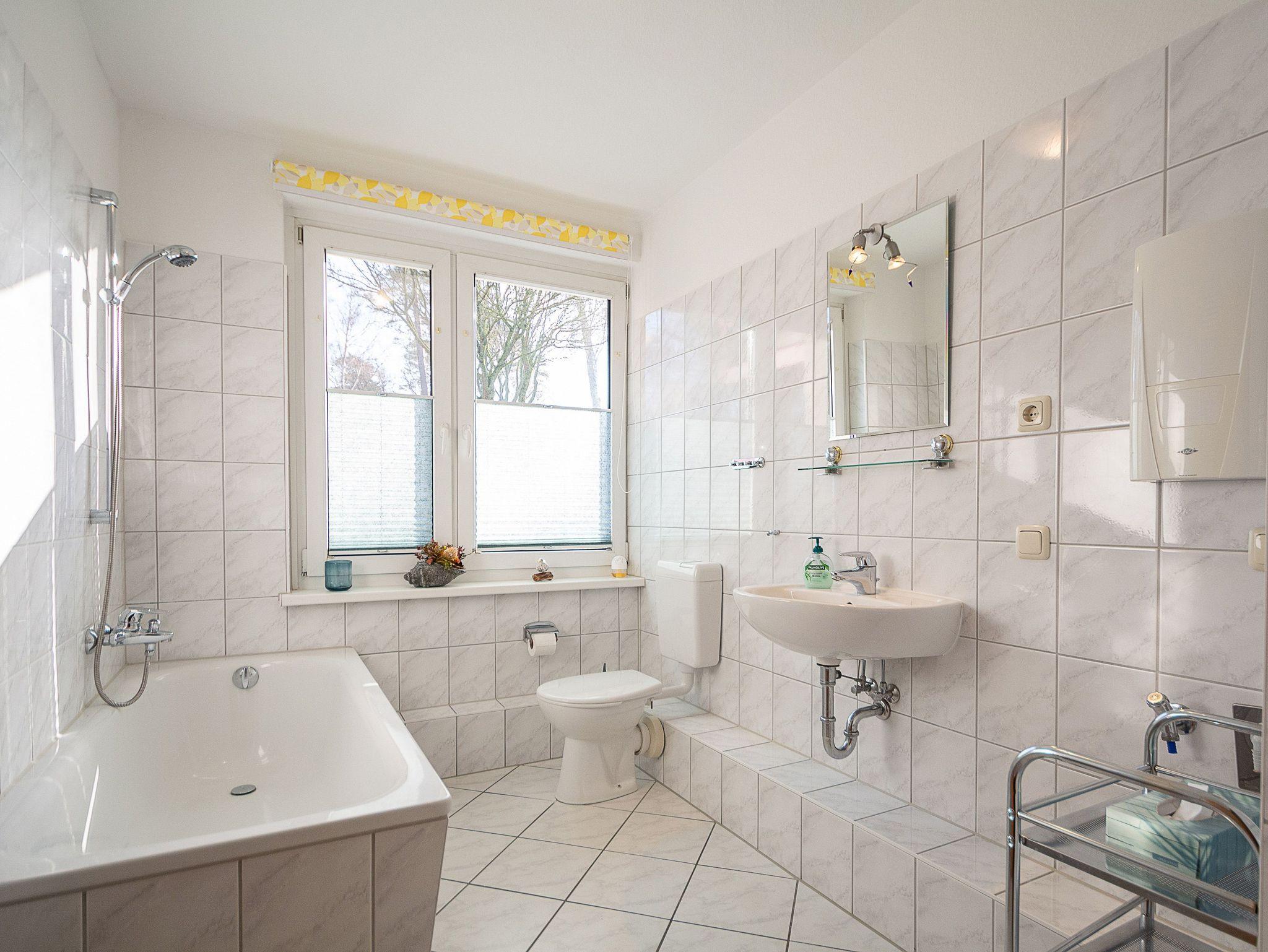 Das geflieste Tageslichtbad mit einer Badewanne, Waschbecken und WC und vervollständigt das Gesamtbild dieser Ferienwohnung.