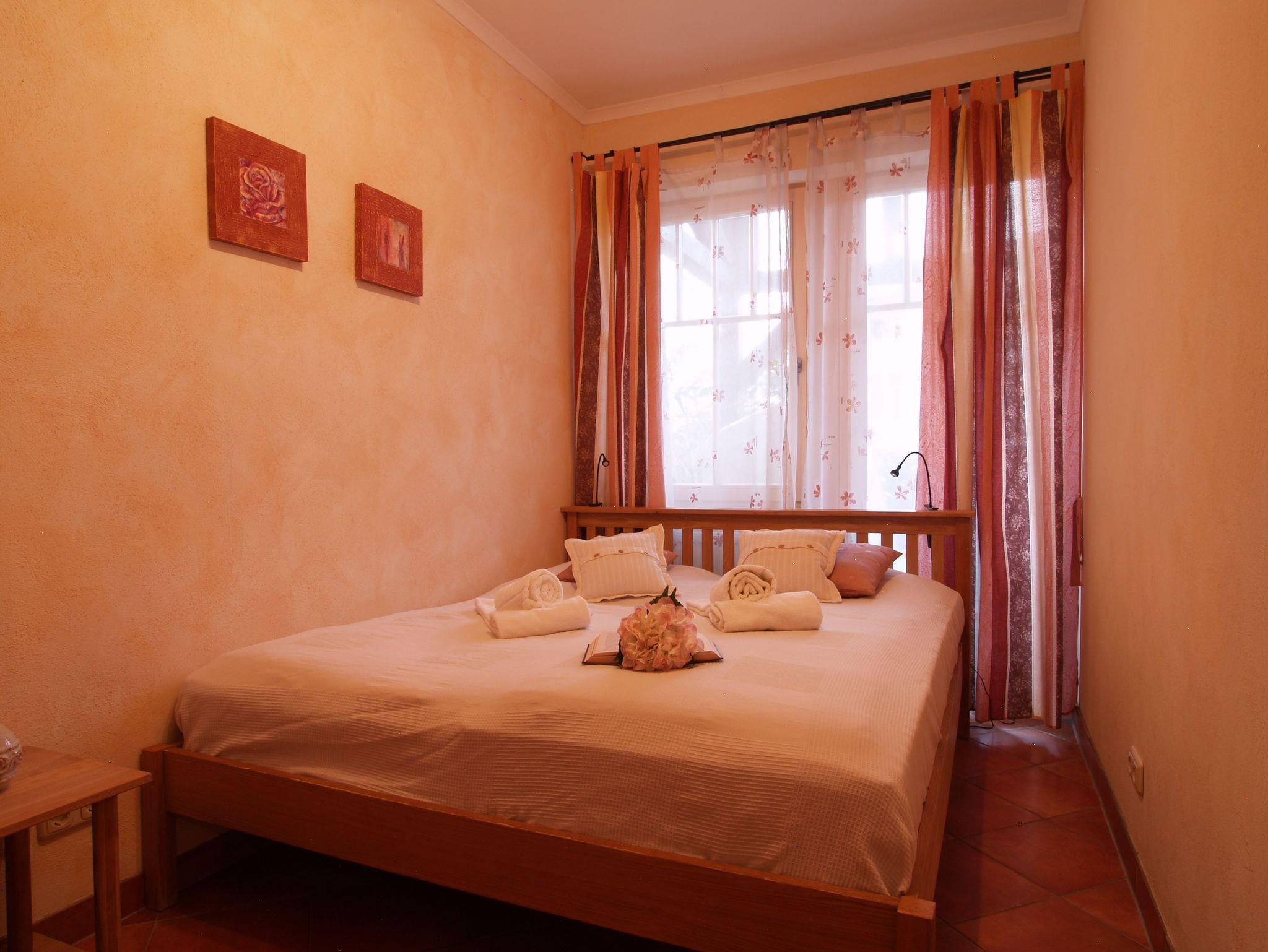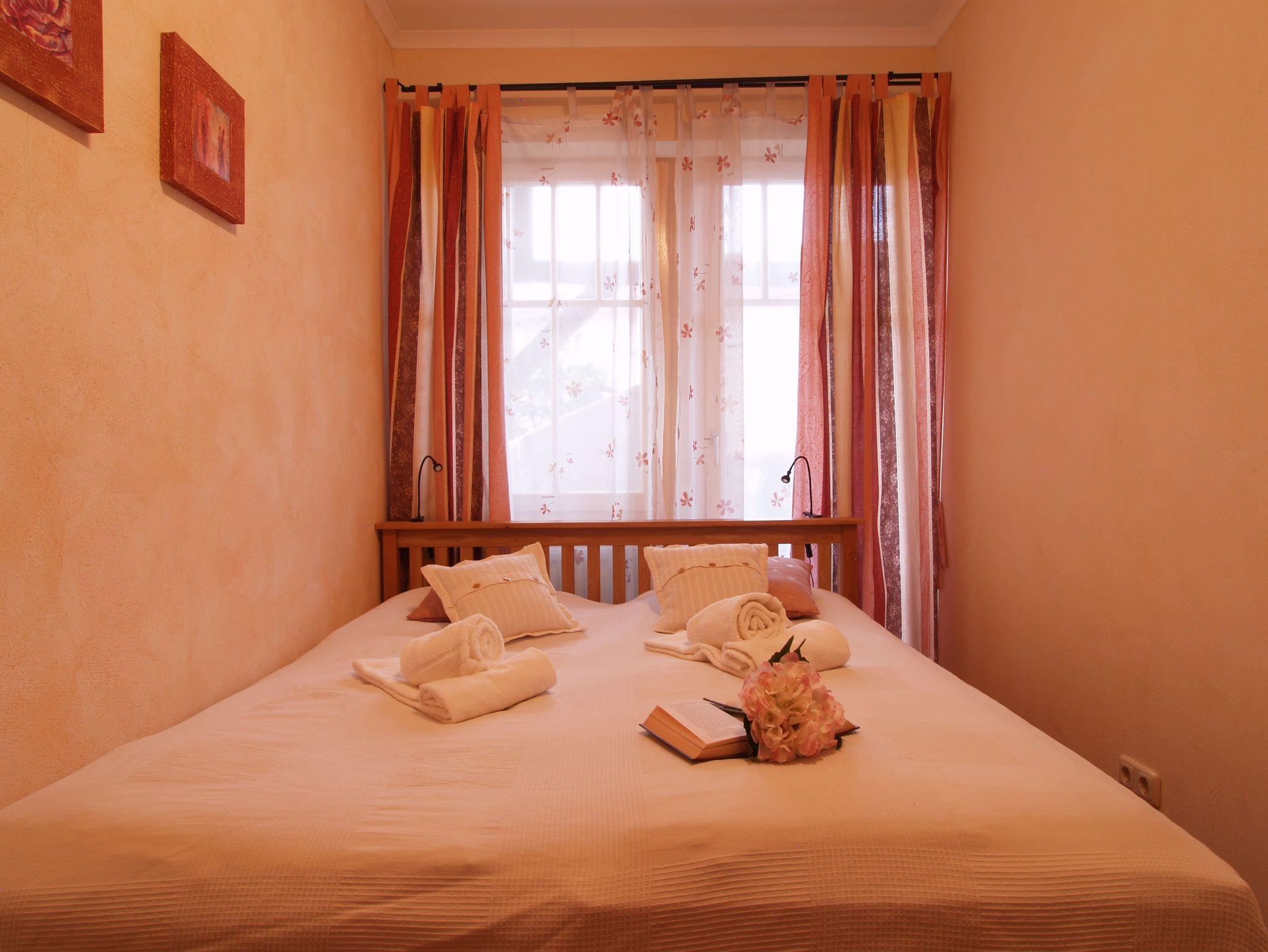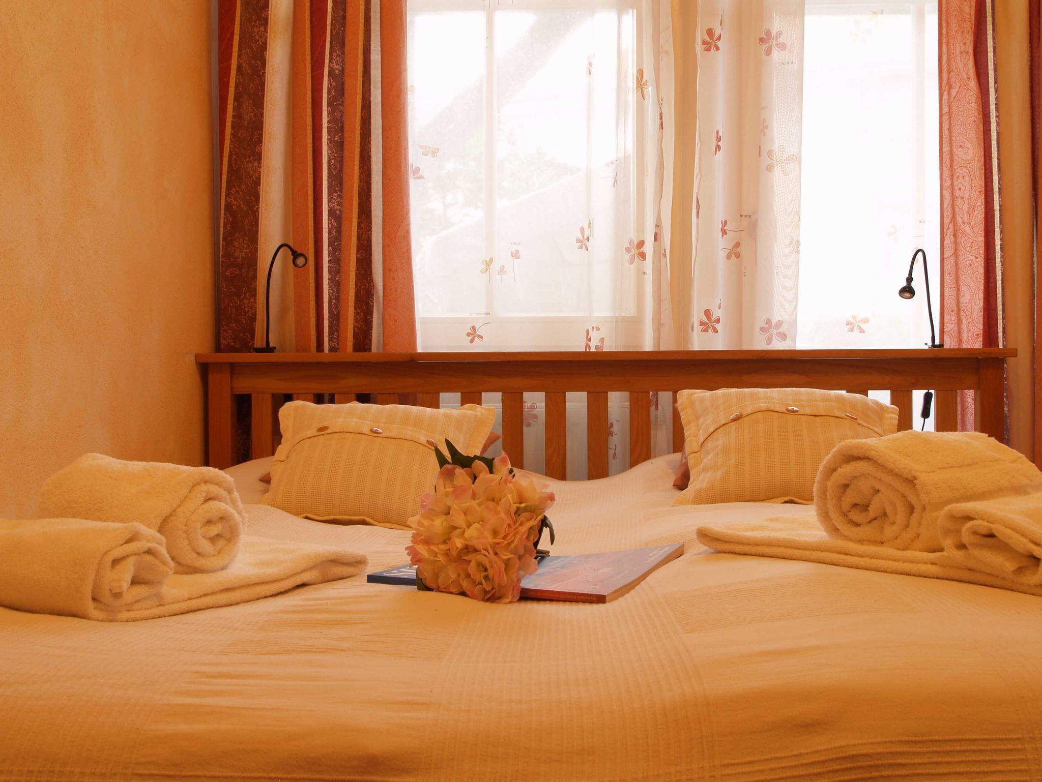 Im ersten größeren Schlafzimmer lädt Sie ein komfortables Doppelbett (2 x 90cm x 200 cm) zur Nachtruhe ein. Der großzügige Kleiderschrank bietet genügend Platz für Ihre Urlaubsgarderobe. Zudem erwartet Sie hier ein zweiter 32-Zoll-Flachbild-TV. Das zweite, etwas kleinere Schlafzimmer verfügt über ein Doppelbett (2 x 80cm x 200cm) und einem kleinen geräumigen Kleiderschrank mit Ganzkörperspiegel. Als Sichtschutz sind in den Schlafzimmern und im Wohnbereich Gardinen und Vorhänge an den Fenstern angebracht. Optional ist als Beistellbett ein Klappbett sowie ein Kinderbett vorhanden.