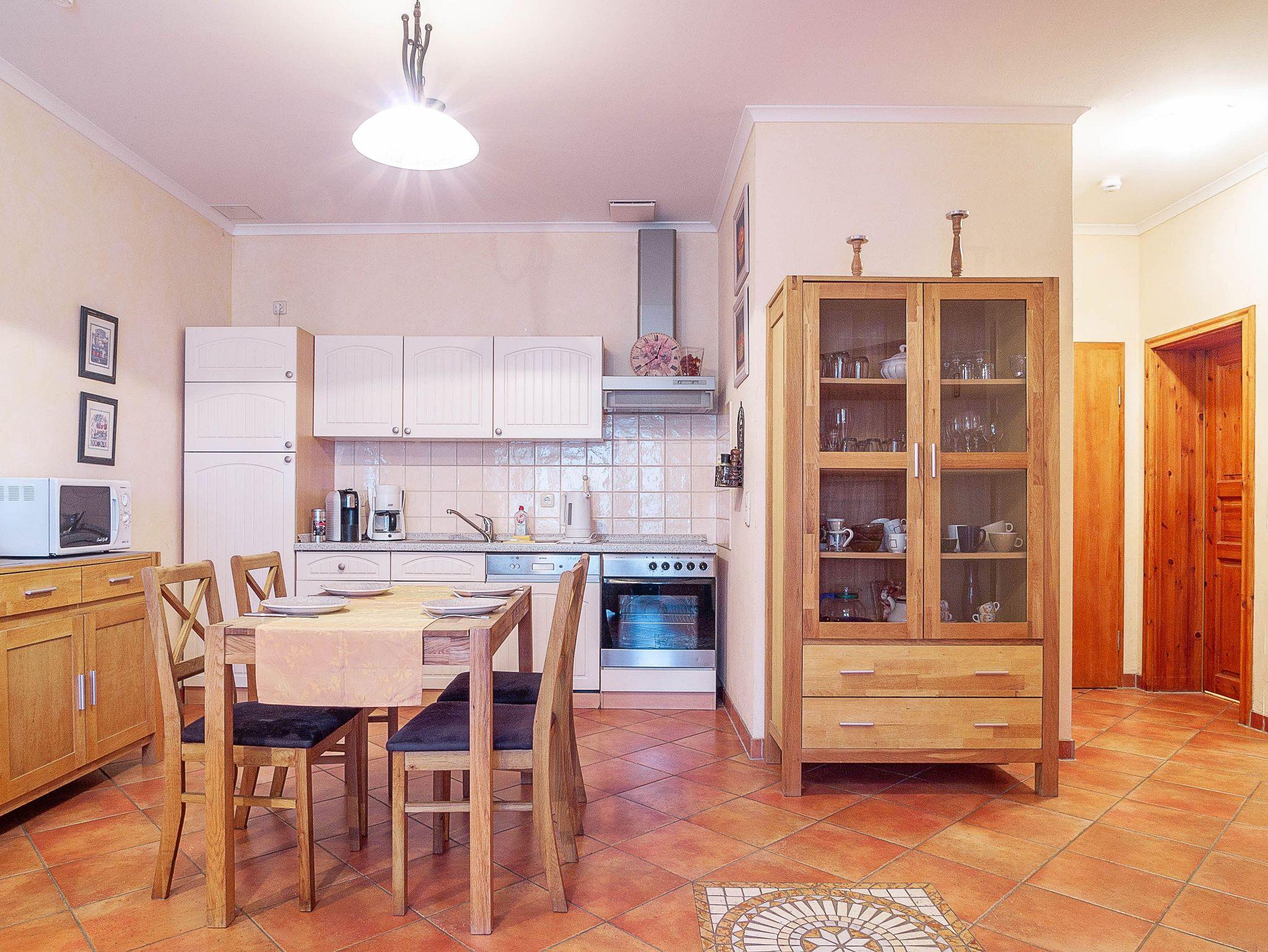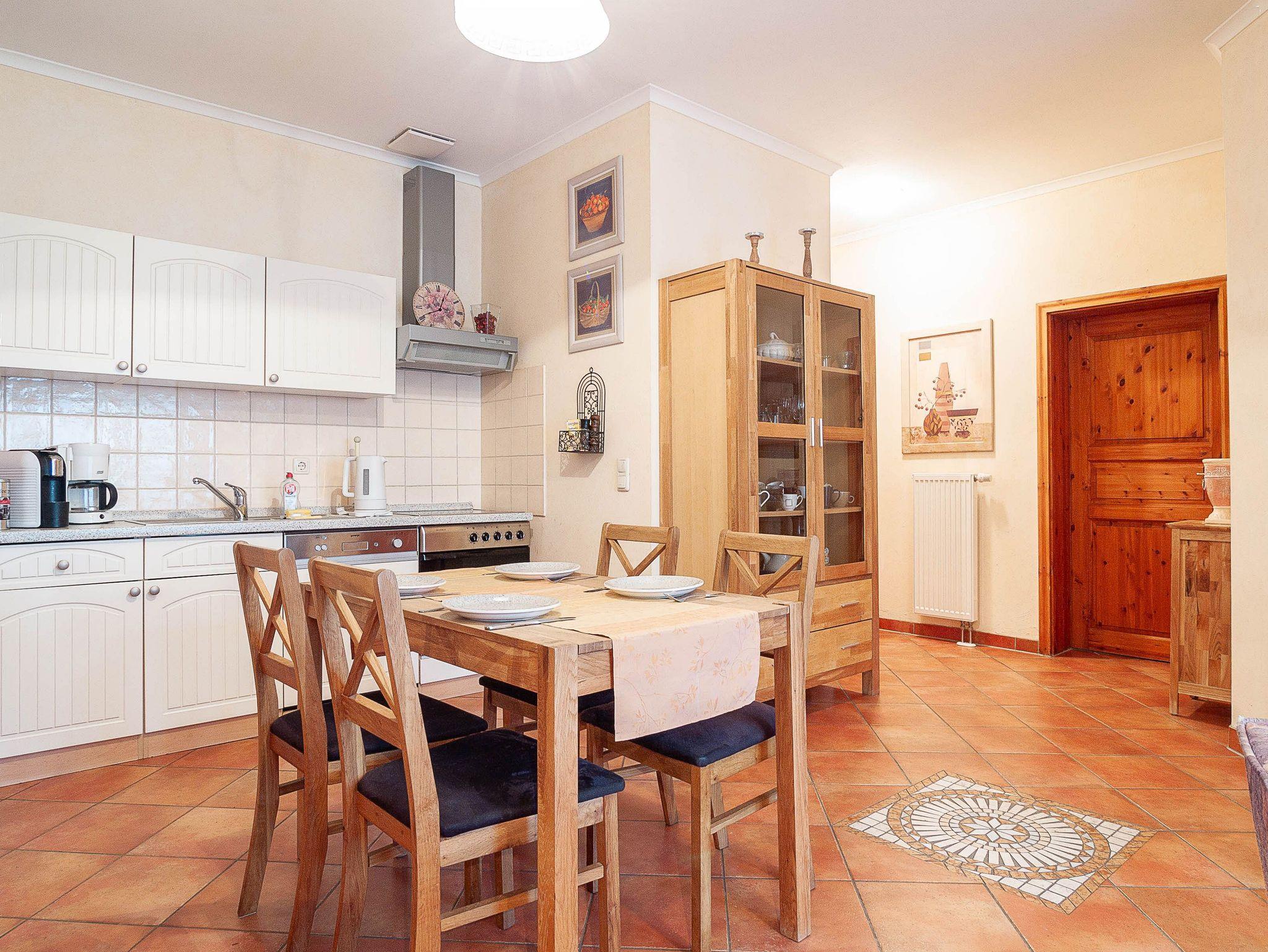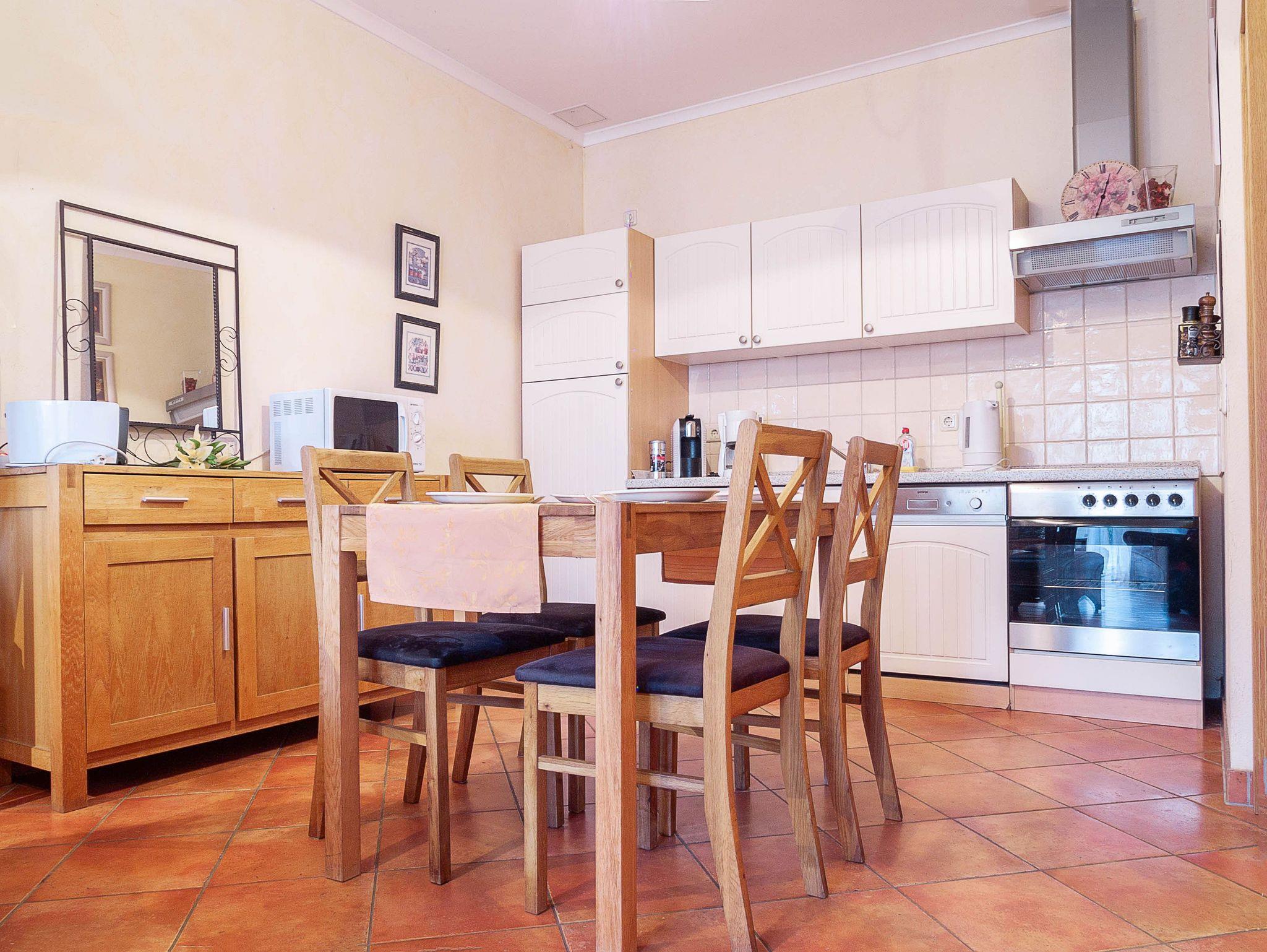 Der angrenzende Essbereich bietet Ihnen reichlich Platz für gemeinsame Mahlzeiten. Die offene Küchenzeile im modernen Landhausstil hält für Sie alle wichtigen Küchengeräte und -utensilien bereit, die Sie für Ihr perfektes Dinner benötigen: Ein 4-Zonen-Cerankochfeld mi Dunstabzug, ein Backofen, ein Geschirrspüler, eine Mikrowelle sowie ein Kühlschrank mit Gefrierfach befinden sich in der Küche. Eine Kaffeemaschine, ein Wasserkocher und ein Toaster sowie genügend Koch- und Essgeschirr vervollständigen die Kücheneinrichtung.