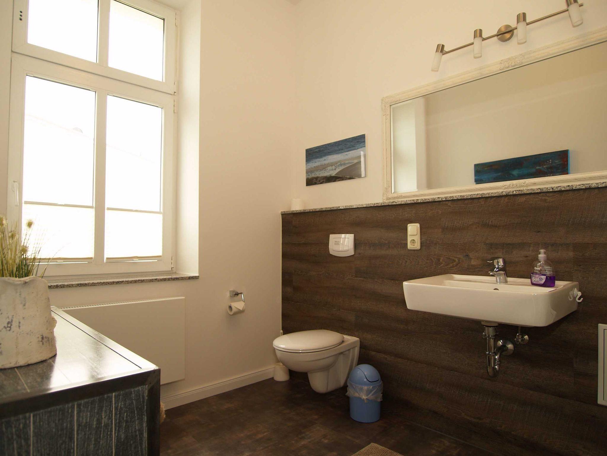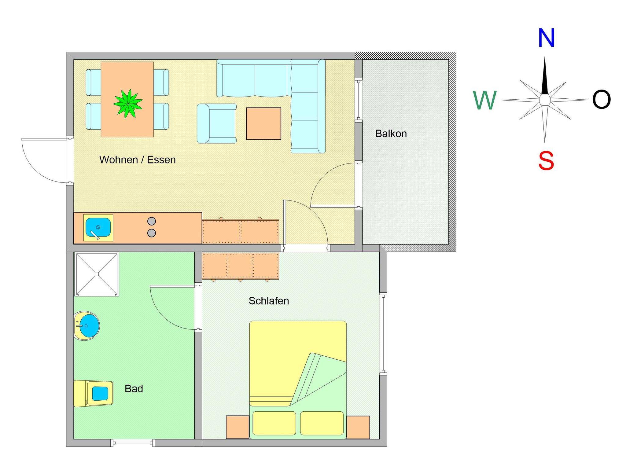 Sie wohnen in einer liebevoll eingerichteten 2-Raum-Ferienwohnung von ca. 45 m² Größe, die sich im ersten Obergeschoss befindet. Der offene und helle Wohnraum ist ausgestattet mit einer Schlafcouch, Flachbild-TV, Essplatz und einer kleinen Küchenzeile (2-Platten-Cerankochfeld, Kühlschrank mit Gefrierfach, Geschirrspüler, Kaffeemaschine, Toaster). Vom Wohnraum betreten Sie den nach Osten ausgerichteten und möblierten Balkon, von dem Sie Ihr Frühstück und gemütliche Stunden in der Sonne genießen sowie Ihren Blick über die Strandstraße schweifen lassen können. Der Schlafraum ist mit Doppelbett und Kleiderschrank eingerichtet. Das moderne geflieste Tageslichtbad ist ausgestattet mit Dusche und WC und bietet genügend Ablagefläche für Ihre Pflegeutensilien.