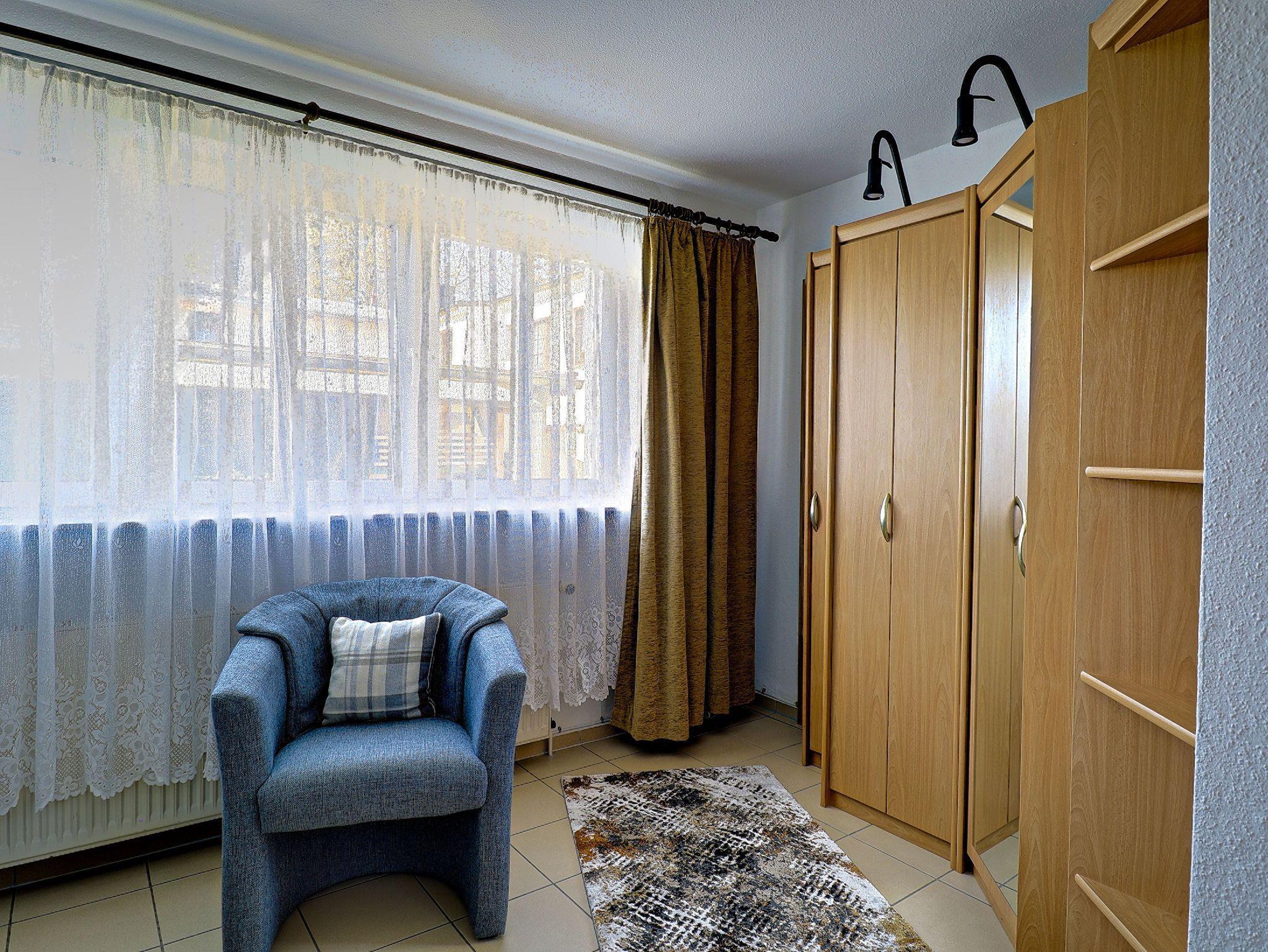 Die 40 m² große 2 Raum-Wohnung befindet sich im Erdgeschoss.Die Wohnung besteht aus einem Schlafzimmer, einem Bad mit Dusche und einem Wohn/Esszimmer mit integerierter Pantryküche. Es gibt ein 2-Platten Kochfeld und ein Eisfach im Kühlschrank. Das Sofa hat eine Schlaffunktion.