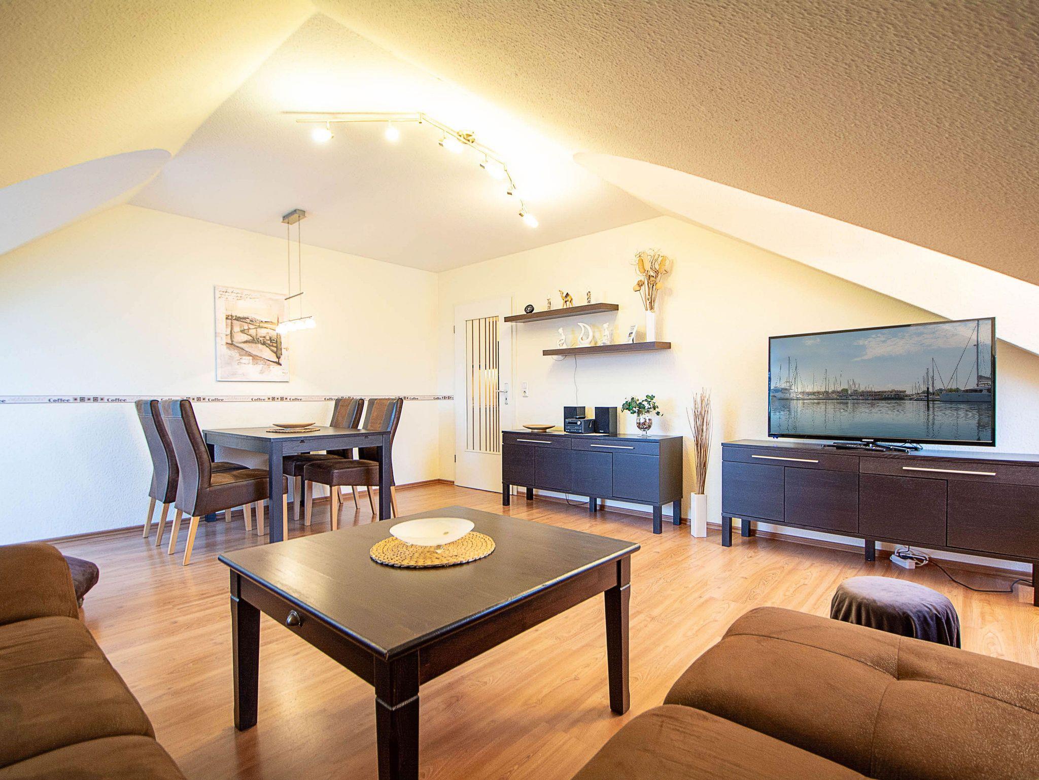 Der Wohnbereich lädt nach einem erlebnisreichen Tag am Meer zum Entspannen ein. Machen Sie es sich auf dem Sofa gemütlich oder genießen Sie gemeinsame Mahlzeiten am Esstisch, der für alle Gäste ausreichend Platz bietet.