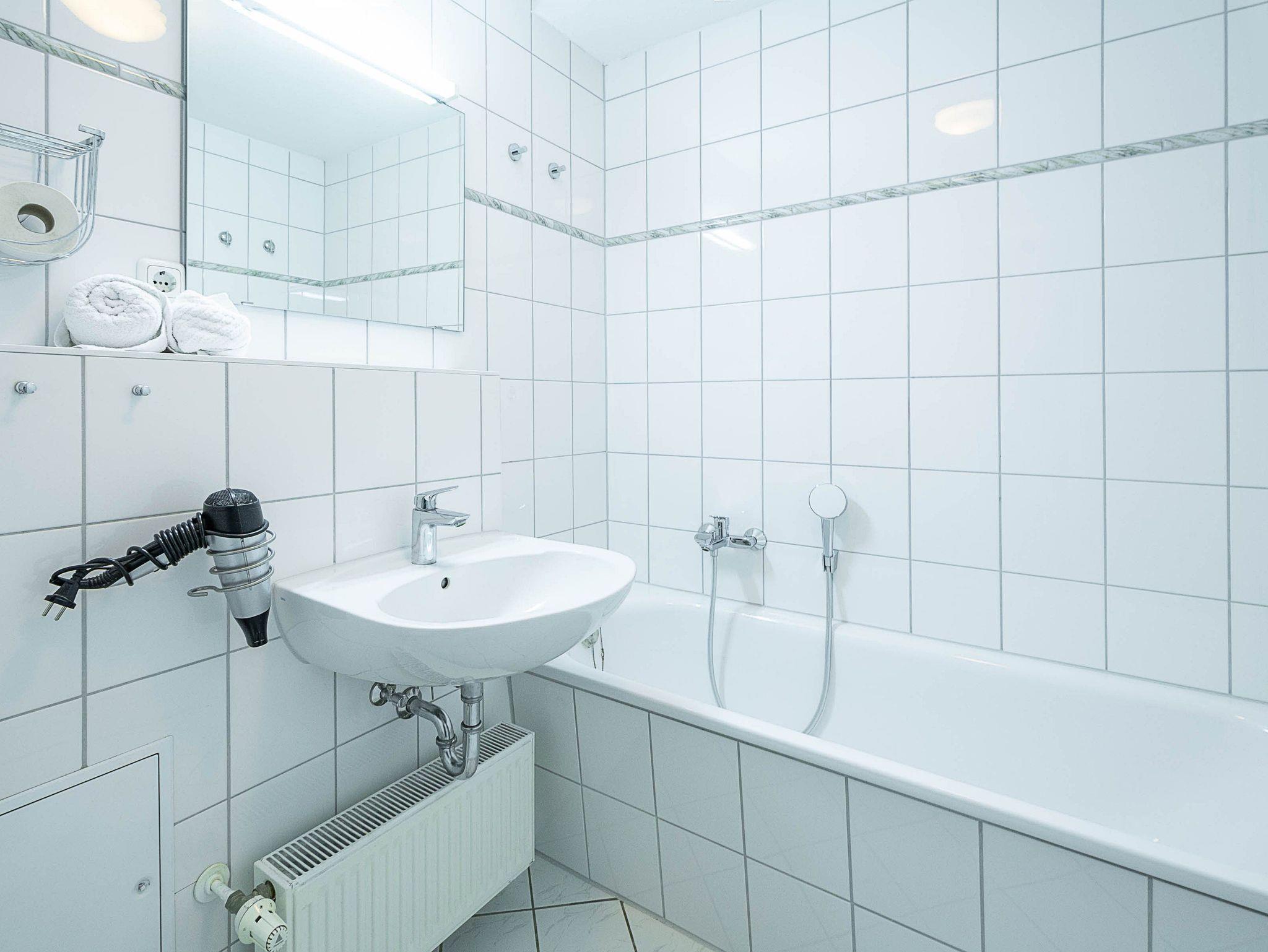 Das moderne Badezimmer verfügt über eine Badewanne, Dusche, Waschbecken und WC ? hier können Sie sich für den nächsten Urlaubstag frisch machen oder einfach entspannen.