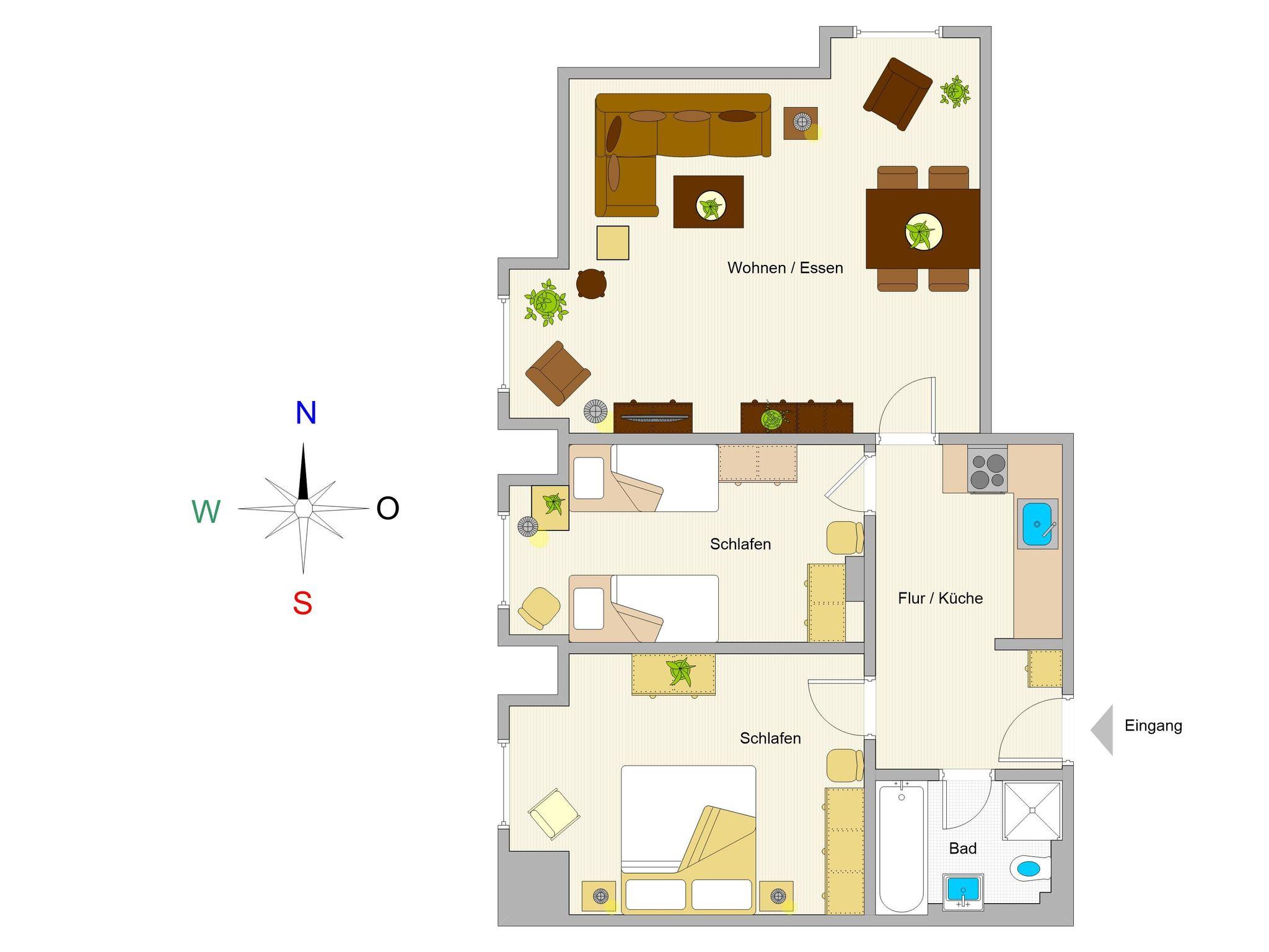 Diese helle 3-Raum-Wohnung mit zwei Schlafzimmern und einem offenen Wohnbereich befindet sich im 3. Obergeschoss des Strandschlösschens. Auf komfortablen 66 qm Wohnfläche bietet die Wohnung den perfekten Rückzugsort für bis zu 4 Personen.