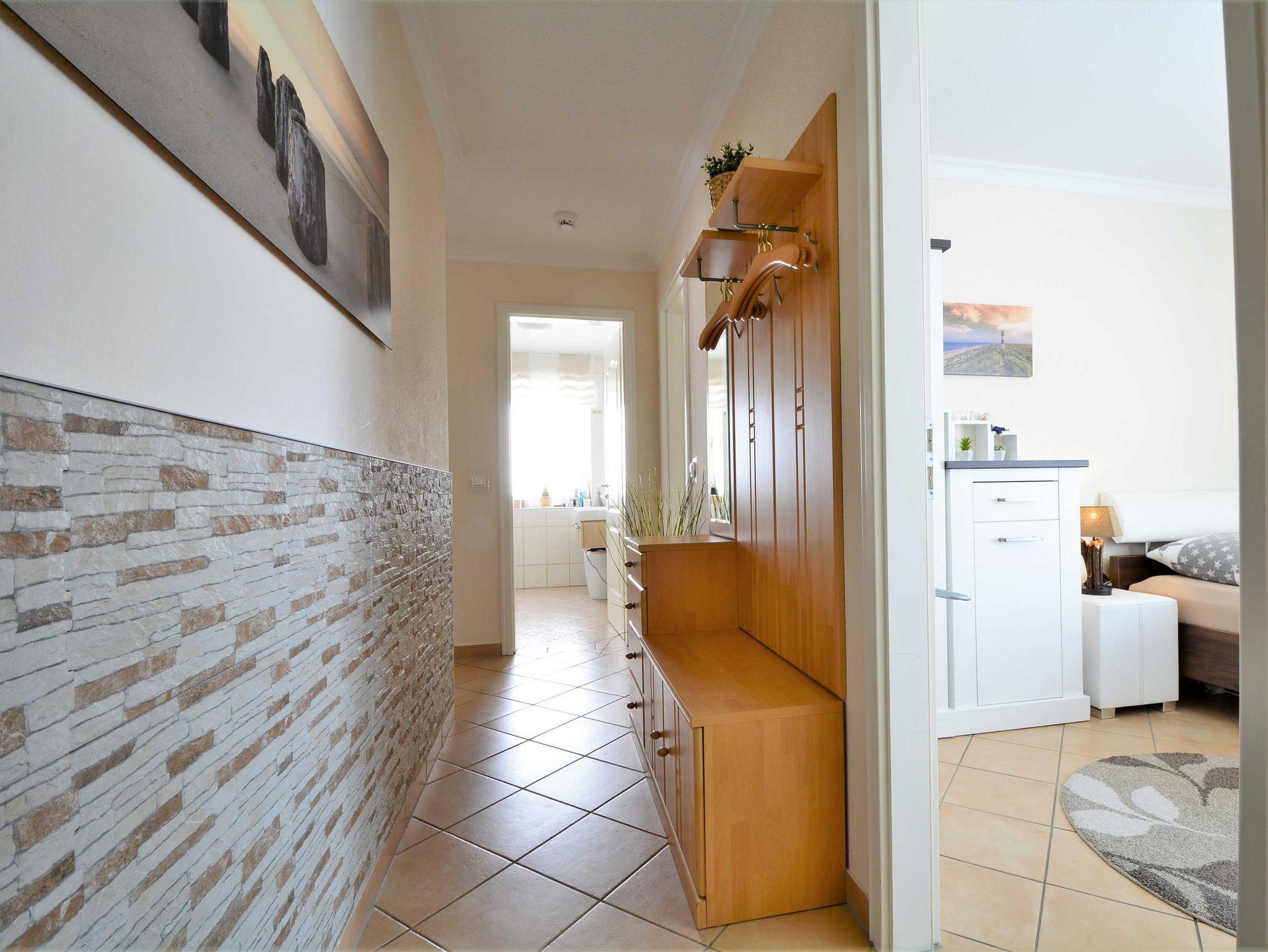 Das modern und gemütlich eingerichtete Wohnzimmer ist ausgestattet mit einer bequemen Sofalandschaft einer, Stereoanlage, einem 49-Zoll-Flat-TV-Gerät und DVD-/Blu Ray-Player. Von hier betreten Sie den nach Westen ausgerichteten Balkon. Hier können Sie Sonne tanken, relaxen und den Abend nach einem schönen Tag am Meer ausklingen lassen.