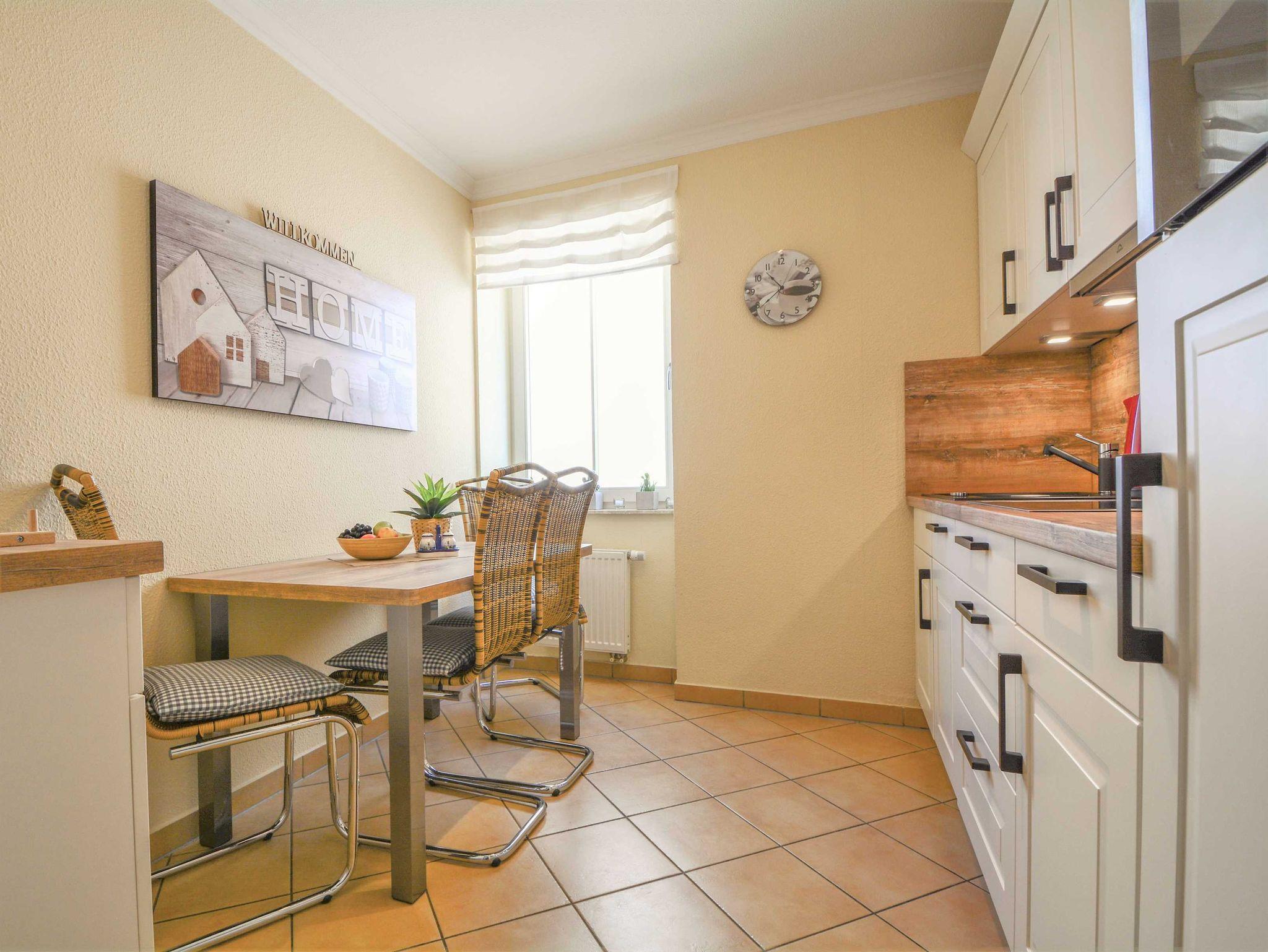 In der separaten Küche finden Sie alle wichtigen Küchengeräte und -utensilien, die Sie für Ihr „perfektes Dinner“ benötigen: Ein 4-Zonen- Cerankochfeld, ein Backofen in bequemer Stehhöhe, eine Mikrowelle, eine Geschirrspülmaschine sowie ein Kühlschrank mit Gefrierfach befinden sich in der Küche. Eine Kaffeemaschine, ein Wasserkocher und ein Toaster sowie genügend Koch- und Essgeschirr vervollständigen die Kücheneinrichtung. Der integrierte Essbereich bietet Ihnen reichlich Platz für gemeinsame Mahlzeiten.