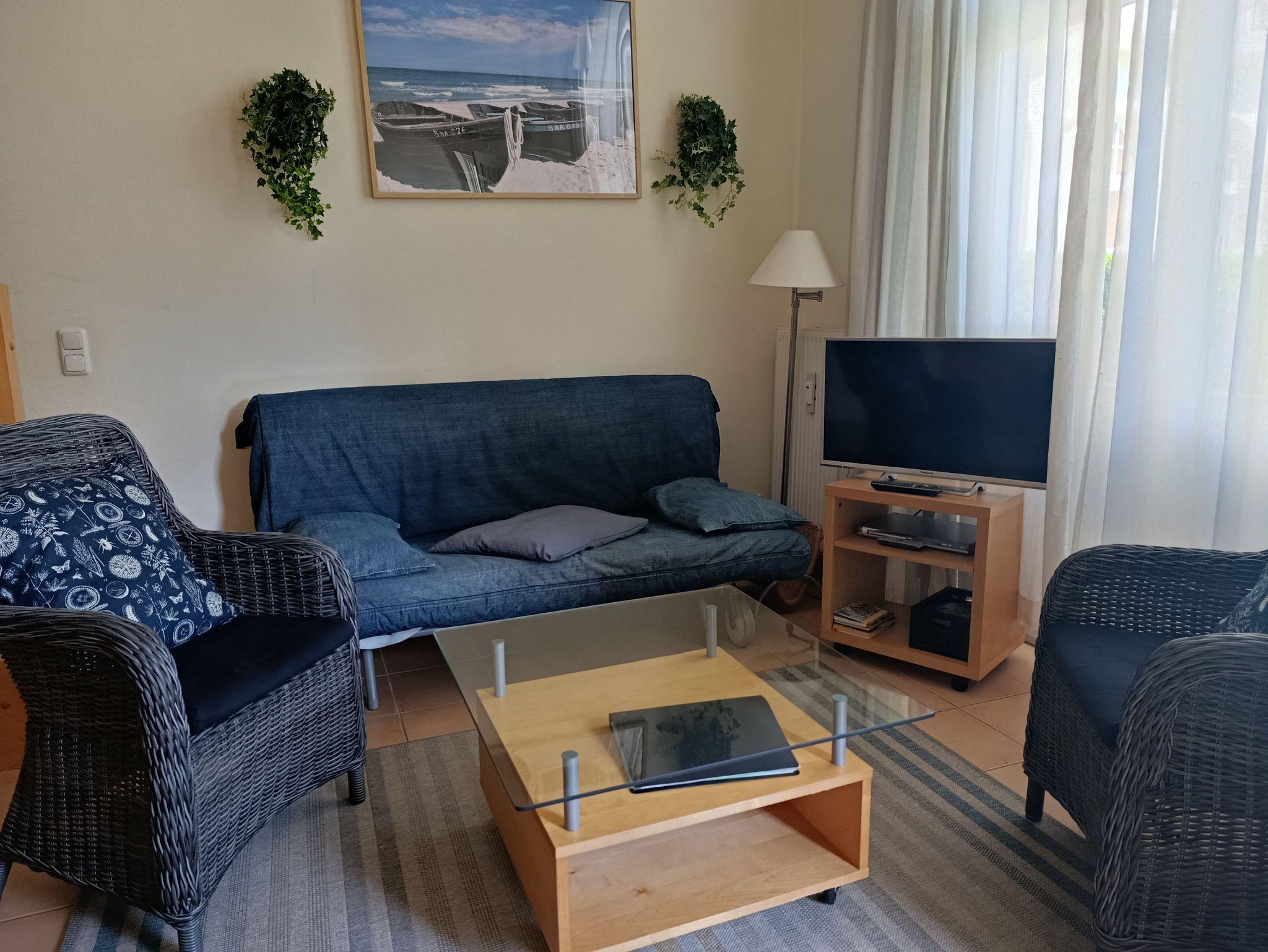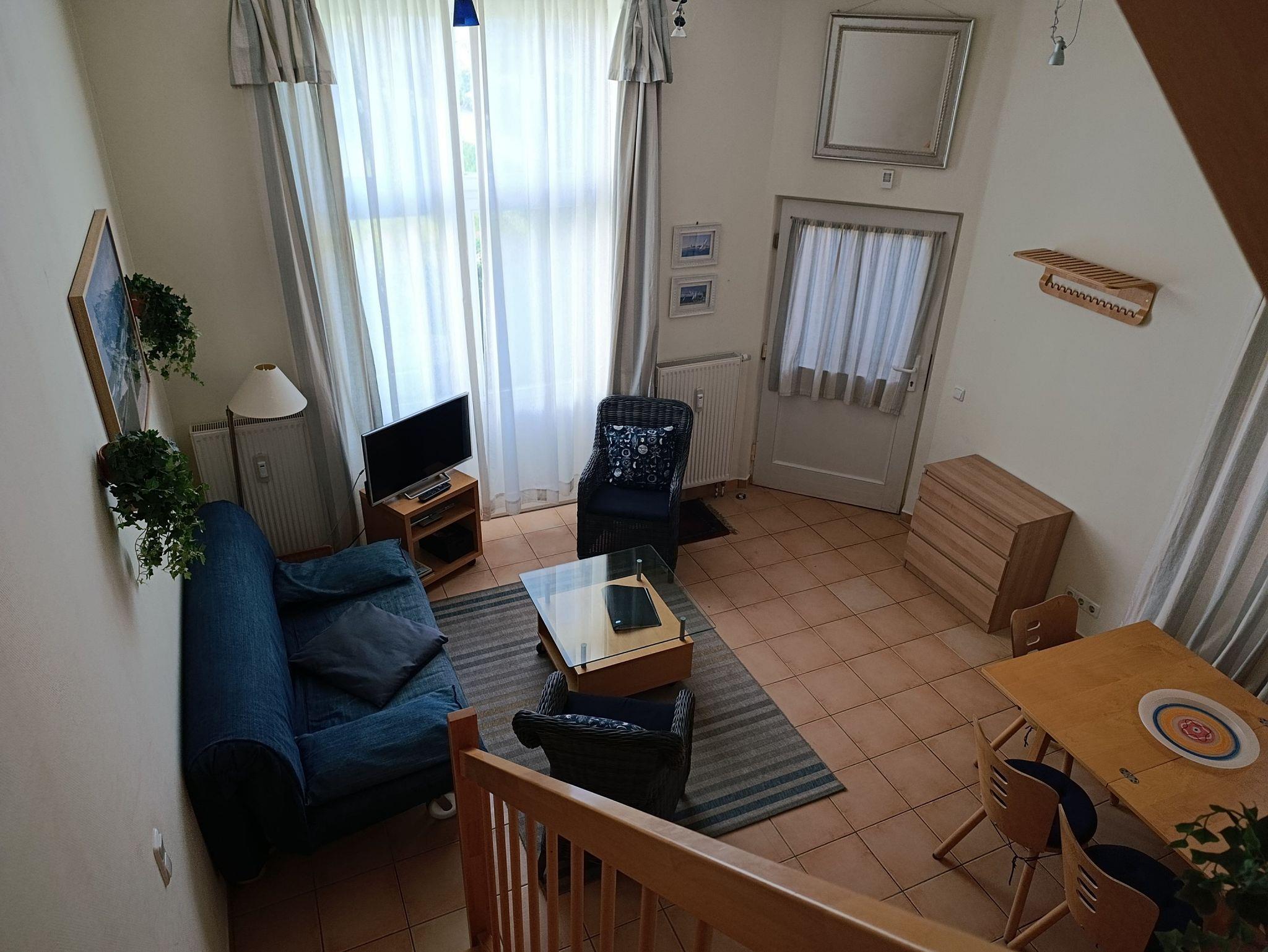 Nur 80 m vom Strand wohnen Sie in einer modern eingerichteten 2-Raum-Ferienwohnung. Die 40 qm große Wohnung liegt im Erdgeschoss und geht über zwei Etagen. Das Wohnzimmer ist mit einer Schlafcouch, Couchtisch, Anrichte, Regal, Kabel-TV, Radio, Essbereich (Esstisch und 4 Stühle) und Küchenzeile ausgestattet. Die Küchenzeile wurde modern ausgestattet mit Mikrowelle, Kühlschrank, Kaffeemaschine, Zwei-Platten-Kochfeld, Geschirrspüler, Toaster und Wasserkocher. Im Schlafzimmer, das Sie über eine Treppe in der Wohnung erreichen, stehen ein Doppelbett und ein Kleiderschrank. Das Bad mit Dusche und WC komplettiert die Wohnung. Die kleine Terrasse geht zur Nordseite.