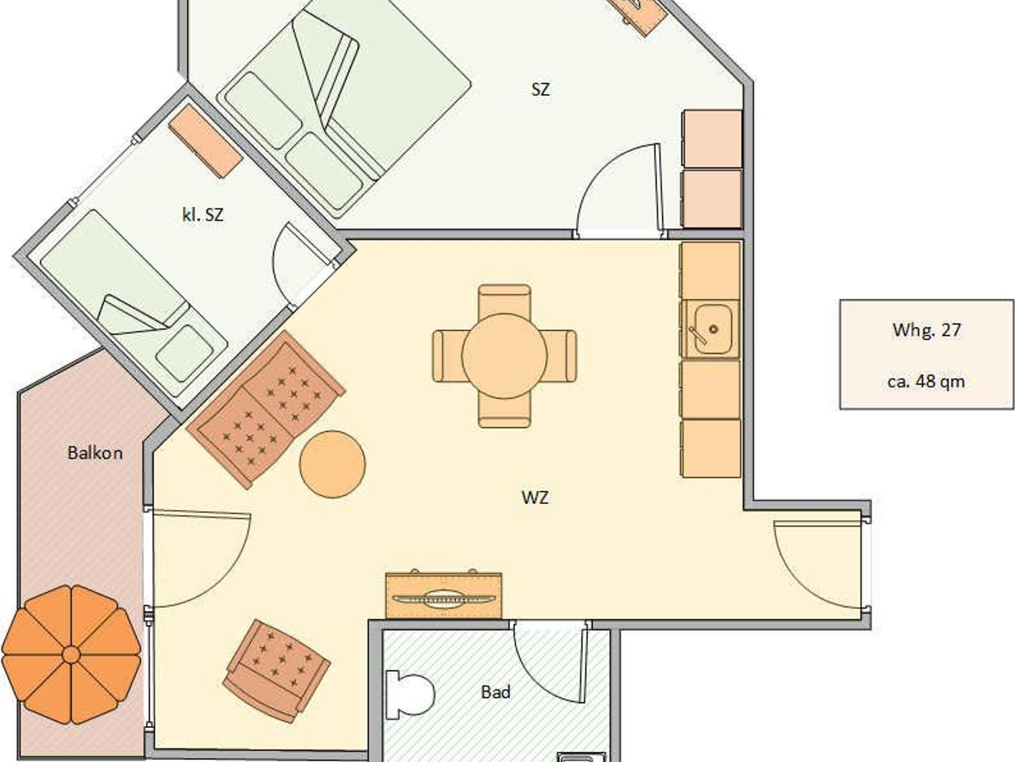 Die Wohnung ist im 1. Obergeschoss gelegen und hat einen Balkon zu Ostseite. Die Wohnungsgröße beträgt ca. 48 qm und teilt sich in Wohnzimmer, Küche, Schlafzimmer, kl. Kinderzimmer, Duschbad und Flur. Im Wohnzimmer befindet sich ein Esstisch mit 4 Stühlen, Küche mit Cerankochfeld, Geschirrspüler, Kühlschrank, Tresor, HD-Sat TV und Telefon. Die Wohnung wurde modernisiert und neu eingerichtet.