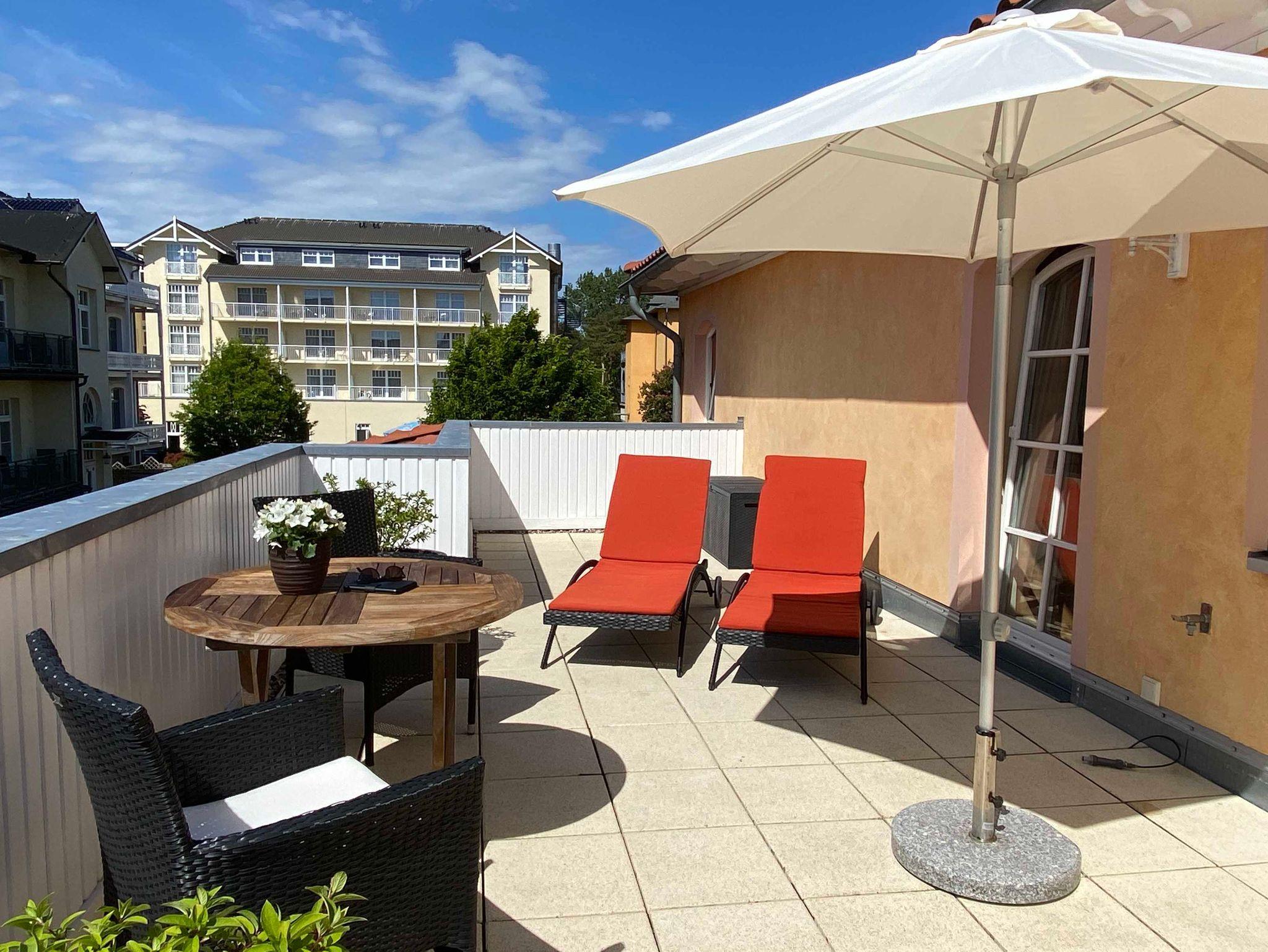 Vom Wohnbereich betreten Sie den möblierten großen Balkon, der nach Westen ausgerichtet ist. Hier können Sie Sonne tanken, relaxen und den Abend nach einem schönen Tag am Meer ausklingen lassen.