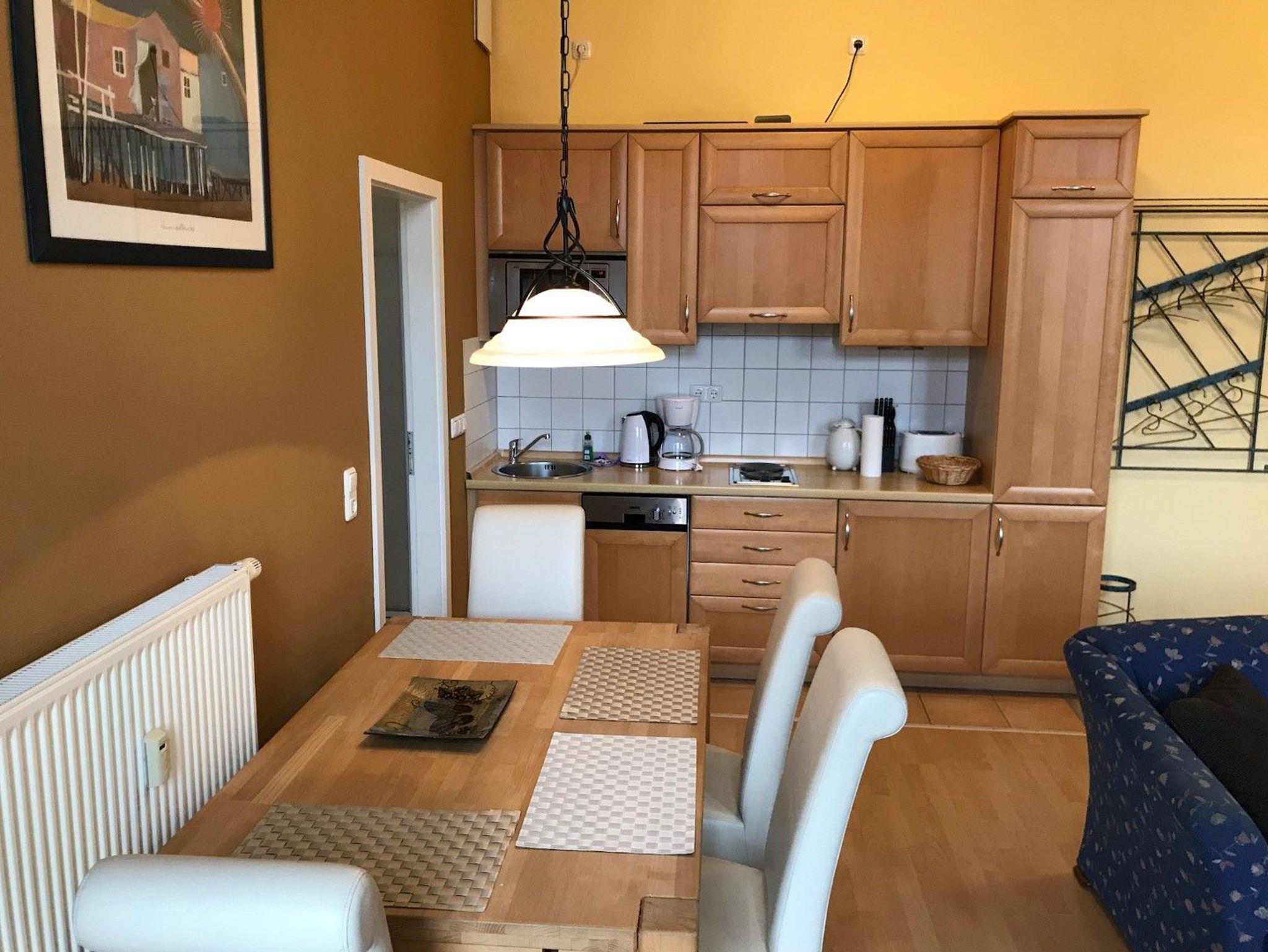 Die Wohnküche ist mit einem 2 Zonen E-Herd, Geschirrspüler und einer Mikrowelle ausgestattet. Kleinere Haushaltsgeräte wie eine Kaffemaschine, ein Toaster und ein Wasserkocher, sinst selbstverständlich auch vorhanden.