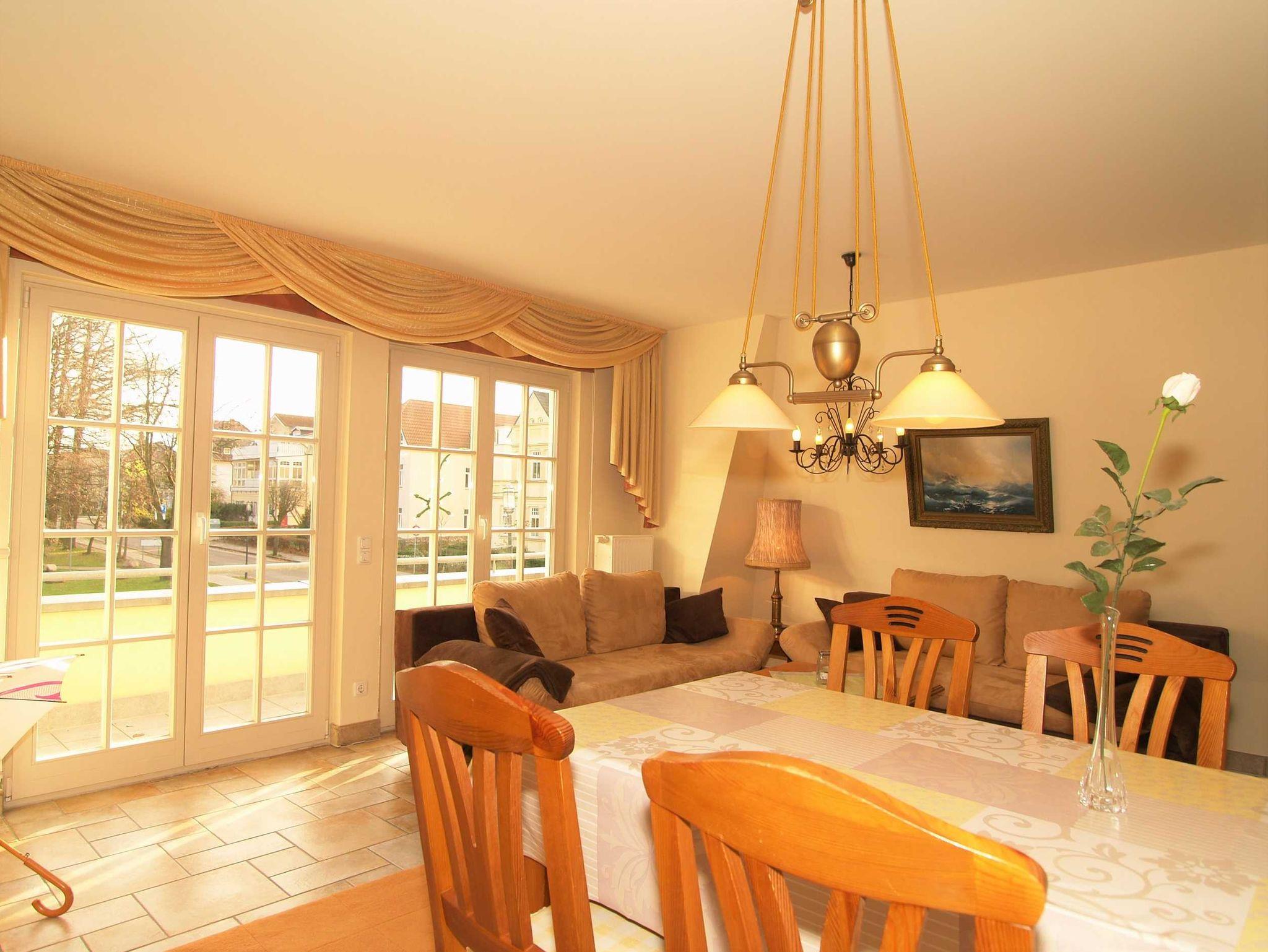 Sie wohnen in einer exklusiv eingerichteten 3-Raum-Wohnung von ca. 55 qm Größe, die im ersten Obergeschoss liegt. Das Wohnzimmer ist ausgestattet mit Küchenzeile (Herd mit Backofen, Geschirrspüler, Kaffeemaschine, Wasserkocher), bequemer Sitzgarnitur, Essecke, Stereoanlage und TV-Gerät. Vom Wohnraum aus betreten Sie den Balkon in Richtung Osten, von wo aus Sie einen seitlichen Blick auf das Meer haben. Ein Schlafzimmer mit Doppelbett und ein Schlafzimmer mit Etagenbett sowie das Bad mit Dusche und WC vervollständigen das Gesamtbild dieser Wohnung.