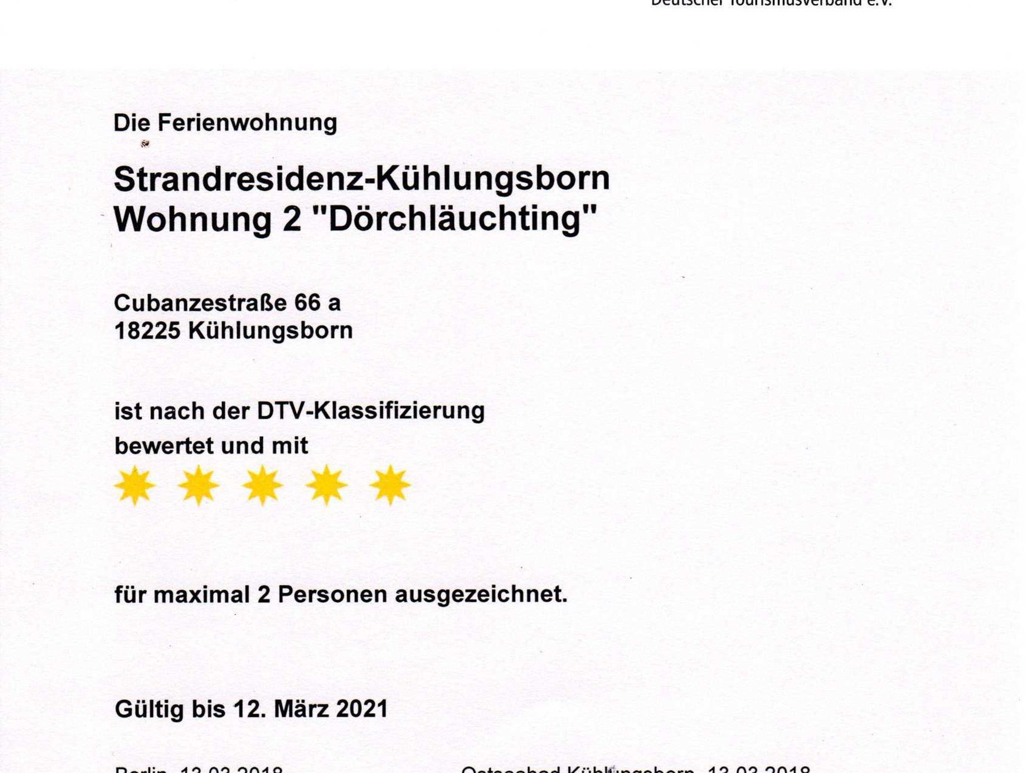 Die 7 Wohnungen gehören zu den Flaggschiffen der vom DTV zertifizierten deutschen Ferienwohnungen mit 1.216 bis zu 1.331 vergebenen Punkten. 5 Sterne gibt es ab 900 Punkte.