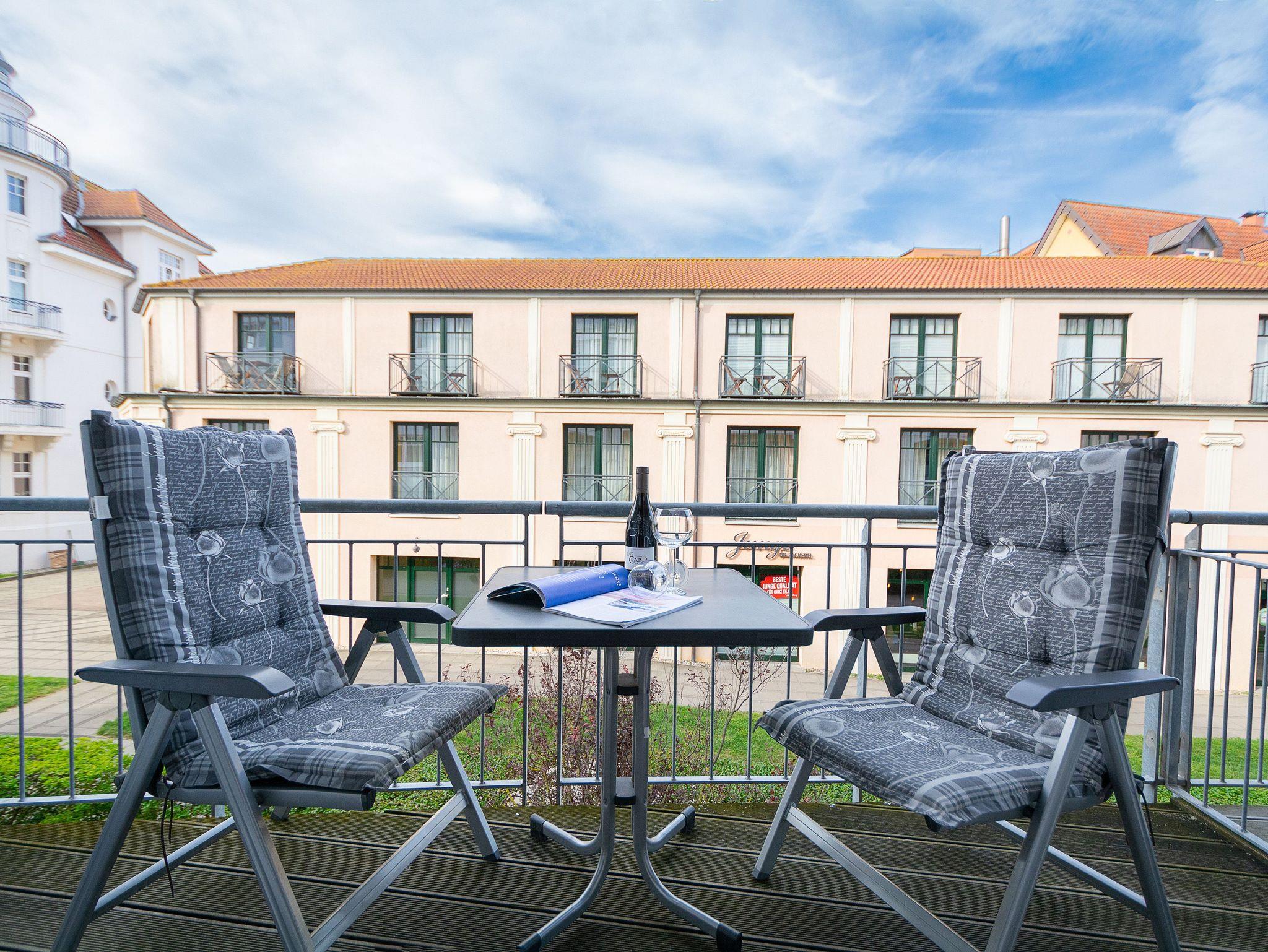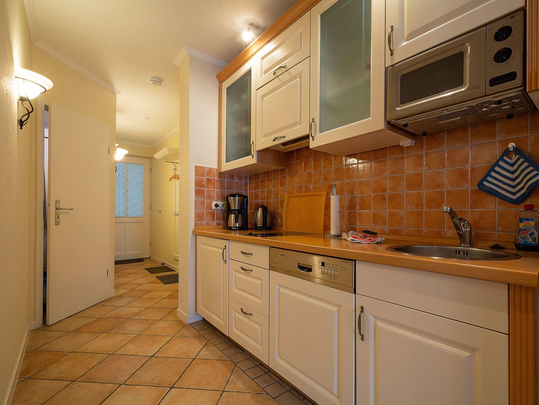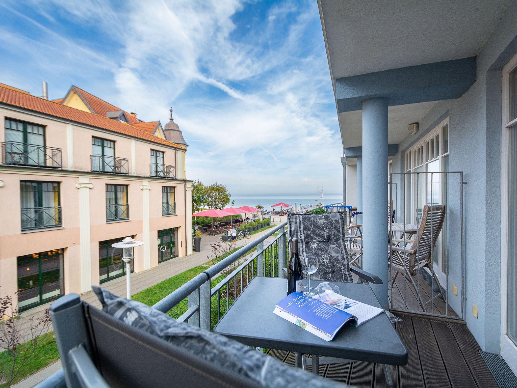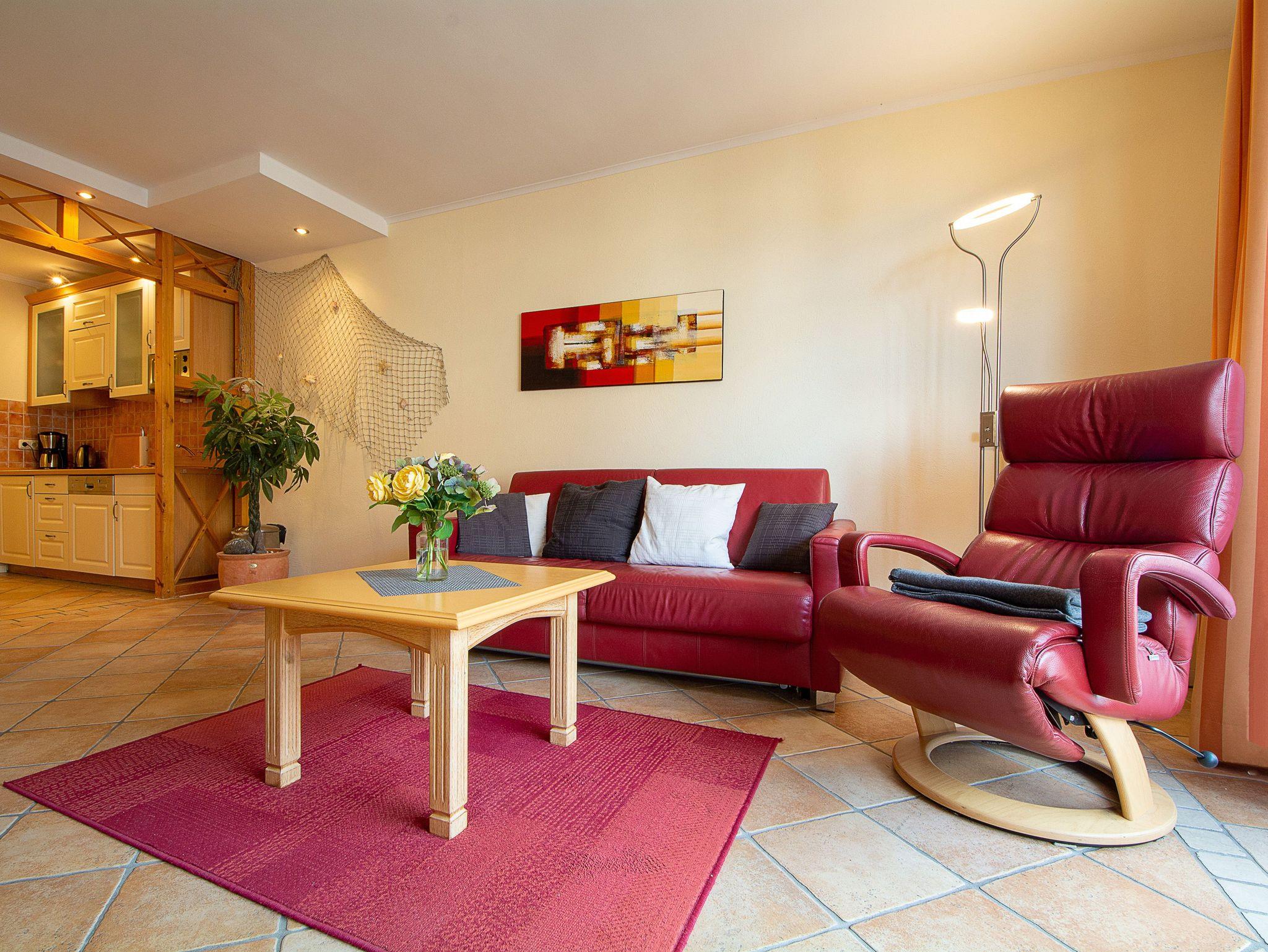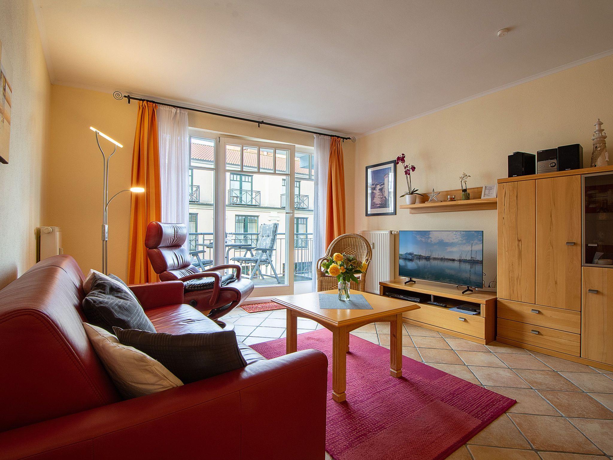 Herzlich Willkommen in unserer liebevoll eingerichteten Ferienwohnung Nr. 1.18 im Haus Meeresblick. Die gemütliche 2-Raum-Ferienwohnung von etwa 50qm Größe befindet sich auf der westlichen Seite des Hauses Meeresblick im ersten Obergeschoss und ist hervorragend für 2 Personen geeignet. Die Wohnung bietet all jenen Komfort, den der anspruchsvolle Gast für seinen erholsamen Urlaub erwartet. Es begrüßt Sie ein freundlicher offener Wohn- und Essbereich mit Ledersofa, Relax-Sessel, 43-Zoll-QLED-Flachbildfernseher, Blu-ray-Player, Stereoanlage etc.. Für die seltenen Regentage sind mehrere DVD's und eine Spielesammlung vorhanden. Die offene Küchenzeile ist mit allen wichtigen Küchengeräten ausgestattet, die Sie für Ihr „perfektes Dinner“ benötigen: Geschirrspüler, Kühlschrank mit Eisfach, 2 Platten-Kochfeld, Mikrowelle, Kaffeemaschine, Wasserkocher, Toaster sowie reichlich Geschirr, Gläser, Besteck und Kochutensilien sind vorhanden. Vom Wohnbereich betreten Sie den möblierten West-Balkon mit herrlichem seitlichen Ausblick über die Strandpromenade auf die Ostsee. Von hier können Sie den Abend zu einem Gläschen Wein ausklingen lassen. Im zum bepflanzten Atrium des Hauses ausgerichteten Schlafzimmer befinden sich ein Doppelbett (1,60 m), ein Kleiderschrank sowie ein 32-Zoll-Fernseher. Zusätzlich ist es auch sehr bequem möglich, auf der modernen und stabilen Leder-Schlafcouch (mit durchgängiger Bultex-Matratze) zu übernachten. Das moderne Bad ist funktionell eingerichtet mit flacher Duschwanne, einem in massivem Eichenholz eingelassenen Waschtisch, WC, großflächigem Spiegel sowie einem Fön.
