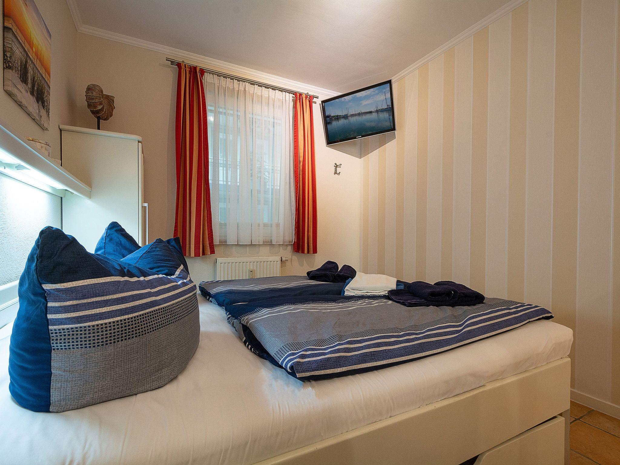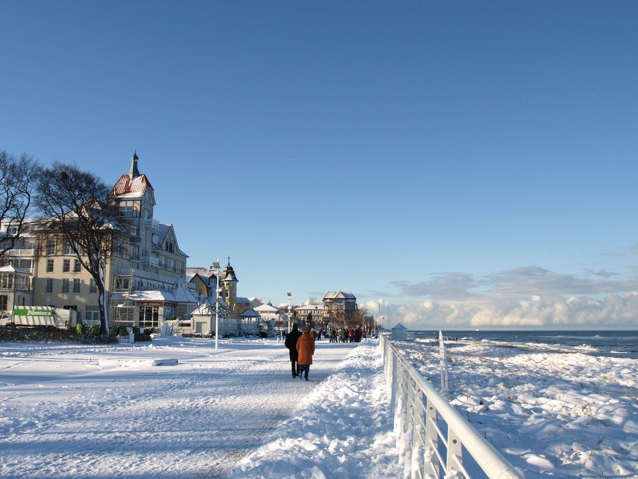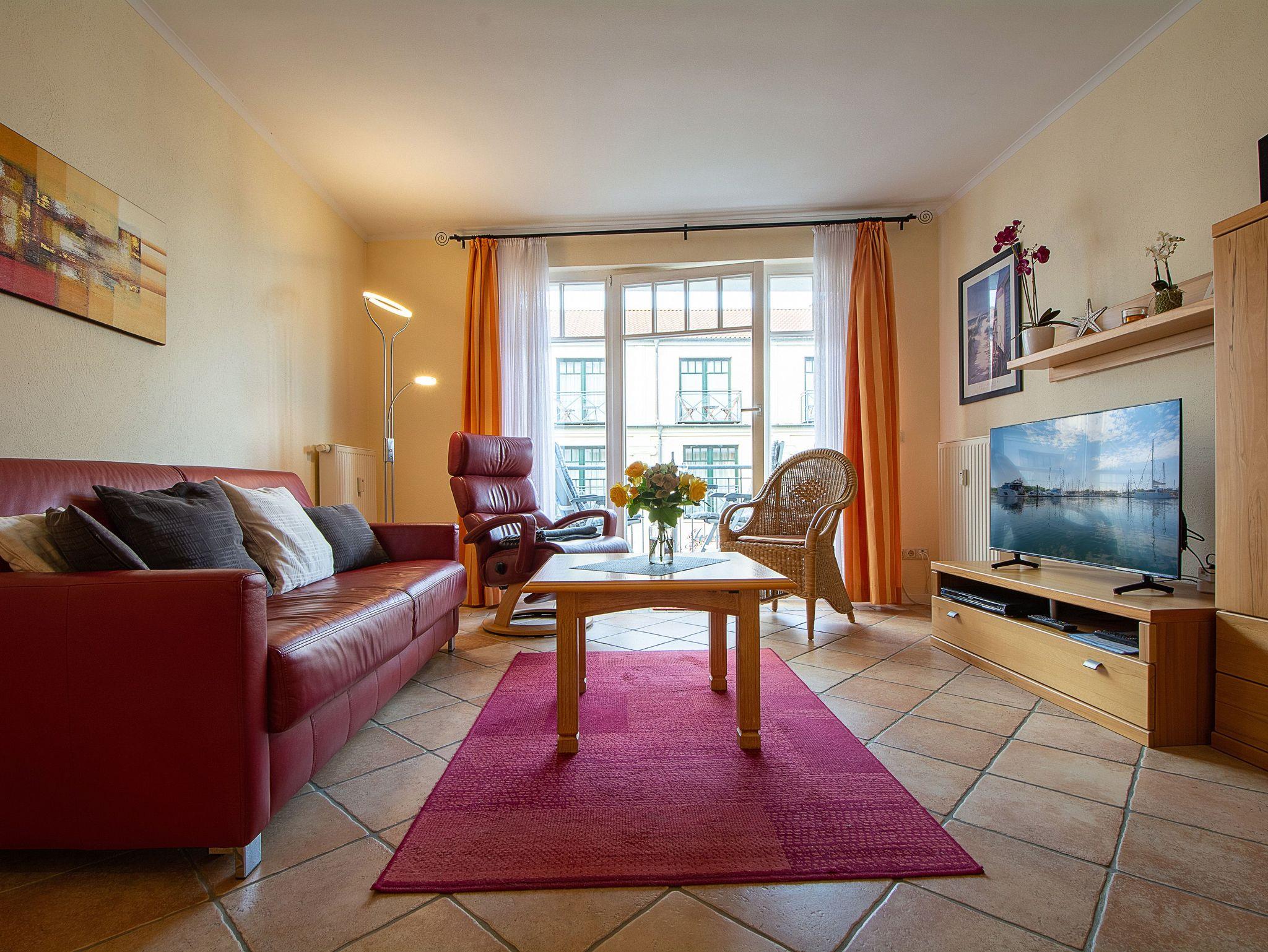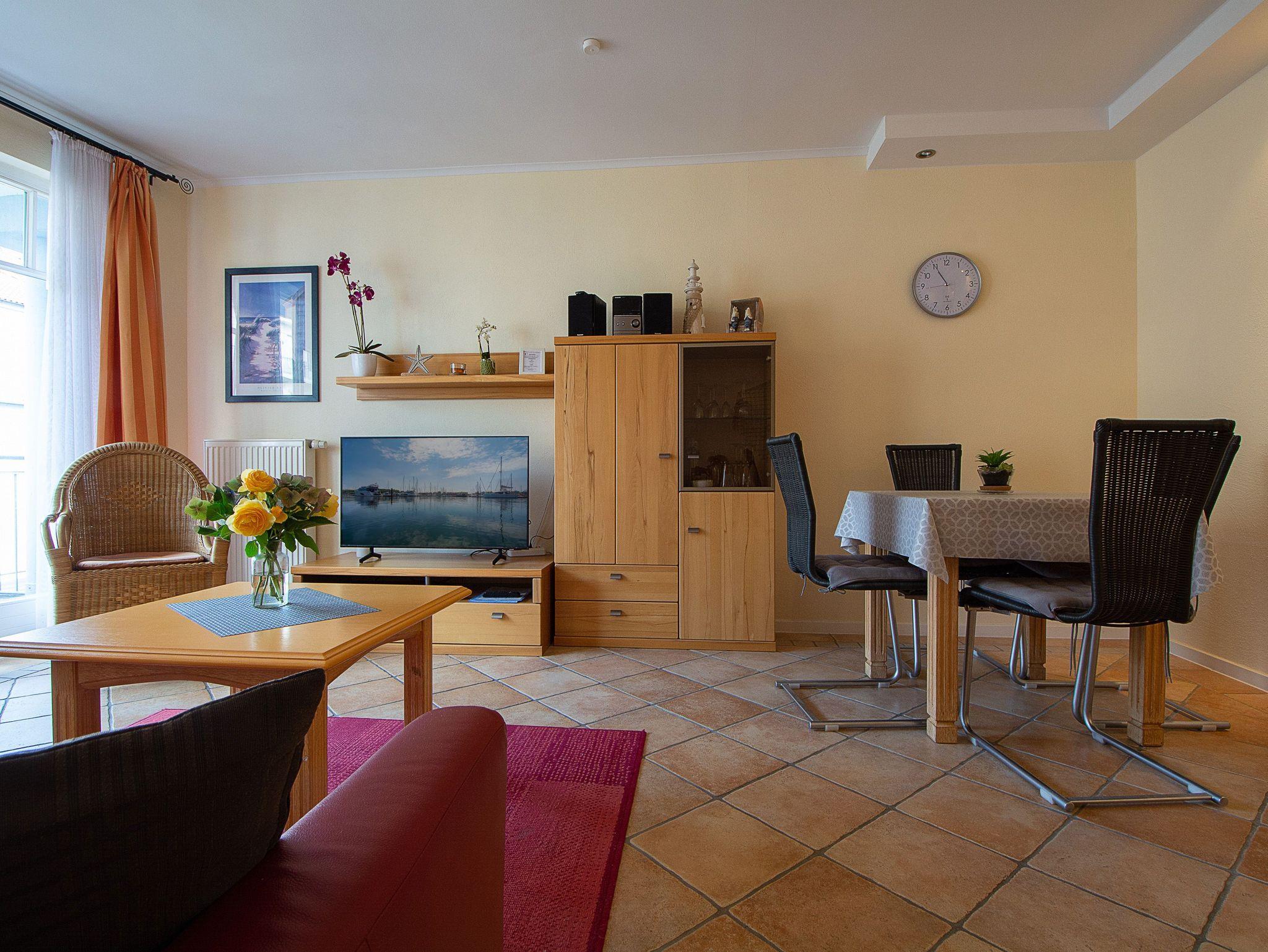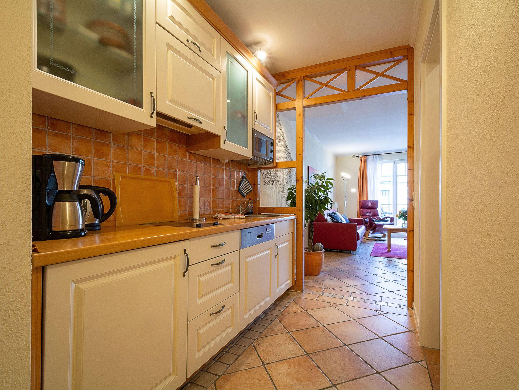 Herzlich Willkommen in unserer liebevoll eingerichteten Ferienwohnung Nr. 1.18 im Haus Meeresblick. Die gemütliche 2-Raum-Ferienwohnung von etwa 50qm Größe befindet sich auf der westlichen Seite des Hauses Meeresblick im ersten Obergeschoss und ist hervorragend für 2 Personen geeignet. Die Wohnung bietet all jenen Komfort, den der anspruchsvolle Gast für seinen erholsamen Urlaub erwartet. Es begrüßt Sie ein freundlicher offener Wohn- und Essbereich mit Ledersofa, Relax-Sessel, 43-Zoll-QLED-Flachbildfernseher, Blu-ray-Player, Stereoanlage etc.. Für die seltenen Regentage sind mehrere DVD's und eine Spielesammlung vorhanden. Die offene Küchenzeile ist mit allen wichtigen Küchengeräten ausgestattet, die Sie für Ihr „perfektes Dinner“ benötigen: Geschirrspüler, Kühlschrank mit Eisfach, 2 Platten-Kochfeld, Mikrowelle, Kaffeemaschine, Wasserkocher, Toaster sowie reichlich Geschirr, Gläser, Besteck und Kochutensilien sind vorhanden. Vom Wohnbereich betreten Sie den möblierten West-Balkon mit herrlichem seitlichen Ausblick über die Strandpromenade auf die Ostsee. Von hier können Sie den Abend zu einem Gläschen Wein ausklingen lassen. Im zum bepflanzten Atrium des Hauses ausgerichteten Schlafzimmer befinden sich ein Doppelbett (1,60 m), ein Kleiderschrank sowie ein 32-Zoll-Fernseher. Zusätzlich ist es auch sehr bequem möglich, auf der modernen und stabilen Leder-Schlafcouch (mit durchgängiger Bultex-Matratze) zu übernachten. Das moderne Bad ist funktionell eingerichtet mit flacher Duschwanne, einem in massivem Eichenholz eingelassenen Waschtisch, WC, großflächigem Spiegel sowie einem Fön.