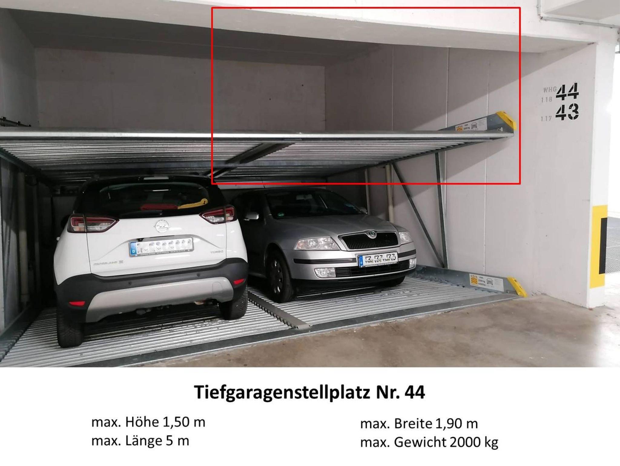 Zur Wohnung gehört ein Tiefgaragenstellplatz mit der Stellplatznummer 44. Dabei handelt es sich um eine Doppelparkeranlage (Standardanlage bei Stellplatzbreite 2,30 m, obere Plattform). Auf der oberen Plattform dürfen Pkw über 1,50 m Höhe und Kombi nicht abgestellt werden. Bitte beachten Sie, dass Ihr Pkw folgende Angaben nicht überschreitet: