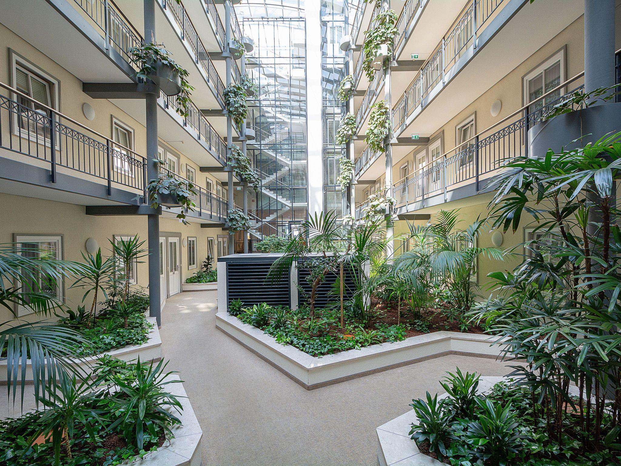 Zu Ihrer Wohnung gelangen Sie von der Tiefgarage bequem über einen gläsernen Personenaufzug und durch das wunderschön bepflanzte lichtdurchflutete Atrium.