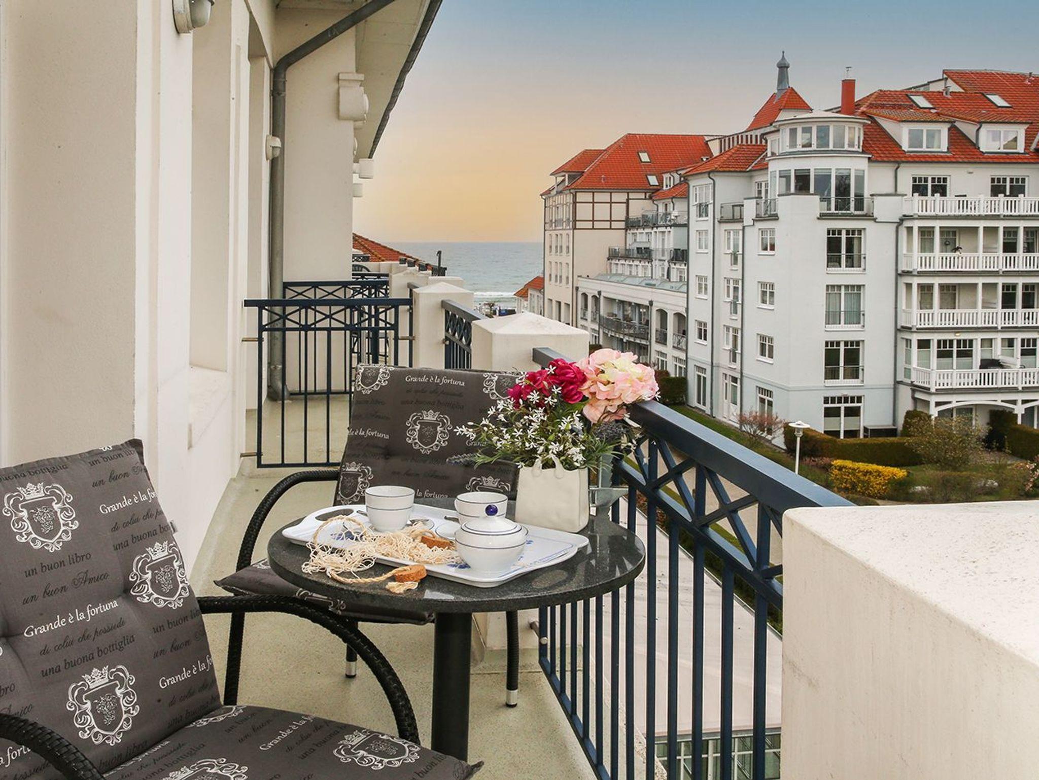 Den Balkon können Sie vom Wohnbereich als auch vom Schlafzimmer aus betreten. Sie haben Aussicht auf den Baltikpark mit altem Baumbestand und seitlich auf die Ostsee.