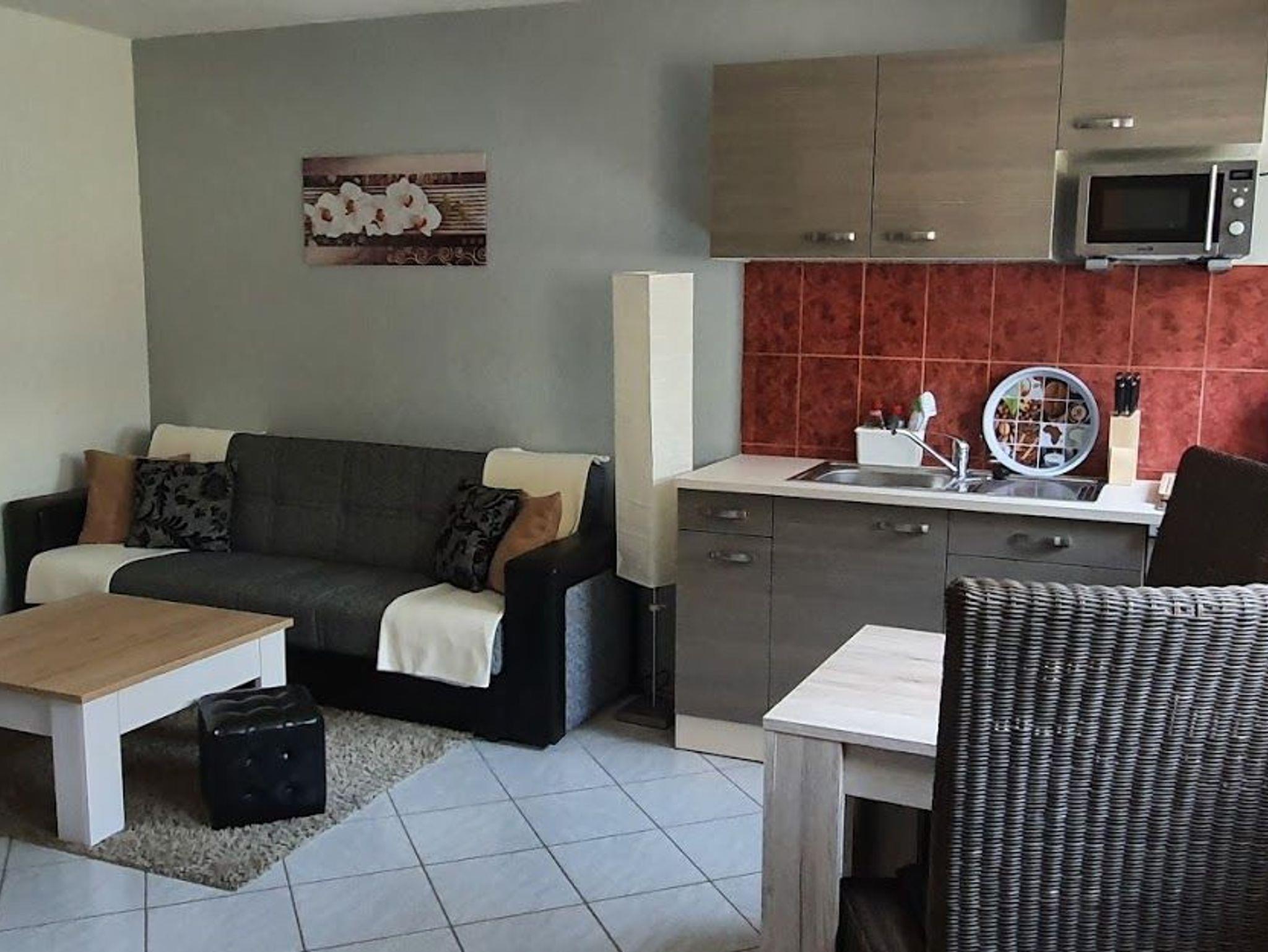 - Wohn/Schlafbereich mit Schlafcouch, integrierter Küche und Essbereich