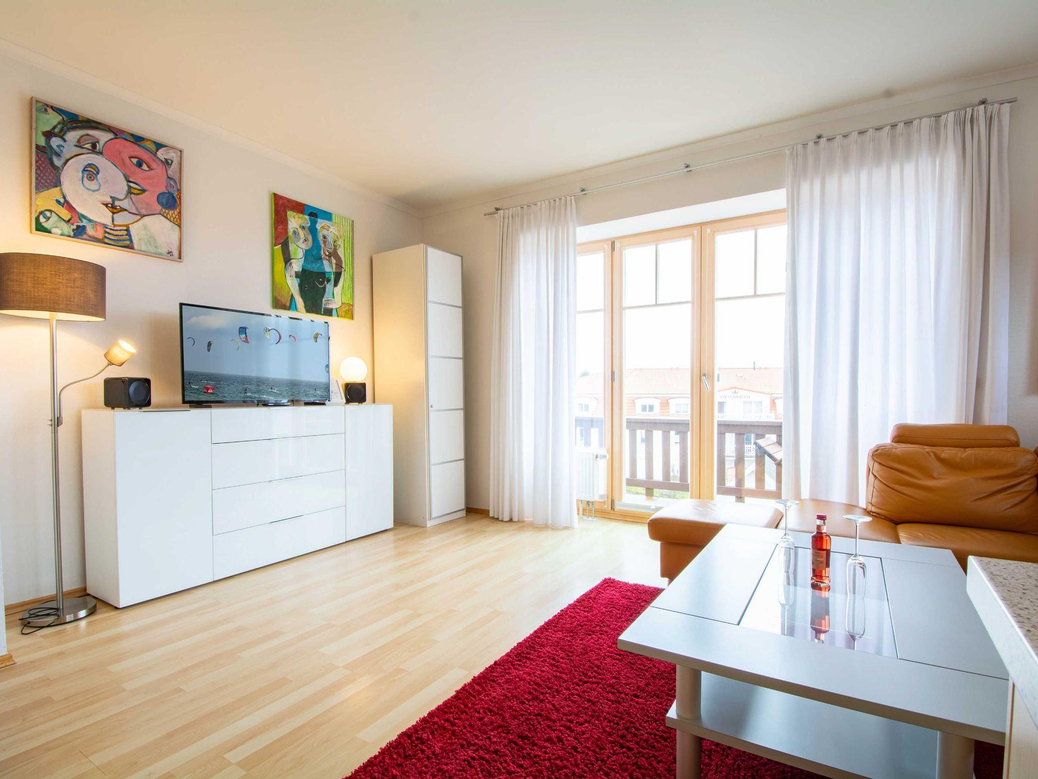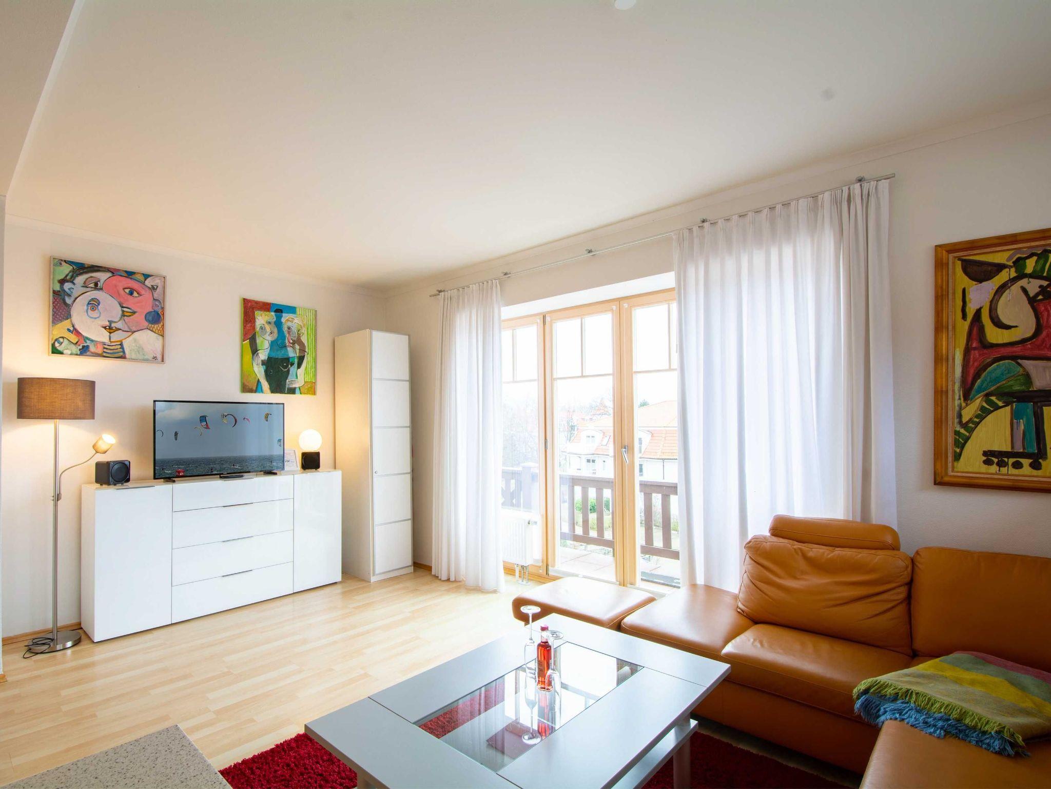 Der helle, offen gestaltete Wohnbereich überzeugt durch seinen besonderen Stil mit farbenfrohen Bildern und gemütlicher Couchgarnitur. Ein moderner 50-Zoll-Flachbild-TV sorgt für beste Unterhaltung. Vom Wohnbereich gelangen Sie direkt auf den nach Norden ausgerichteten Balkon, der zum Entspannen einlädt. Der Essbereich ist harmonisch integriert und bietet Platz für gemeinsame Mahlzeiten.