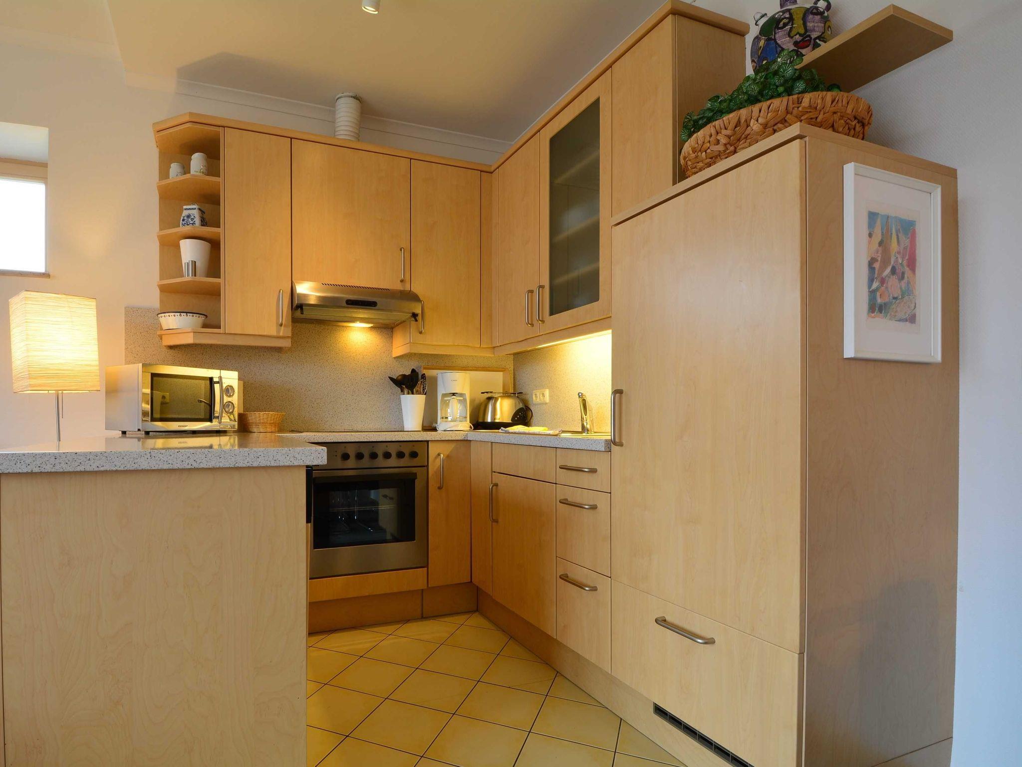 Die offene Küchenzeile bietet Ihnen alle wichtigen Geräte für einen sorgenfreien Aufenthalt: 4-Platten-Cerankochfeld, Backofen mit Dunstabzugshaube, Mikrowelle, Kühlschrank, Kaffeemaschine, Wasserkocher, Toaster und diverses Kochzubehör. Zudem stehen Reinigungsutensilien für Gäste bereit.