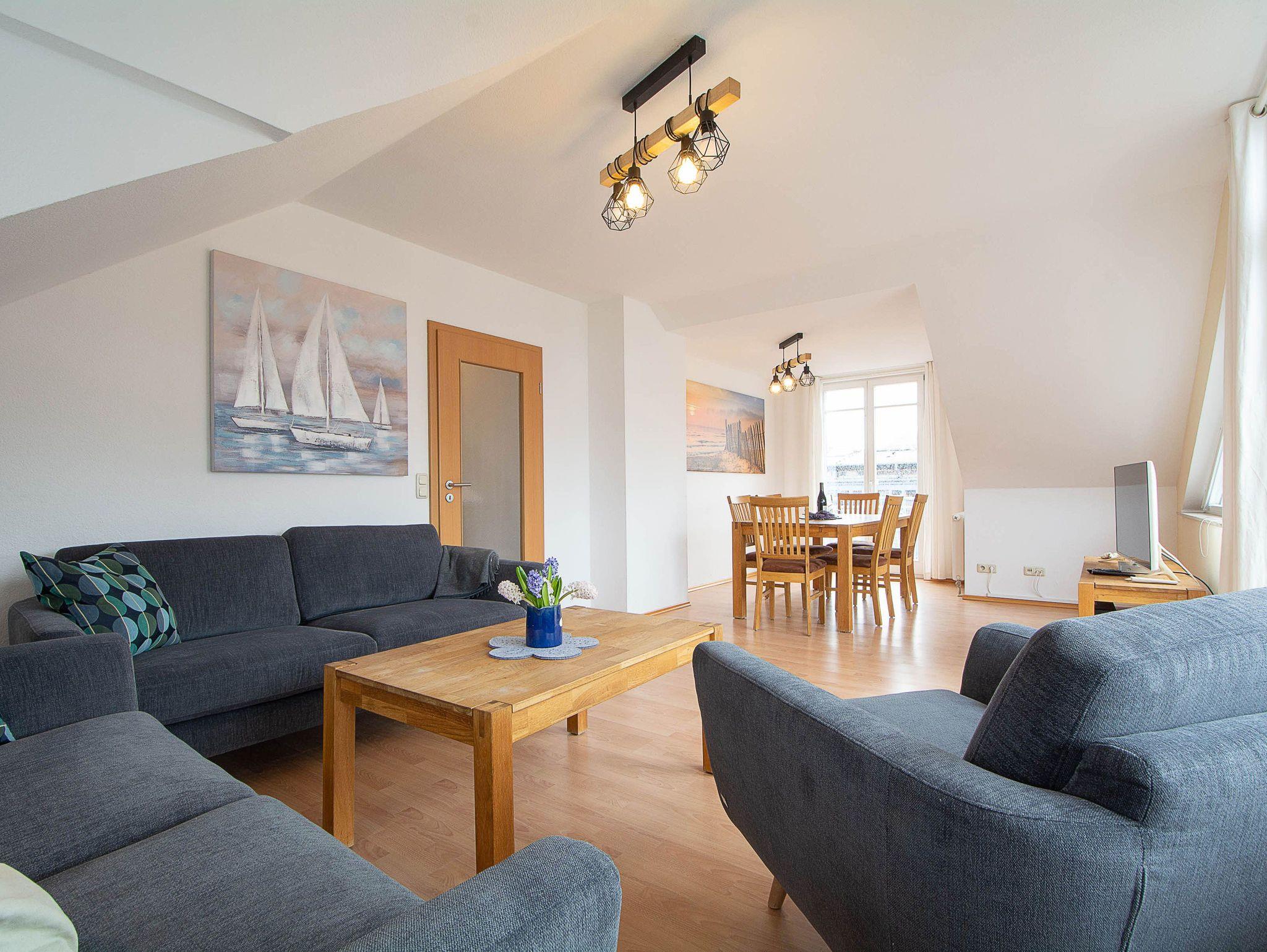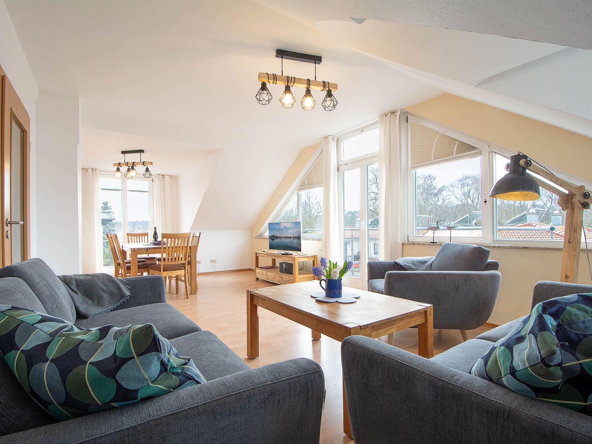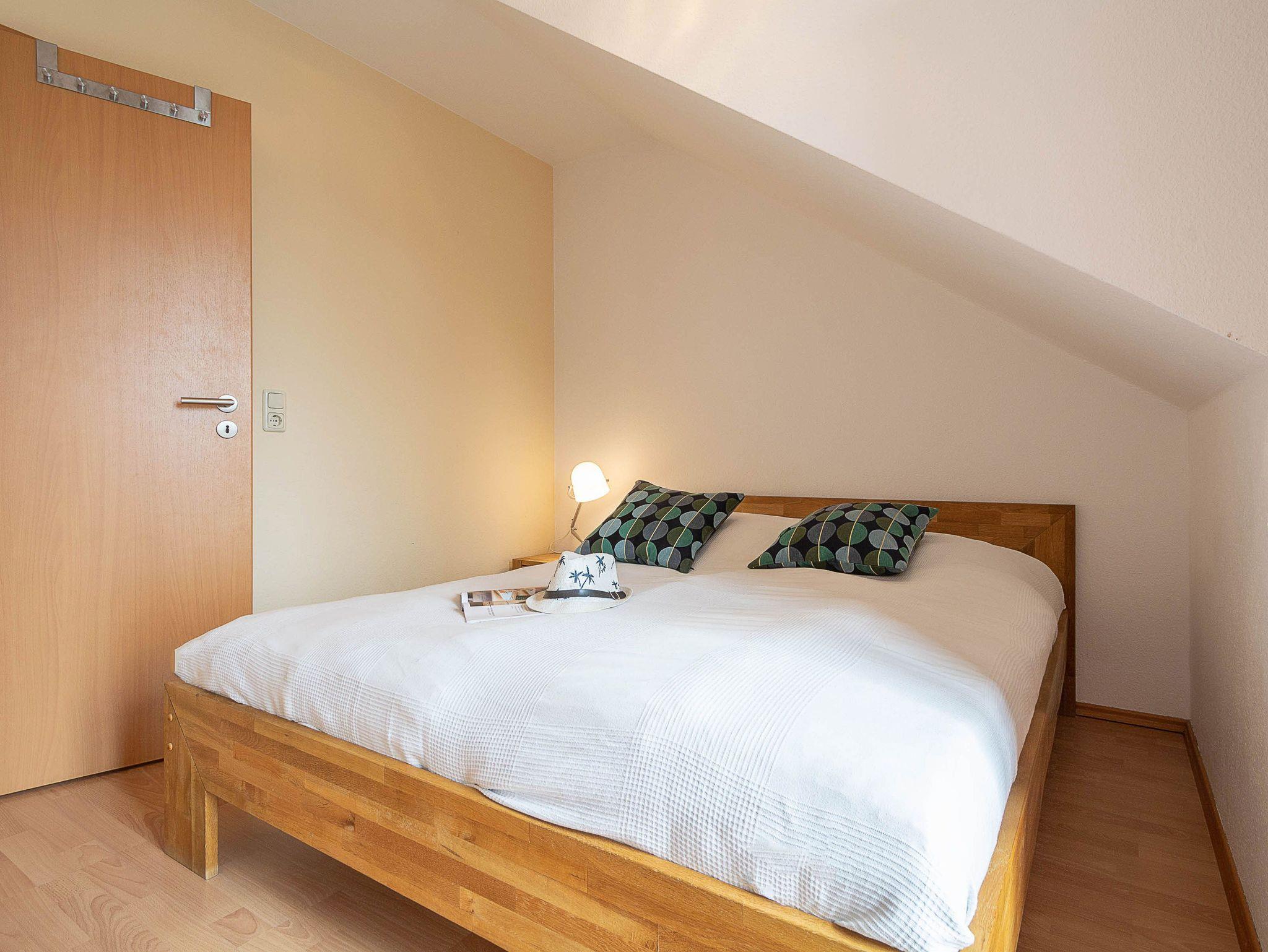 Sie wohnen in einer ca. 95 m² großen 4-Raum-Wohnung, die sich im 3. Obergeschoss befindet. Der Wohnraum mit Seeblick ist ausgestattet mit gemütlicher Sitzecke und 39-Zoll-Flachbild-TV. Von hier aus können Sie den Westbalkon (ebenfalls mit Seeblick) betreten. Der Südbalkon ist auch von zwei der Schlafzimmer erreichbar. Die separate Küche ist mit allen Geräten (Herd mit Backofen, Geschirrspüler, Kühlschrank mit Gefrierfach) ausgestattet. 3 Schlafräume mit jeweils Doppelbett (erstes Schlafzimmer 180 cm x 200 cm / zweites und drittes Schlafzimmer 160 cm x 200 cm), ein Bad mit Dusche, Wanne und WC sowie das 2. Bad mit WC vervollständigen das Gesamtbild dieser Wohnung.