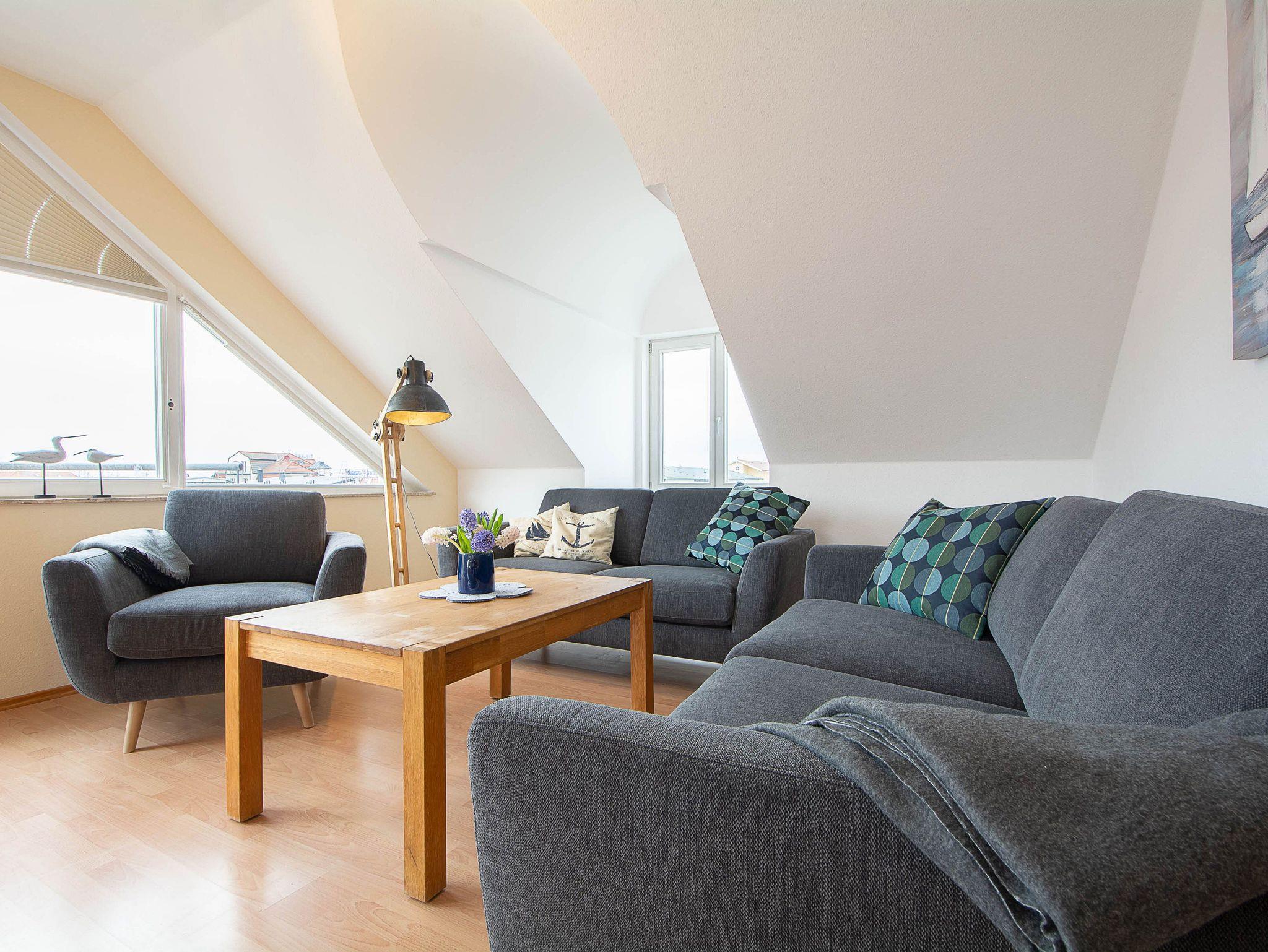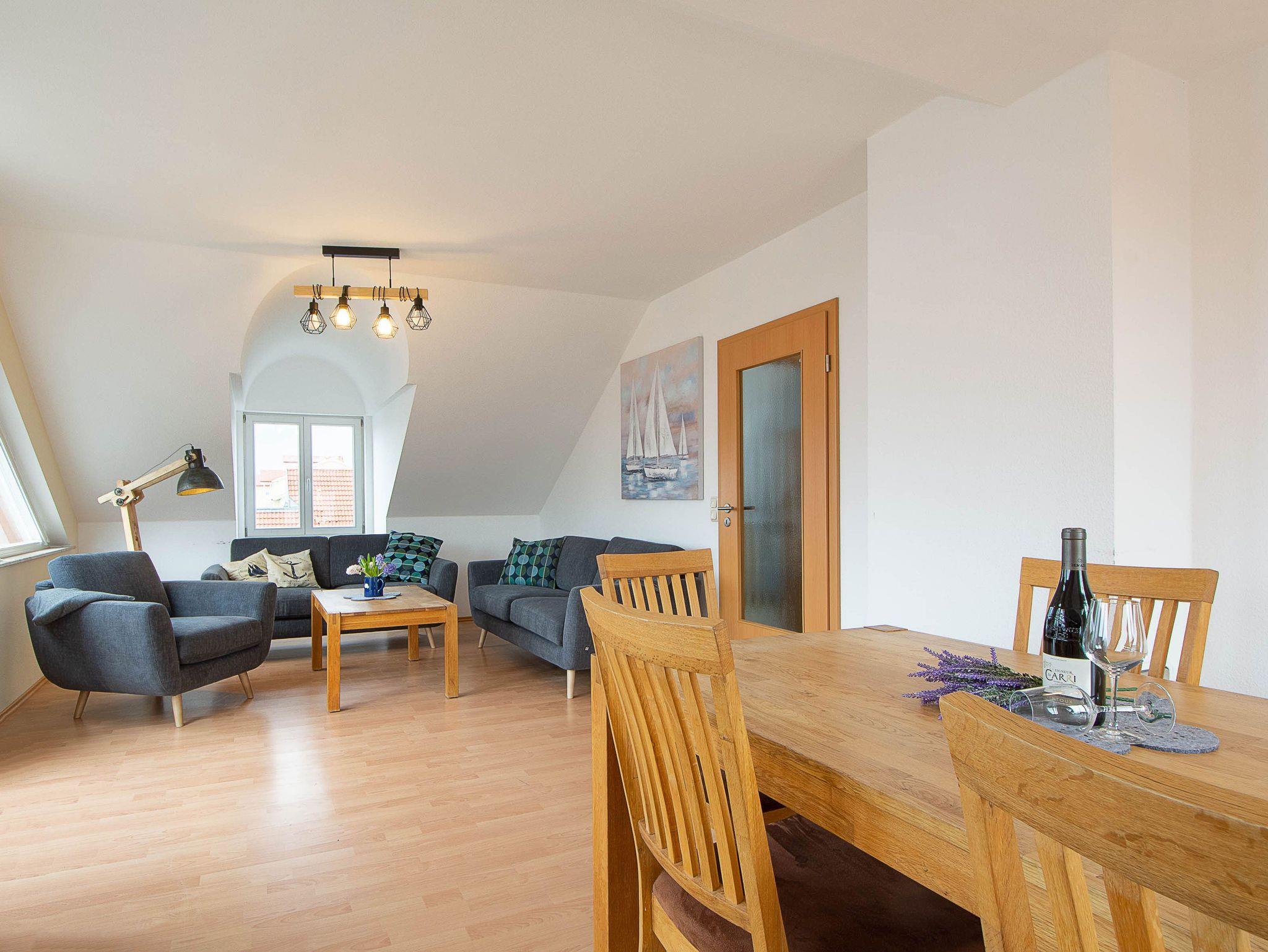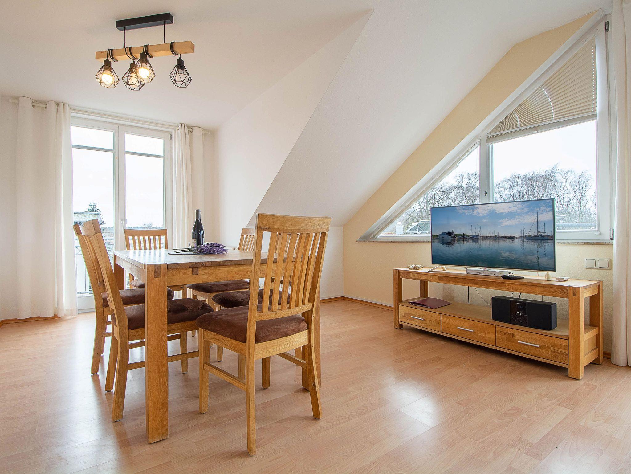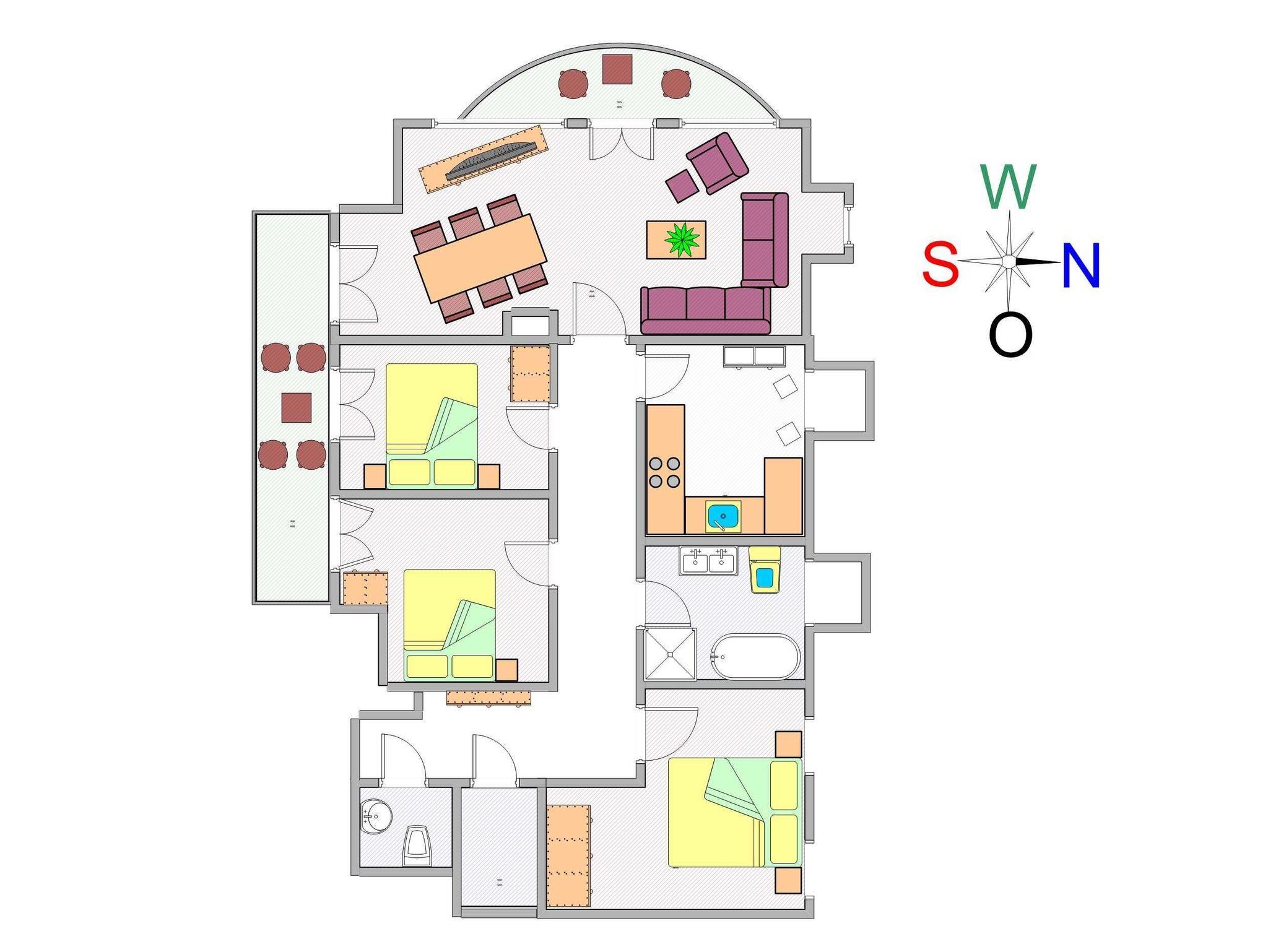 Sie wohnen in einer ca. 95 m² großen 4-Raum-Wohnung, die sich im 3. Obergeschoss befindet. Der Wohnraum mit Seeblick ist ausgestattet mit gemütlicher Sitzecke und 39-Zoll-Flachbild-TV. Von hier aus können Sie den Westbalkon (ebenfalls mit Seeblick) betreten. Der Südbalkon ist auch von zwei der Schlafzimmer erreichbar. Die separate Küche ist mit allen Geräten (Herd mit Backofen, Geschirrspüler, Kühlschrank mit Gefrierfach) ausgestattet. 3 Schlafräume mit jeweils Doppelbett (erstes Schlafzimmer 180 cm x 200 cm / zweites und drittes Schlafzimmer 160 cm x 200 cm), ein Bad mit Dusche, Wanne und WC sowie das 2. Bad mit WC vervollständigen das Gesamtbild dieser Wohnung.