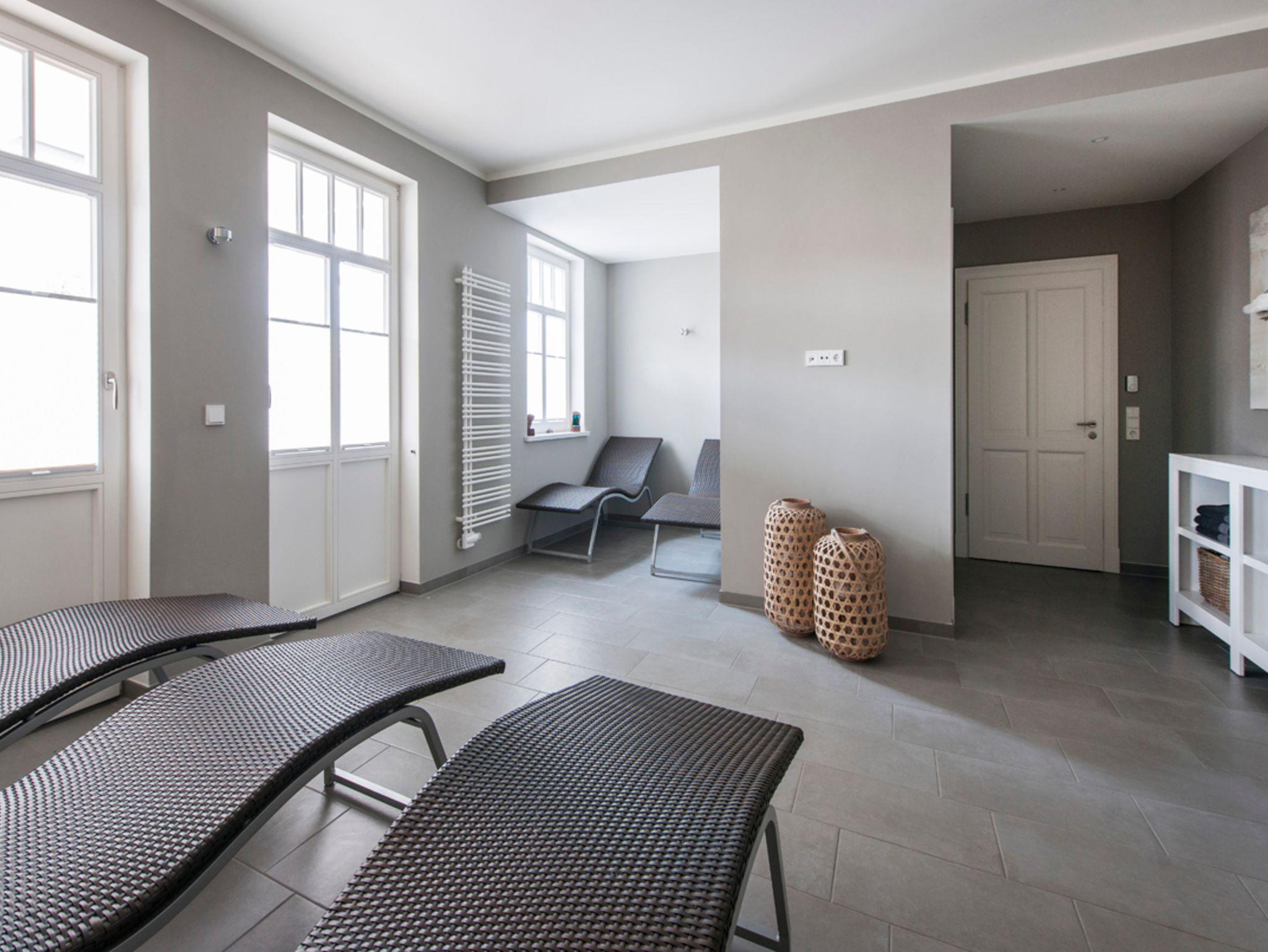 Zum Relaxen lädt der hochwertige Sauna- und Wellnessbereich ein, der sich im neuen Anbau der Villa befindet. Nach dem Saunagang können Sie sich im großzügigen Ruheraum erholen.