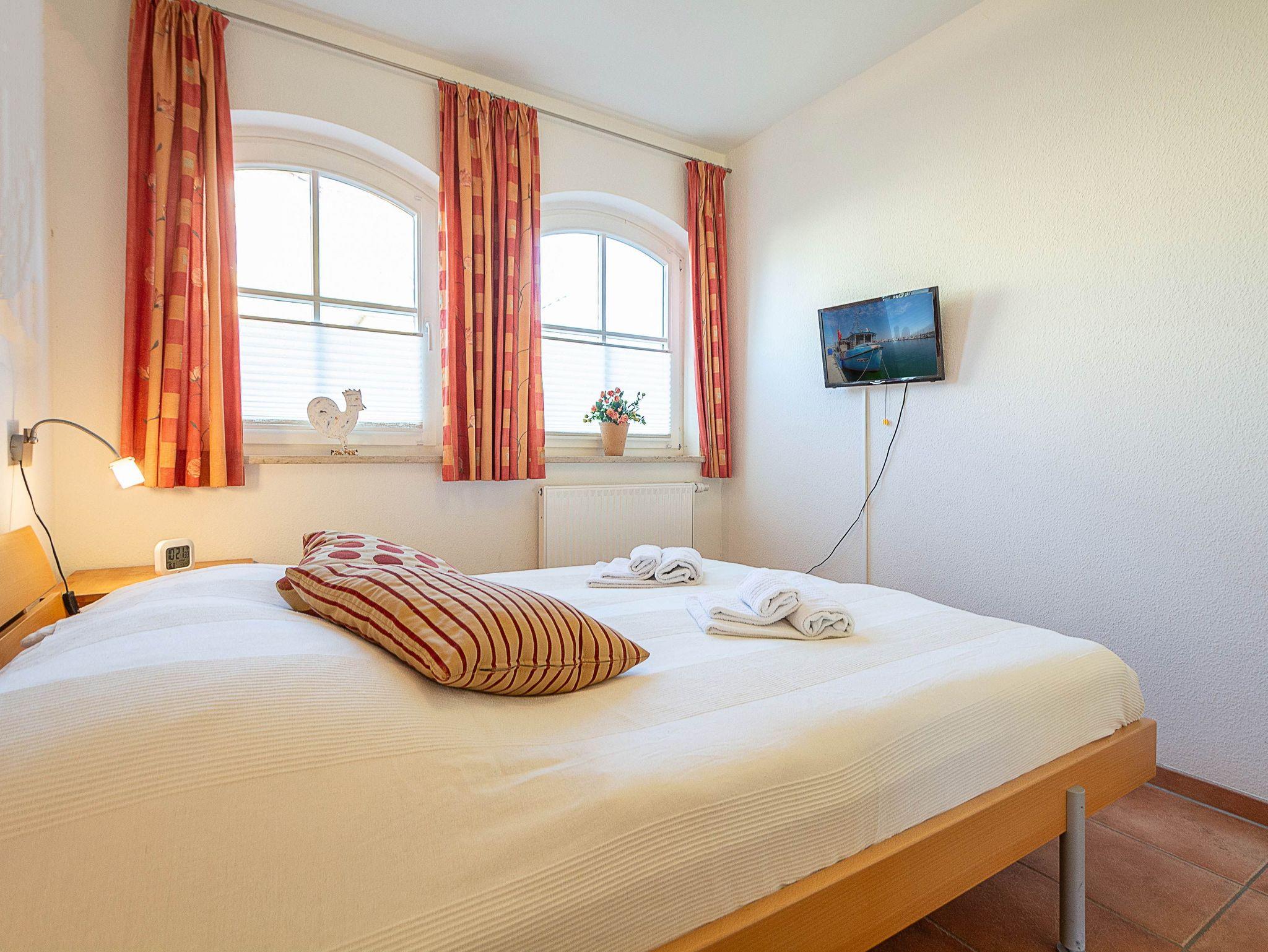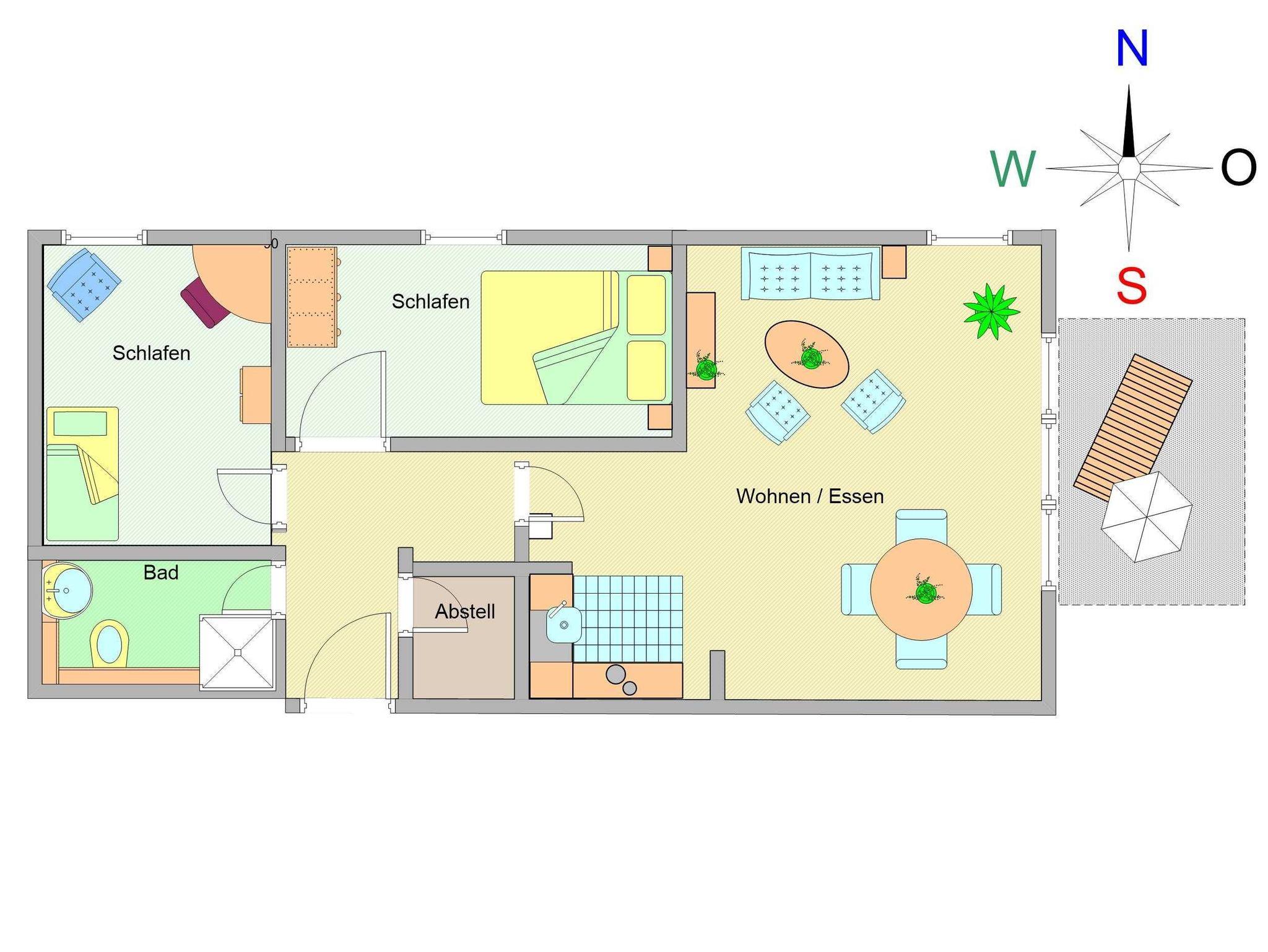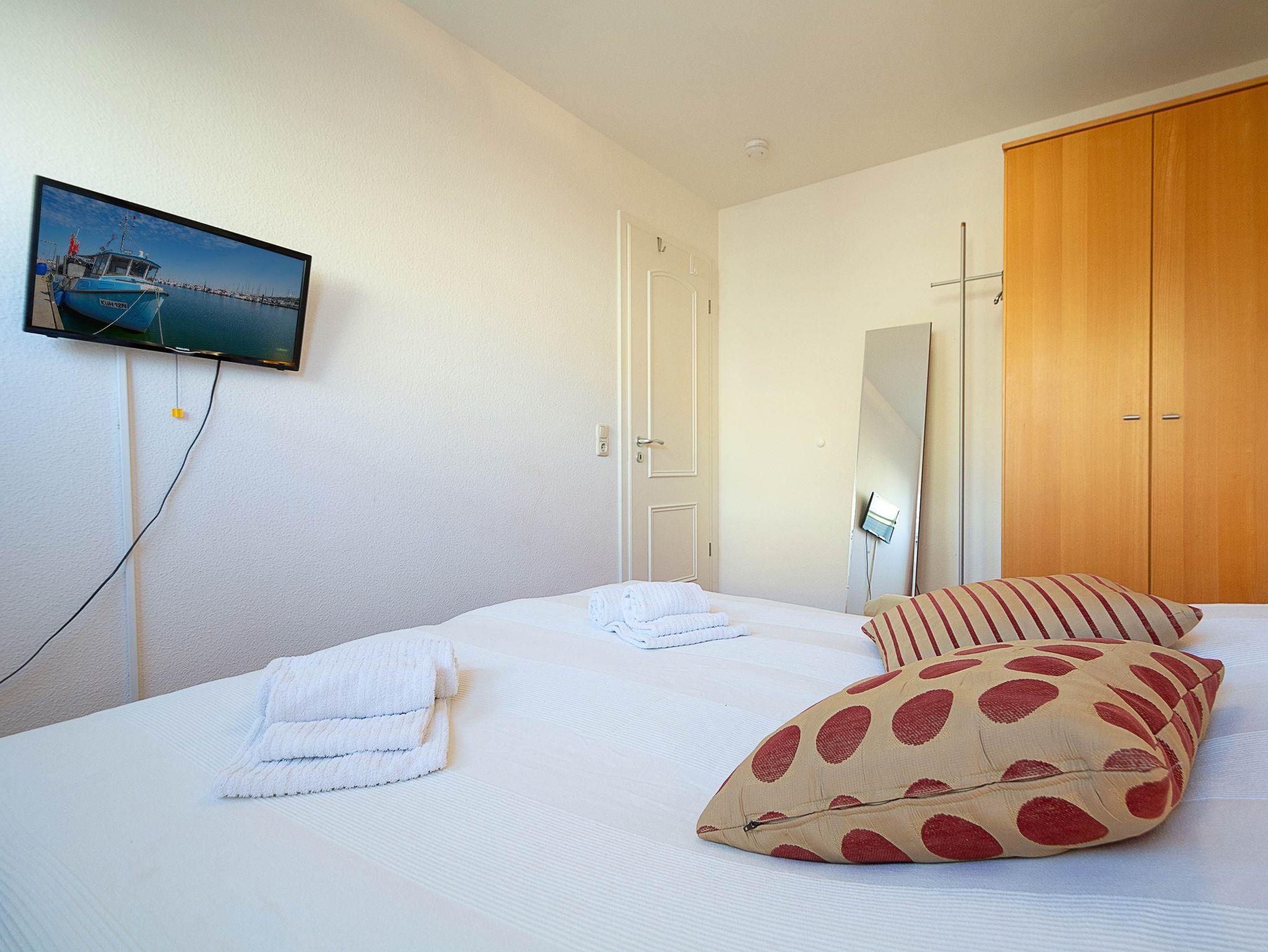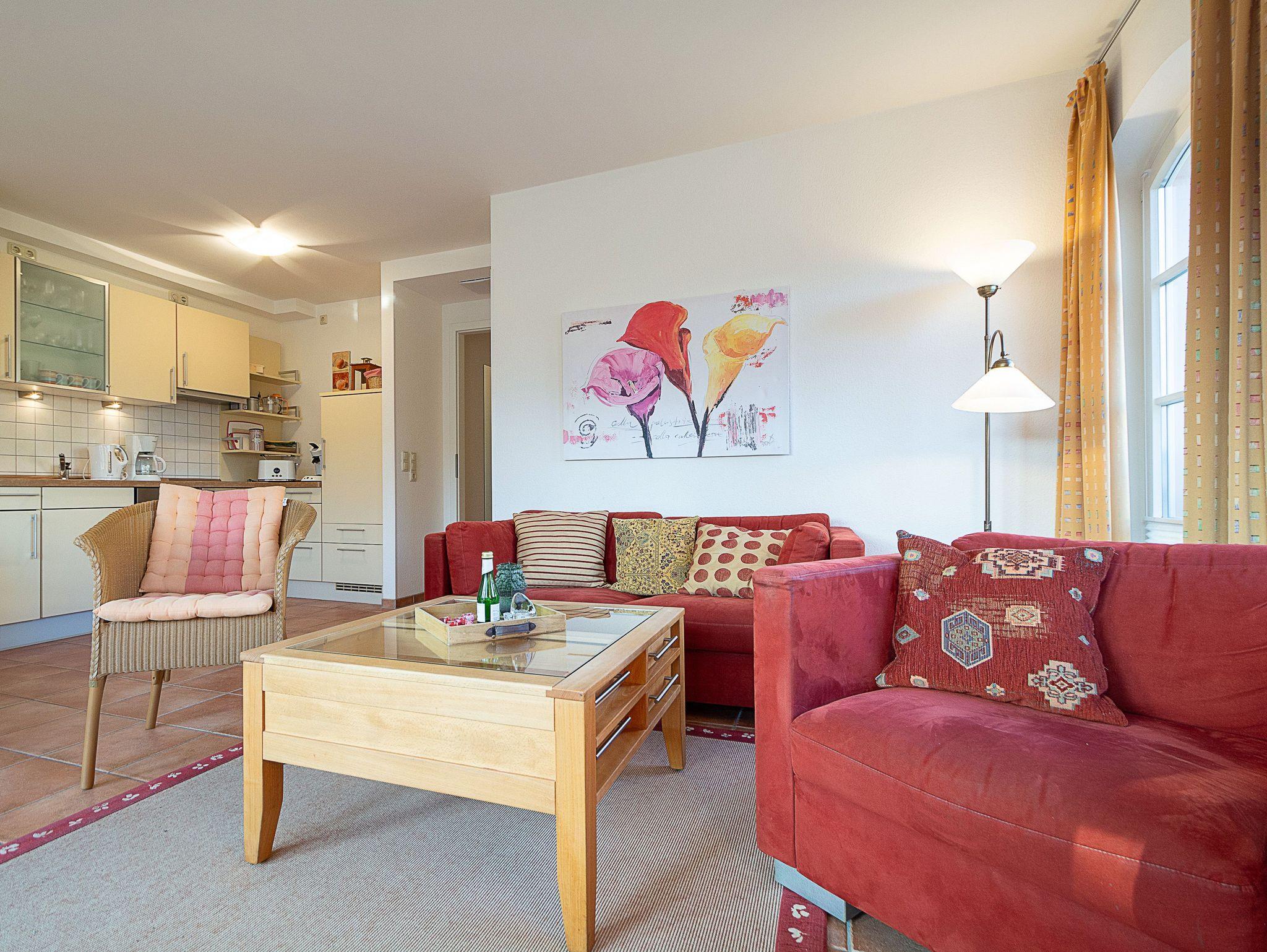 Sie erholen sich in einer liebevoll eingerichteten 3-Raum-Wohnung von ca. 62 m² Größe, die im 1. Obergeschoss liegt. Das Wohnzimmer ist ausgestattet mit Küchenzeile (Herd mit Backofen, Kaffeemaschine, Wasserkocher, Toaster) und TV-Gerät. Der Balkon, auf dem Sie den Tag ausklingen lassen können, erreichen Sie vom Wohnraum aus und geht in Richtung Osten. Zwei Schlafzimmer mit jeweils einem Doppelbett, sowie das Bad mit Dusche und WC vervollständigen das Gesamtbild dieser Wohnung.