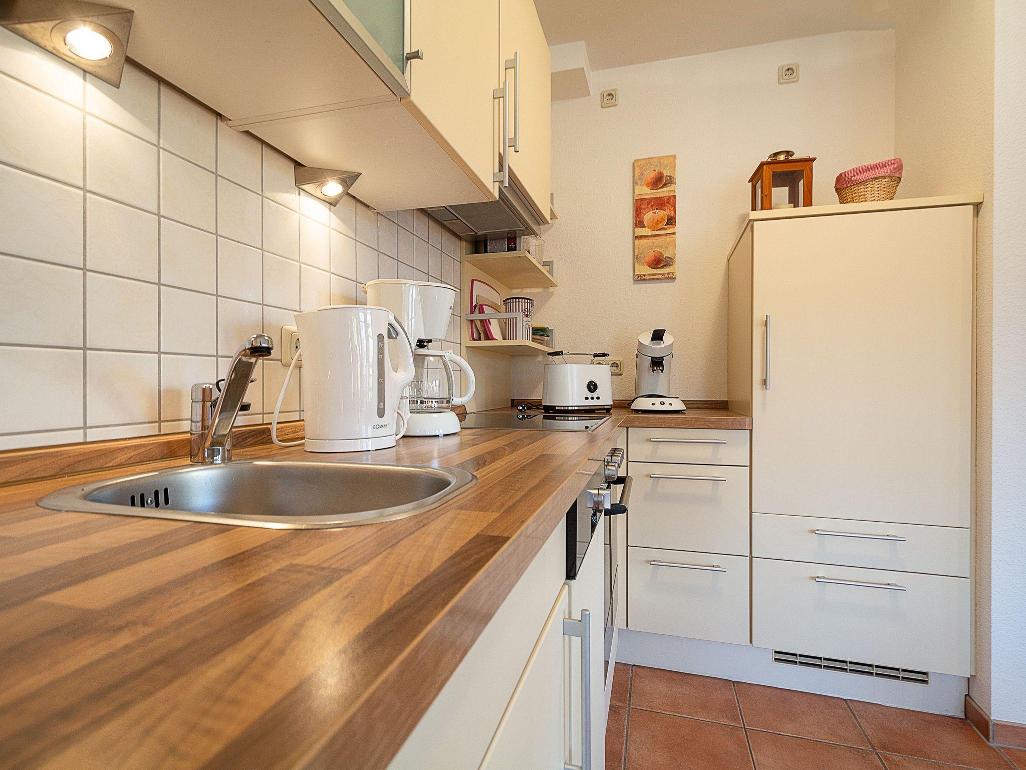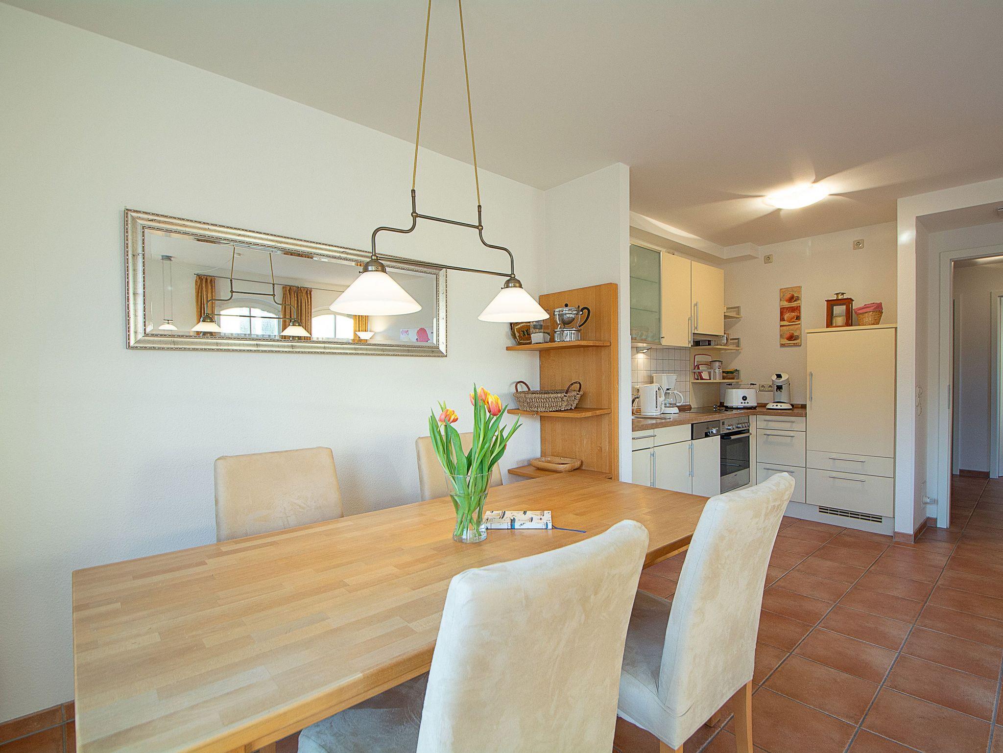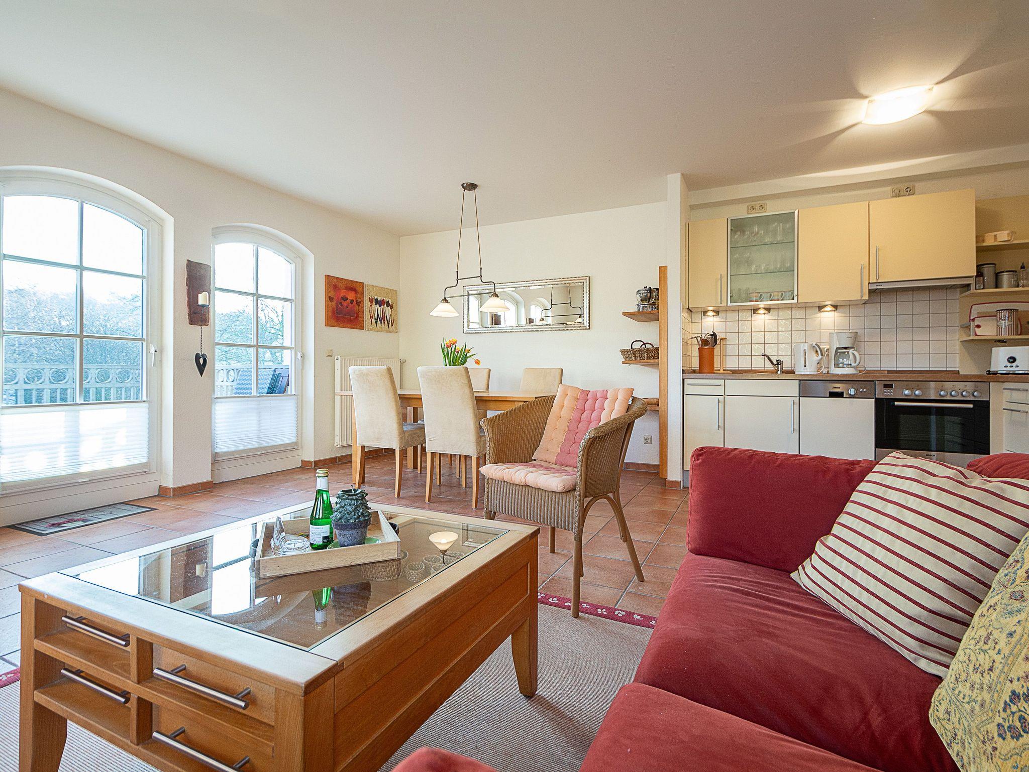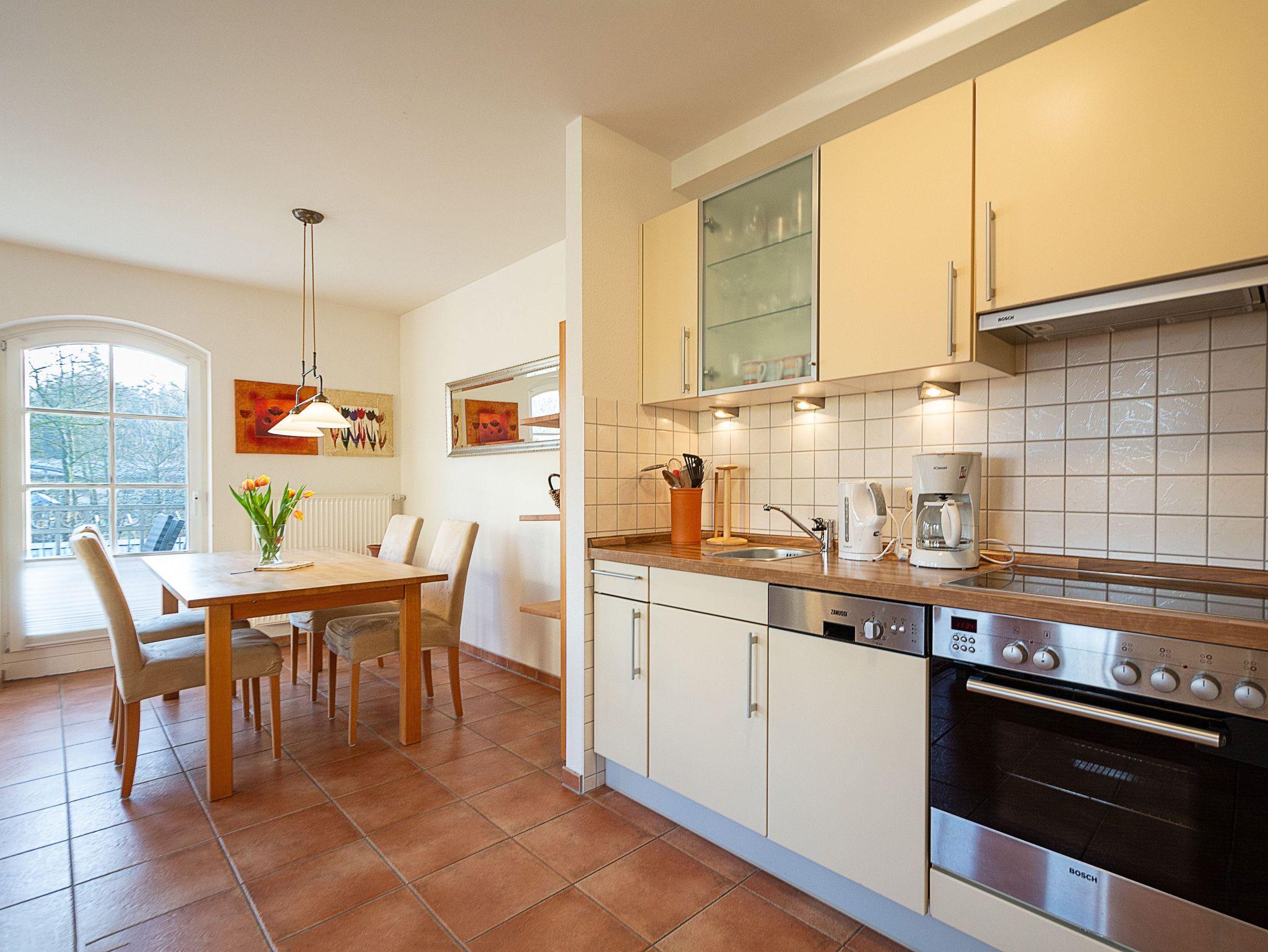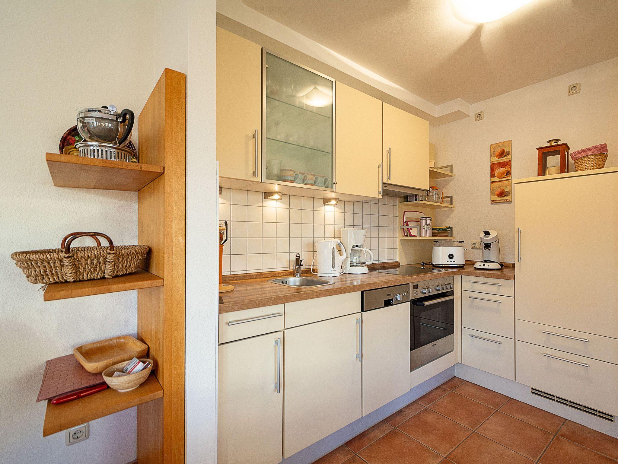 Der offene und lichtdurchflutete Wohnbereich ist mit einer bequemen Couchgarnitur und einem 43-Zoll-Flatscreen-TV eingerichtet. Der angrenzende Essbereich bietet Ihnen reichlich Platz für gemeinsame Mahlzeiten. Die offene Küchenzeile hält für Sie alle wichtigen Küchengeräte und -utensilien bereit, die Sie für Ihr perfektes Dinner benötigen: Ein 4-Zonen-Ceranfeld mit Dunstabzug und Backofen, ein Geschirrspüler sowie ein Kühlschrank mit Gefrierfach befinden sich in der Küche. Eine Kaffeemaschine, ein Wasserkocher und ein Toaster sowie genügend Koch- und Essgeschirr vervollständigen die Kücheneinrichtung. Vom Wohnbereich betreten Sie den nach Osten ausgerichteten Balkon. Von hier können Sie den Tag zum Frühstück in der Morgensonne starten.