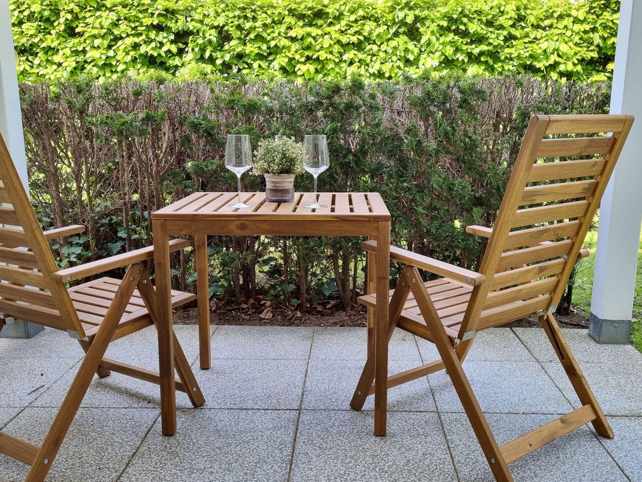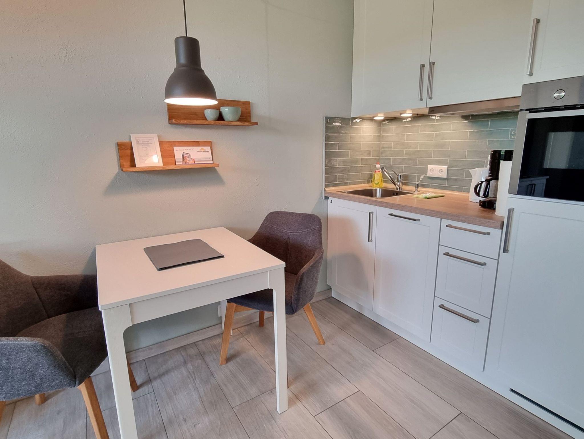 Der Wohnbereich ist mit einem sehr bequemen Sofa (Doppelschlafcouch) und ausziehbarem Esstisch eingerichtet. Zur technischen Ausstattung gehören 2 x TV (Wohnzimmer und Schlafzimmer) und es steht Ihnen ein kostenfreier W-LAN Zugang zur Verfügung. Im Wohnbereich ist eine Pantryküche mit Kühlschrank und Gefrierfach, Geschirrspüler, separatem Induktionskochfeld, Dunstabzugshaube, Kombigerät Backofen/Mikrowelle, Toaster, Wasserkocher und Kaffeemaschine integriert. Ein neues Bad/WC mit Dusche, Handtuchheizkörper und Haarfön ergänzt die Ferienwohnung. Die Wohnung verfügt über eine überdachte Terrasse mit Tisch und 4 Stühlen zur Westseite und lädt zum Entspannen ein.[nbsp][nbsp]