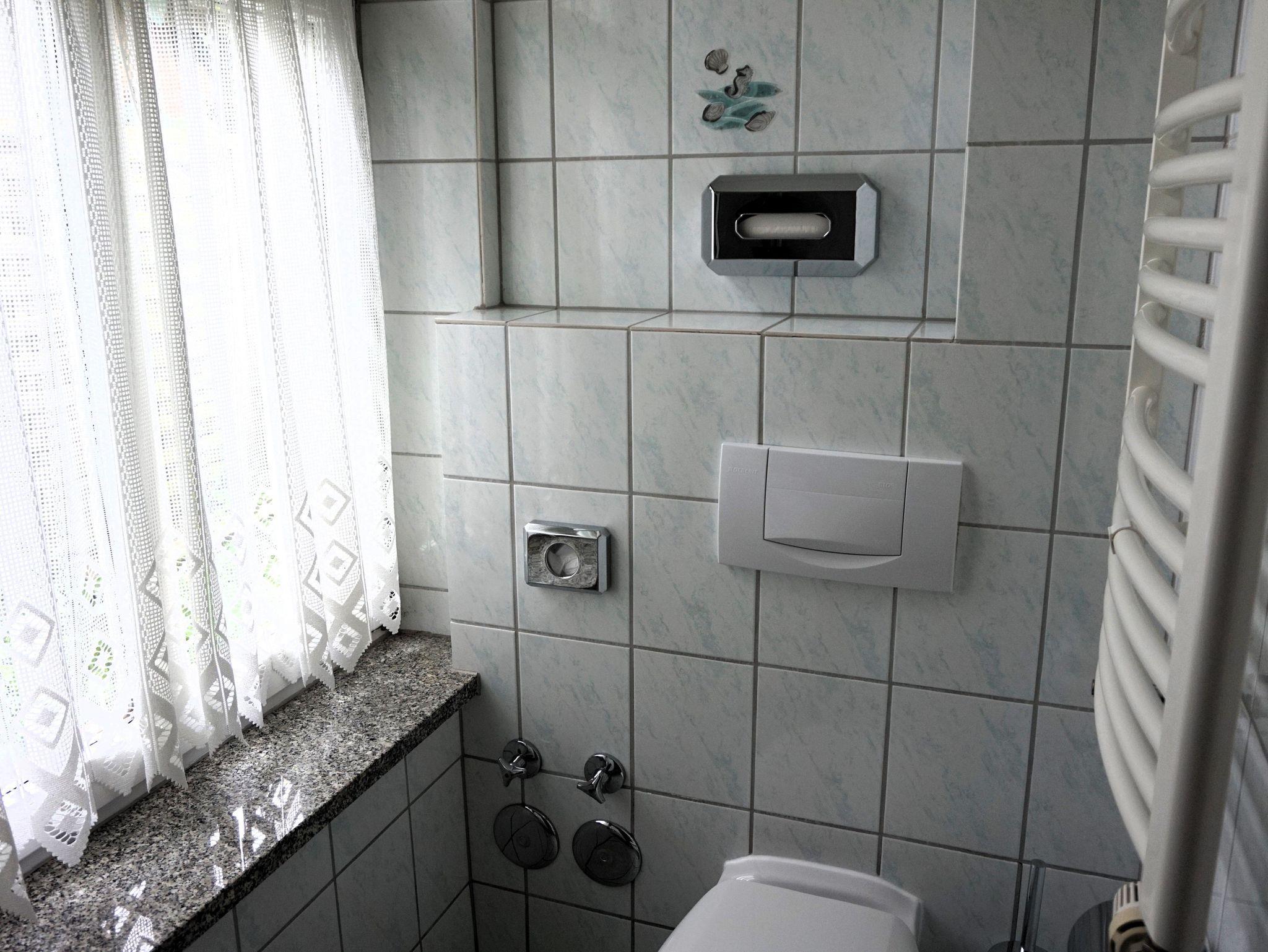 Die funktional gestaltete Ferienwohnung im Erdgeschoss hat ein Wohnzimmer mit Essecke für 4 Personen, eine kleine Küche, ein Schlafzimmer mit Doppelbett, ein Gästezimmer mit Boxspringbett und eine Terrasse. Die kleine Küche ist mit 4-Platten-Ceranfeld, Backofen, Kühlschrank mit Gefrierfach, Mikrowelle, Geschirrspüler, Kaffeemaschine und div. Geschirr ausgestattet. Ein Bad mit Fenster, Dusche, Waschbecken und WC komplettieren den guten Gesamteindruck der Wohnung.