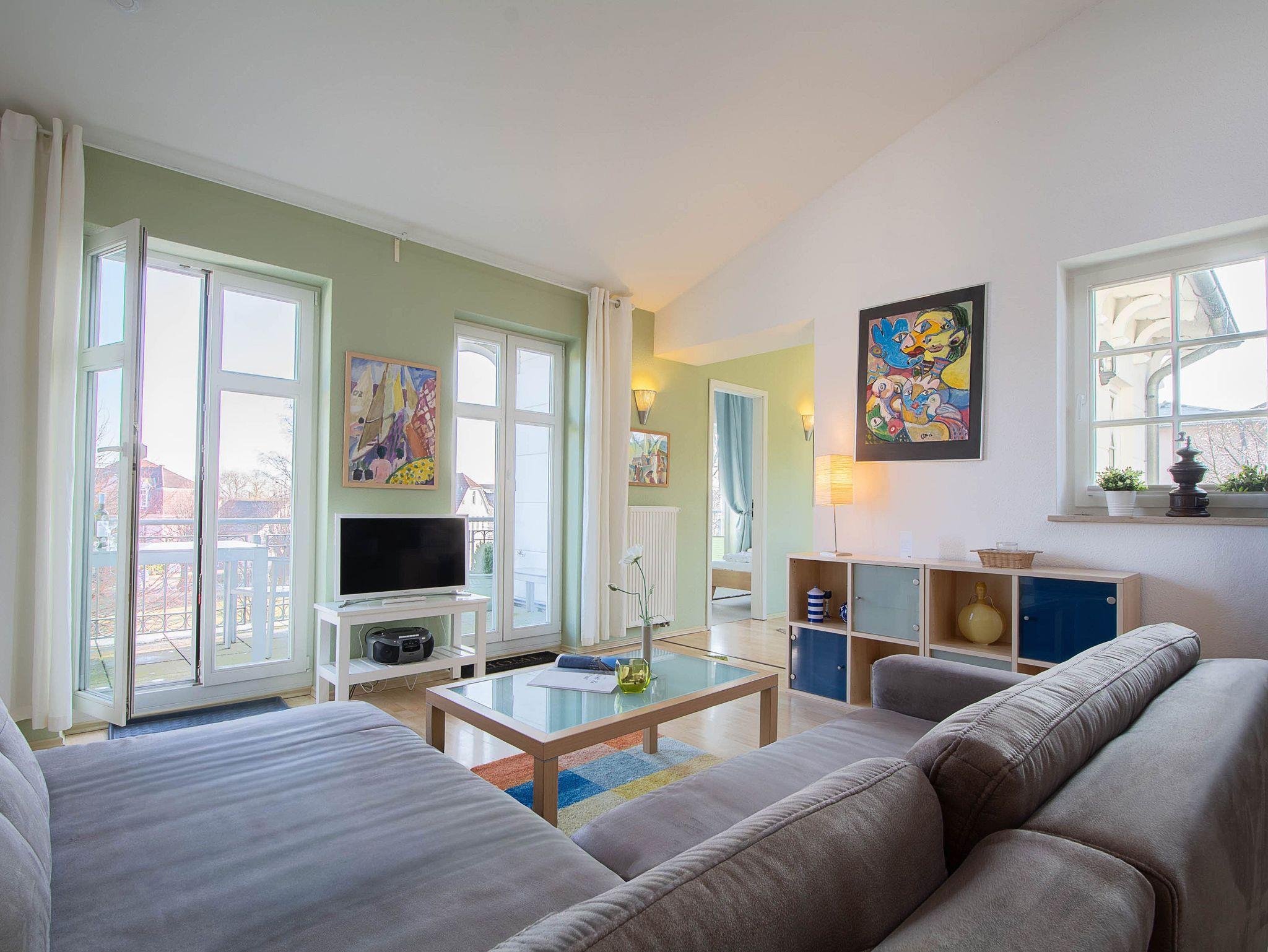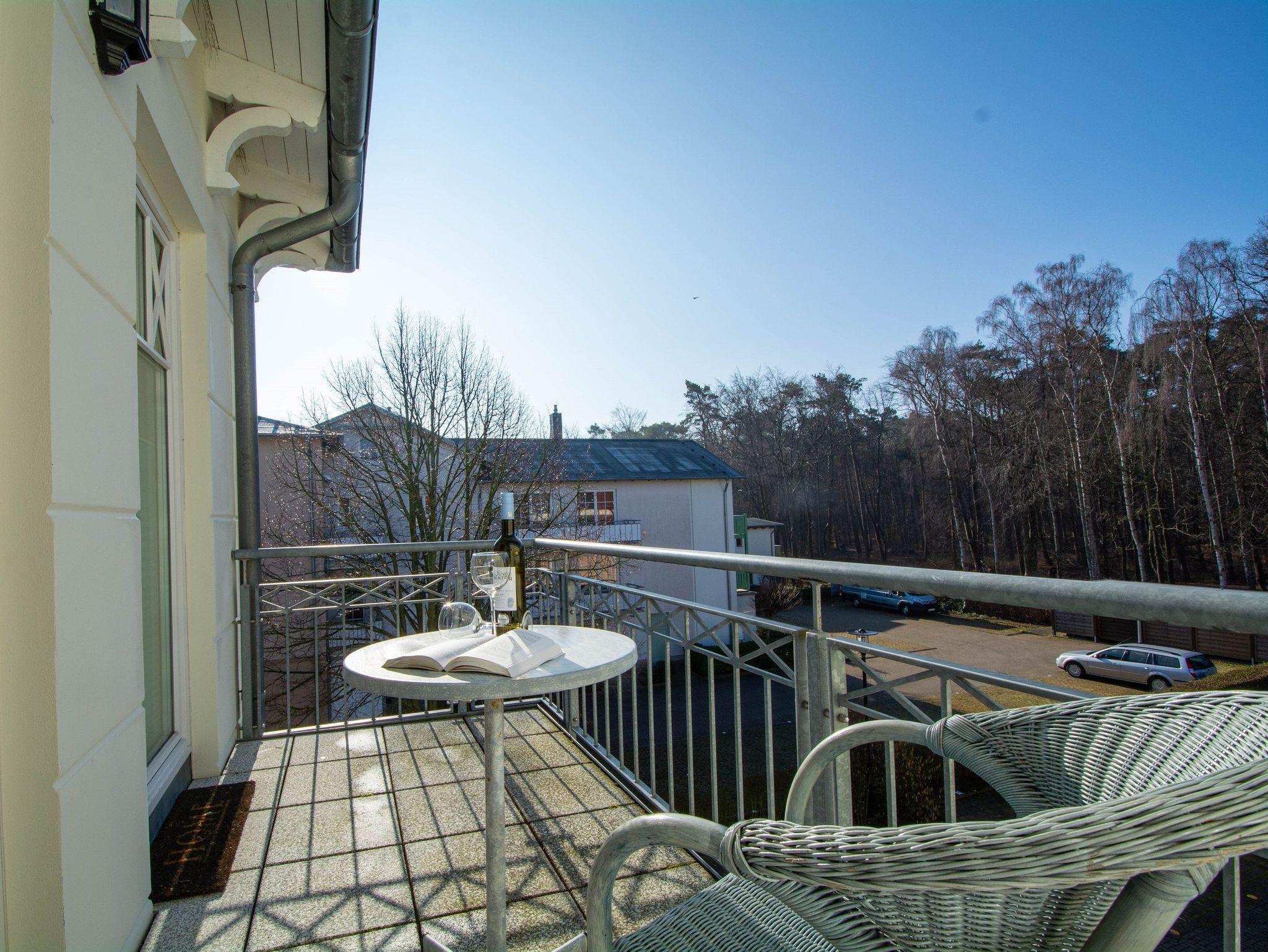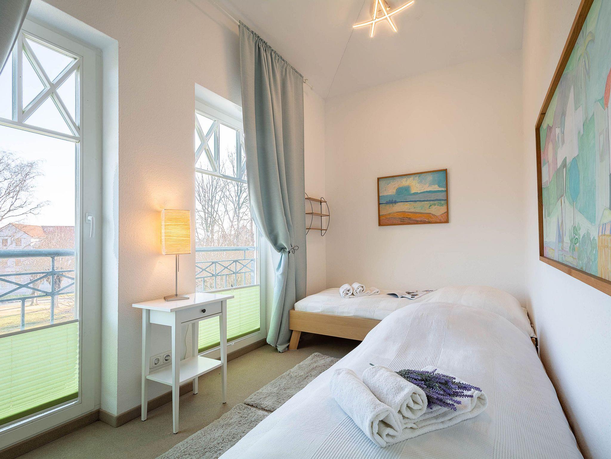Sie erholen sich in einer wunderschönen 3-Raum-Wohnung von ca. 60 qm Größe, die sich im zweiten Obergeschoss der Villa Seeadler befindet. Der Wohnbereich ist ausgestattet mit Küchenzeile (Herd mit Backofen, Geschirrspüler, Kaffeemaschine, Mikrowelle, Wasserkocher), bequemer Sitzgruppe, Essecke und TV-Gerät. Die Wohnung verfügt über zwei Balkone, die vom Wohnbereich aus betreten werden können. Vom Balkon in Richtung Norden genießen Sie den Blick auf den Lindenpark. Der zweite Balkon zeigt in Richtung Süden und gibt den Blick auf den Stadtwald frei. Ein Schlafzimmer mit Doppelbett (160cm x 200 cm) und ein Schlafzimmer mit 2 Einzelbetten sowie das Bad mit Dusche und WC vervollständigen das Gesamtbild dieser Wohnung.