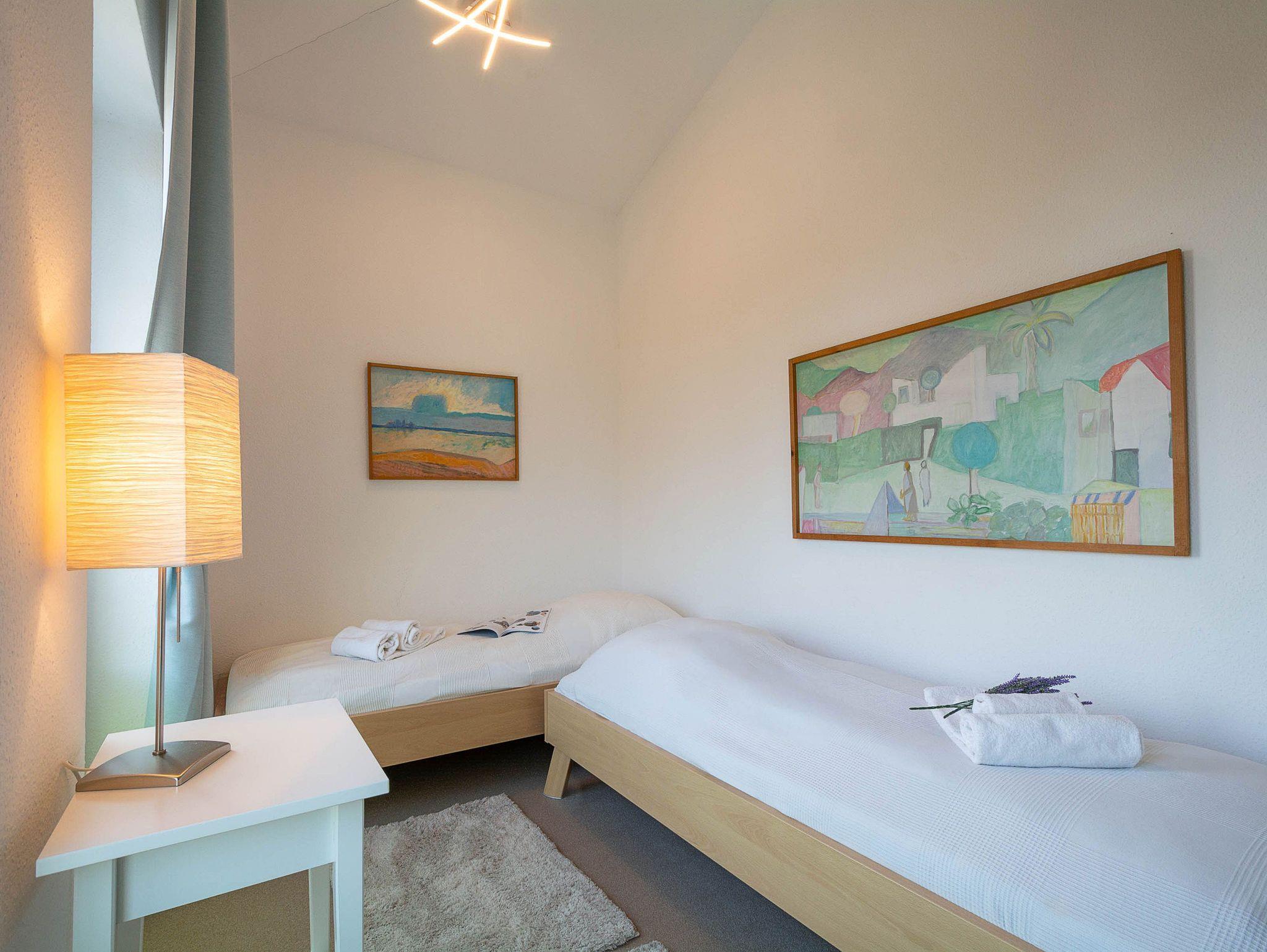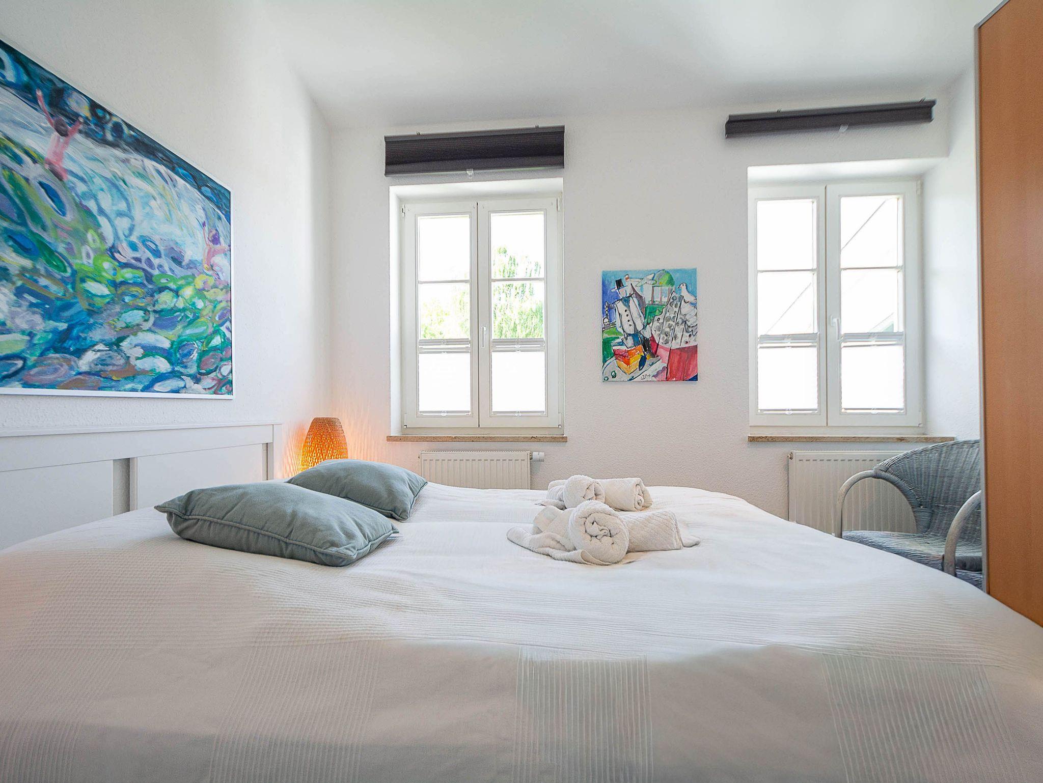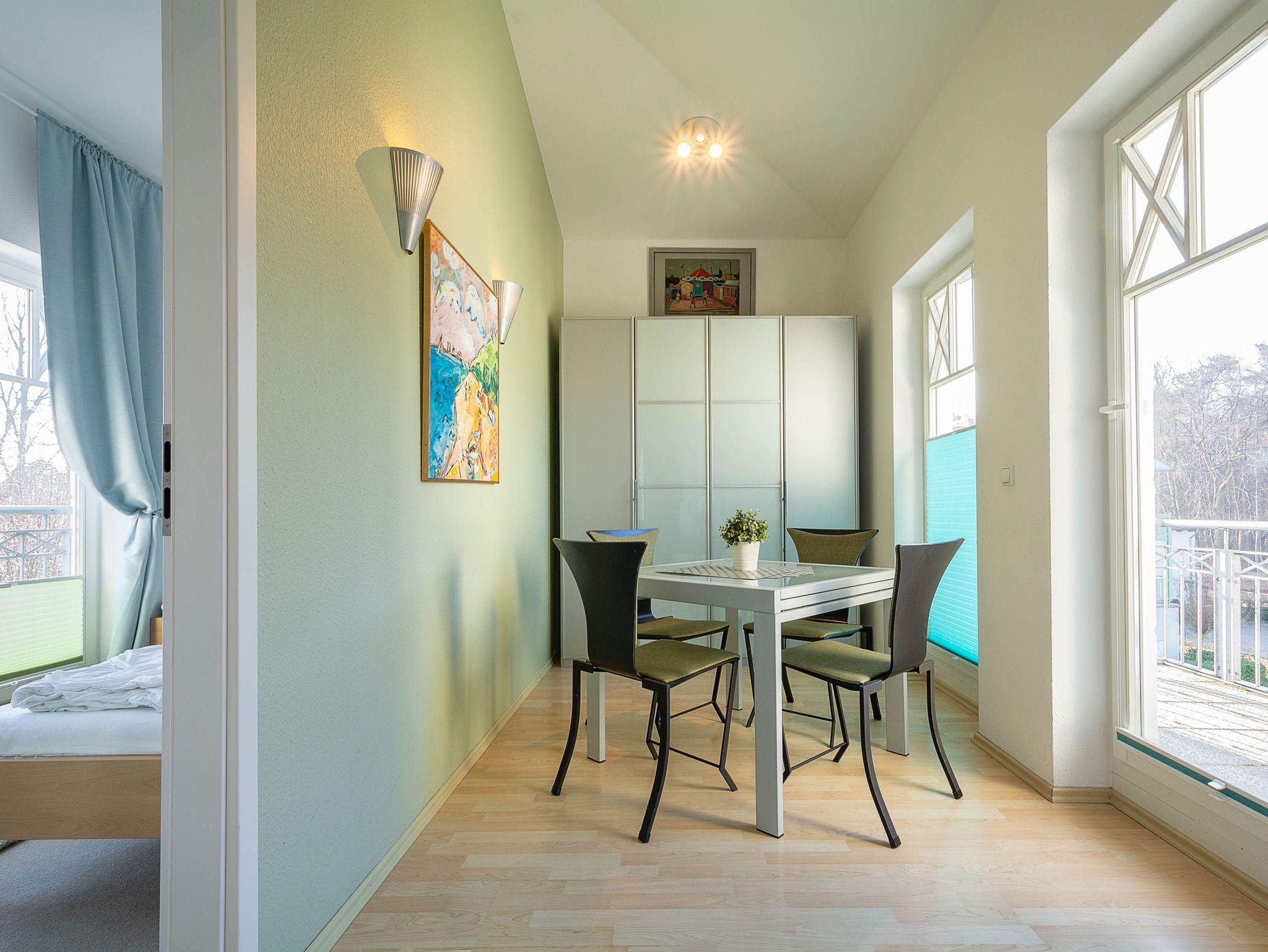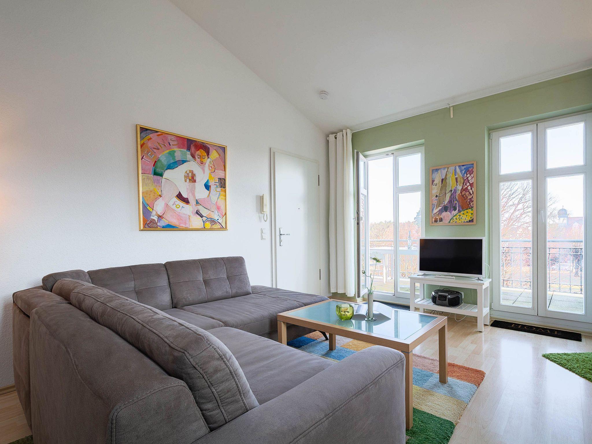 Sie erholen sich in einer wunderschönen 3-Raum-Wohnung von ca. 60 qm Größe, die sich im zweiten Obergeschoss der Villa Seeadler befindet. Der Wohnbereich ist ausgestattet mit Küchenzeile (Herd mit Backofen, Geschirrspüler, Kaffeemaschine, Mikrowelle, Wasserkocher), bequemer Sitzgruppe, Essecke und TV-Gerät. Die Wohnung verfügt über zwei Balkone, die vom Wohnbereich aus betreten werden können. Vom Balkon in Richtung Norden genießen Sie den Blick auf den Lindenpark. Der zweite Balkon zeigt in Richtung Süden und gibt den Blick auf den Stadtwald frei. Ein Schlafzimmer mit Doppelbett (160cm x 200 cm) und ein Schlafzimmer mit 2 Einzelbetten sowie das Bad mit Dusche und WC vervollständigen das Gesamtbild dieser Wohnung.
