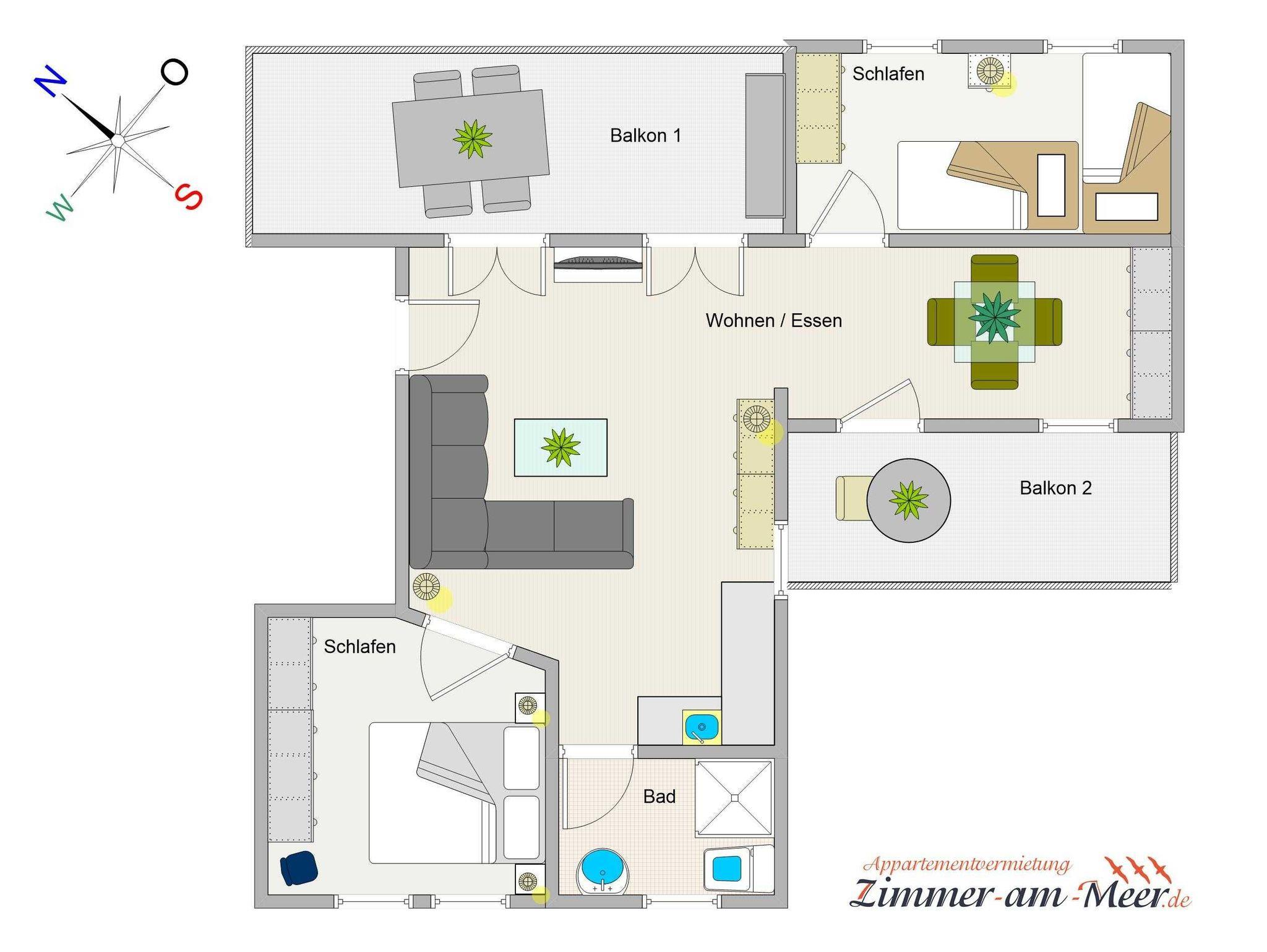 Die hellen freundlichen 2- bis 3-Raum-Ferienwohnungen sind für 2 bis 4 Personen eingerichtet, verfügen über einen Balkon oder eine Terrasse und sind mit einem gefliesten Tageslichtbad ausgestattet.