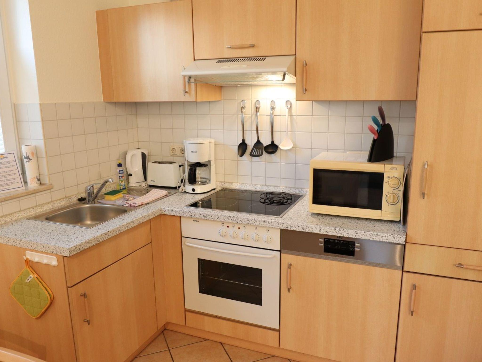 Die moderne Küche ist im Wohnbereich integriert und voll ausgestattet mit einem Ceranherd mit Backofen, Mikrowelle, Geschirrspüler und Kühlschrank.