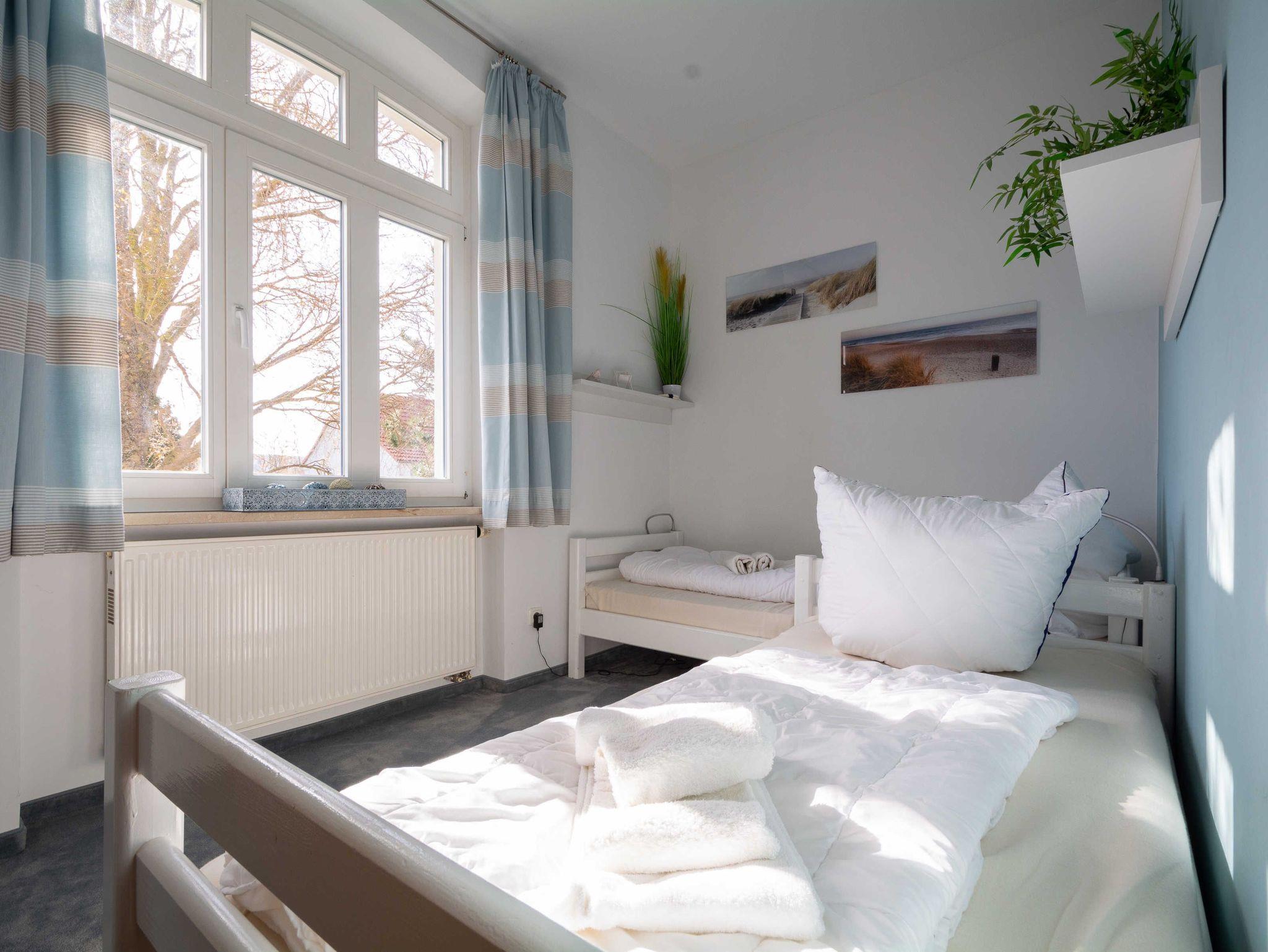 Das erste Schlafzimmer bietet Ihnen ein gemütliches Doppelbett (2 x 90cm x 200cm), einen Kleiderschrank mit Ganzkörperspiegel sowie einen Zugang zum Süd-Balkon, auf dem Sie bei Abendsonne den Tag ausklingen lassen können. Das zweite Schlafzimmer ist ebenfalls mit einem Kleiderschrank mit Ganzkörperspiegel ausgestattet und bietet mit 2 Einzelbetten (je 90cm Matratzenbreite) Platz für 2 weitere Personen. Das geflieste Tageslichtbad mit Dusche und WC vervollständigt das Gesamtbild dieser liebevoll eingerichteten Ferienwohnung.