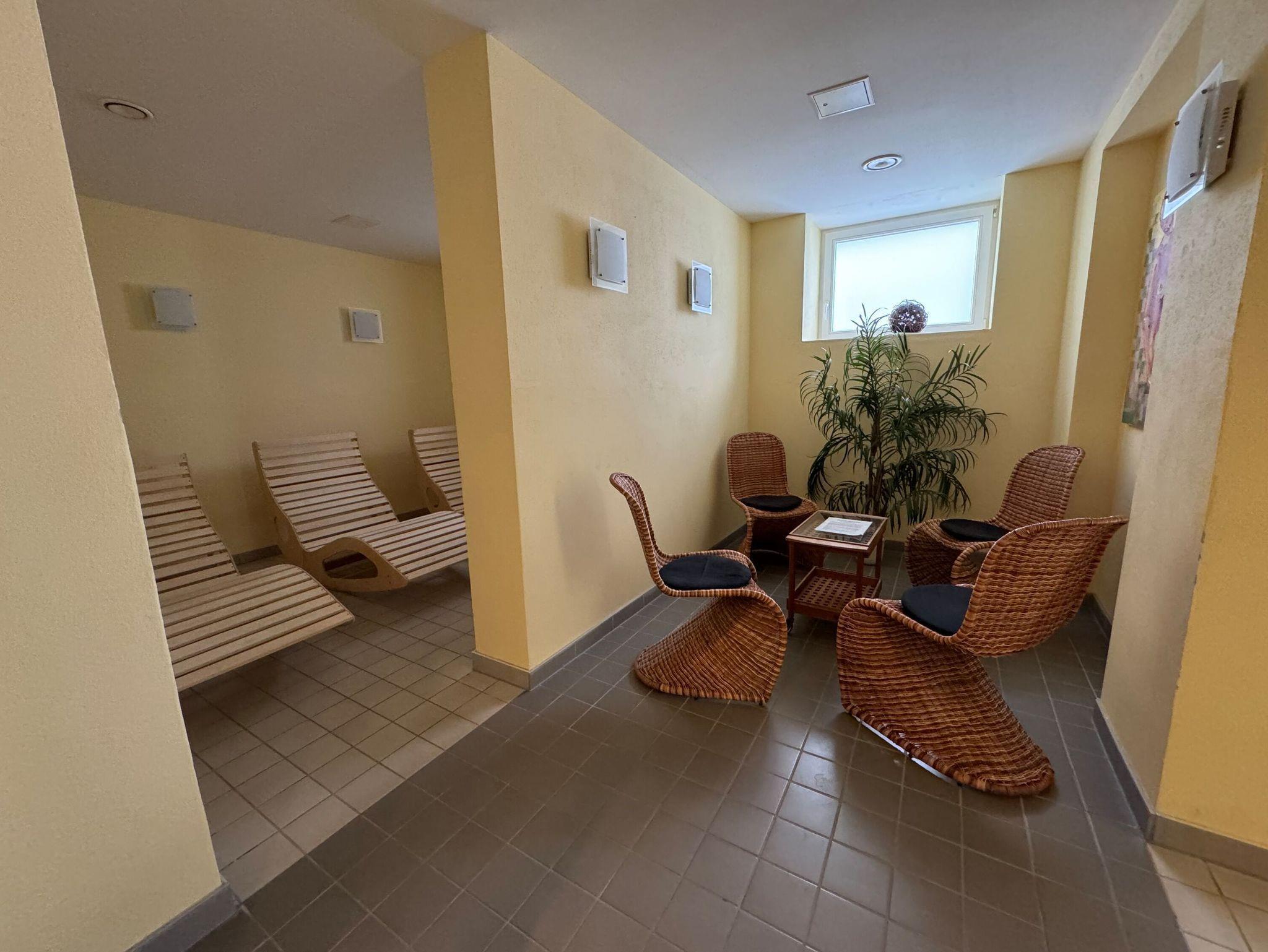 Im Wohnbereich stehen ihnen die Couch sowie ein gemütlicher Sessel als Sitzgelegenheit zur Verfügung.