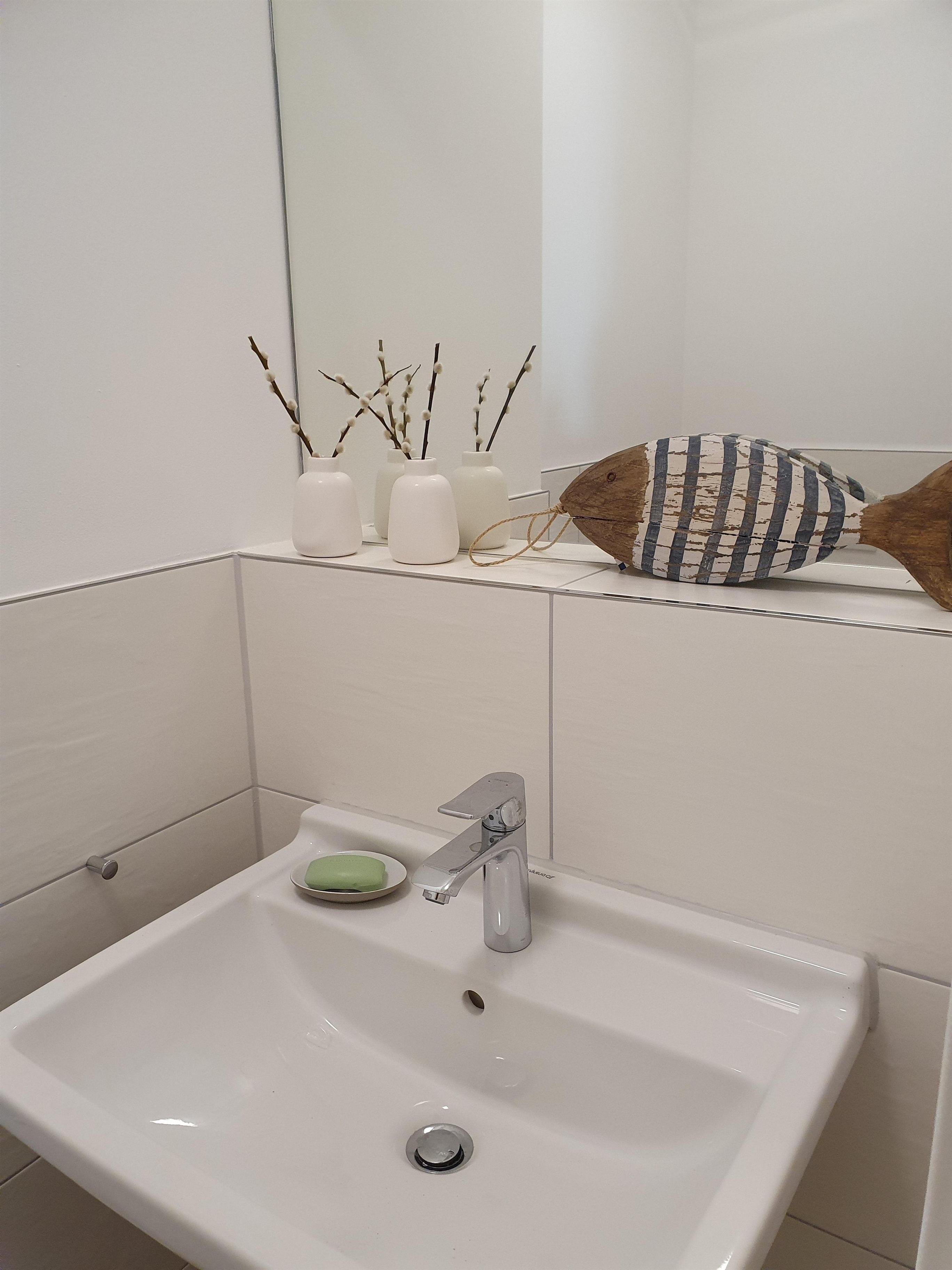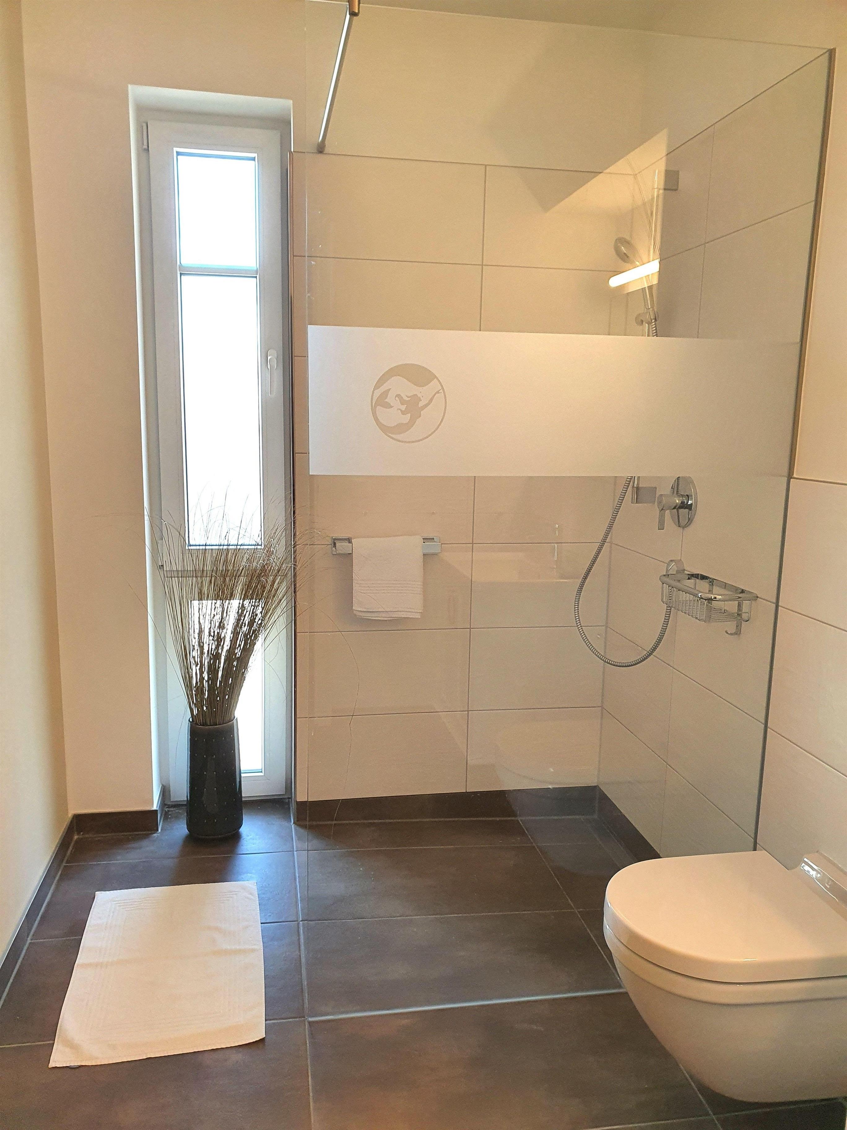 Die Wohnung verfügt über ein modern eingerichtetes Badezimmer mit großzügiger Dusche und WC sowie über ein separates Gäste-WC.