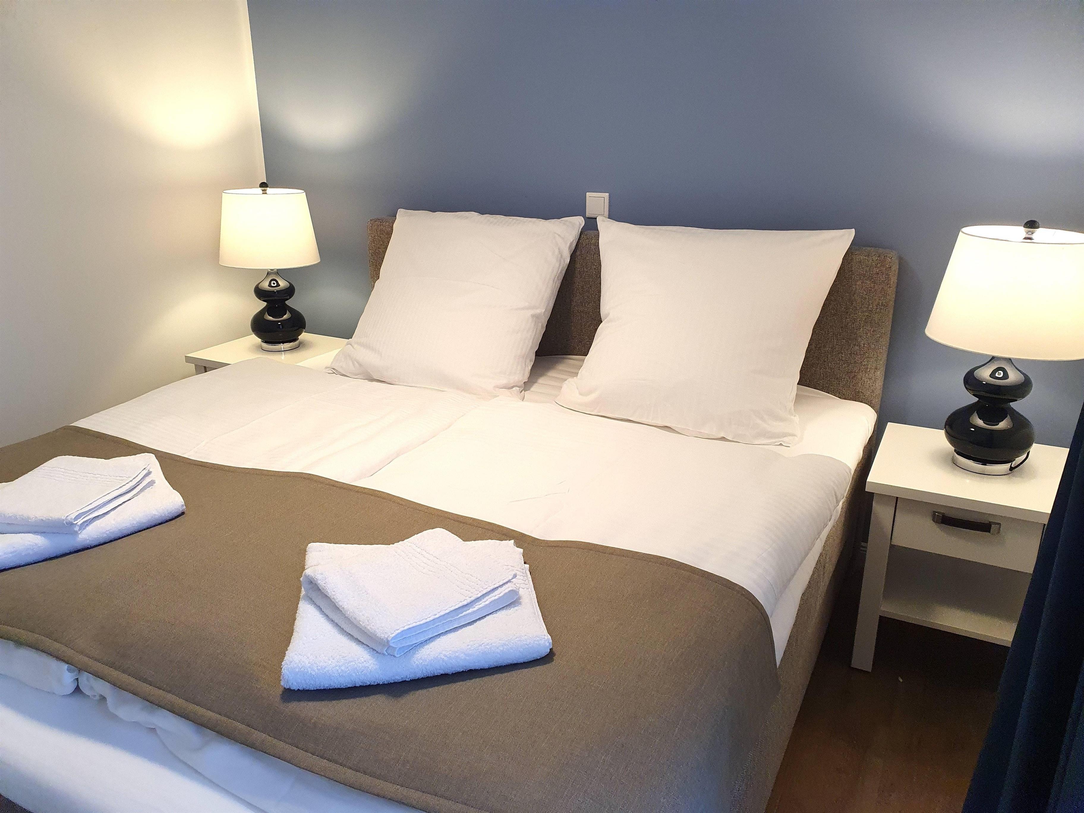 Beide Schlafzimmer sind mit einem großen, bequemen Boxspringbett (1,80 m Breite) für zwei Personen und einem geräumigen Kleiderschrank mit vielen Ablagemöglichkeiten für Ihre Garderobe eingerichtet.