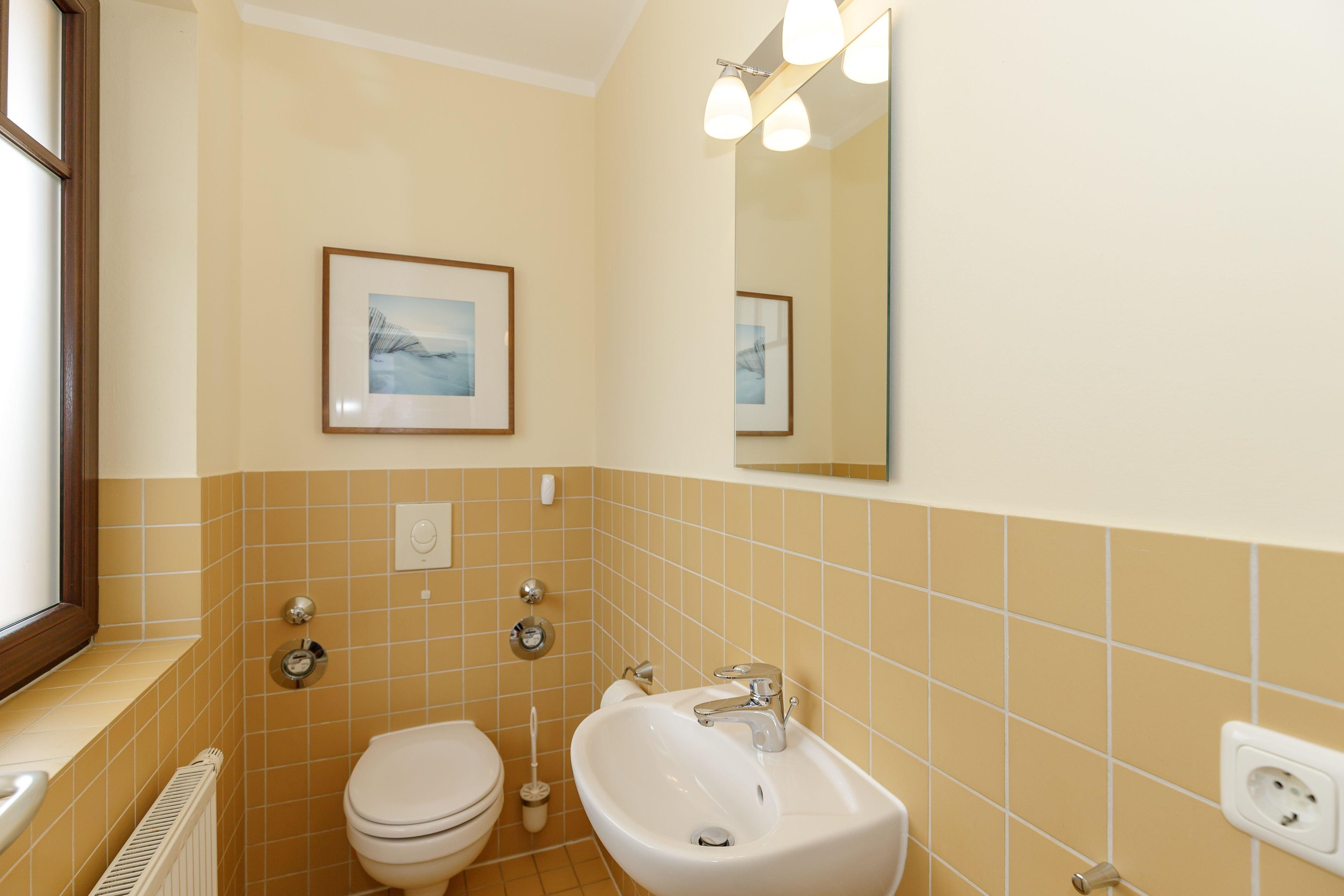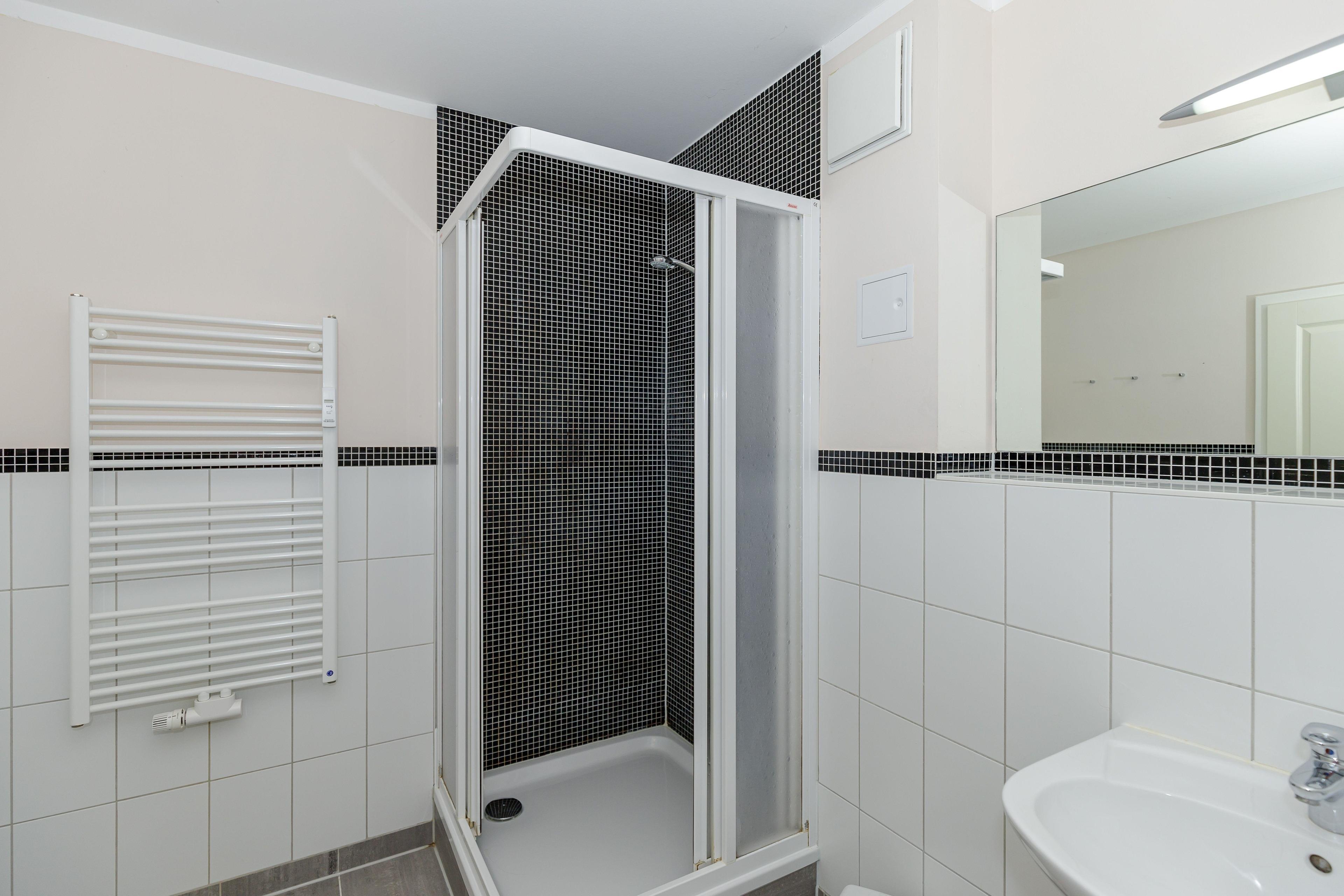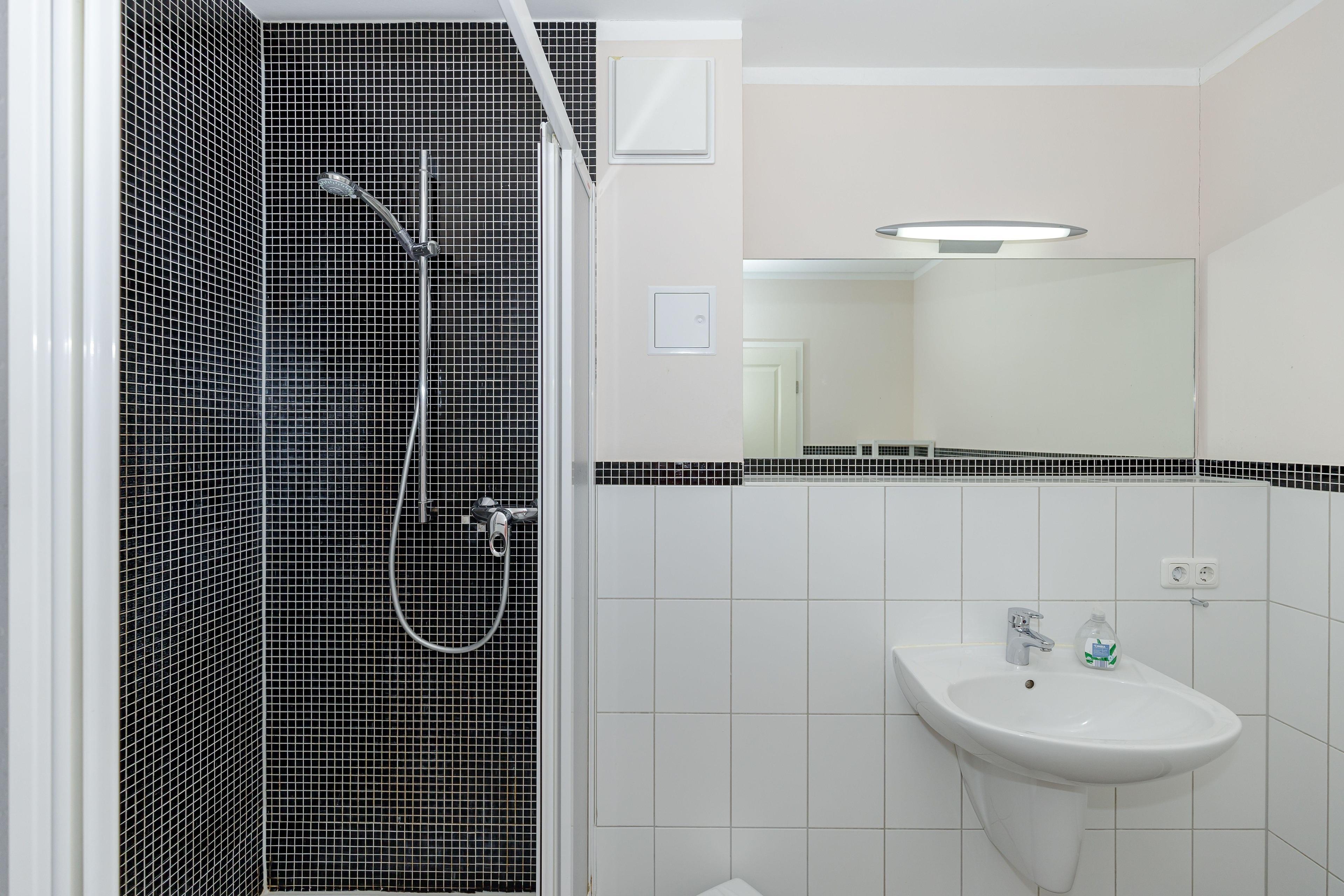 Die Wohnung verfügt über ein Badezimmer mit Dusche. Damit sich niemand in die Quere kommt, ist ein separates WC mit Waschbecken vorhanden.